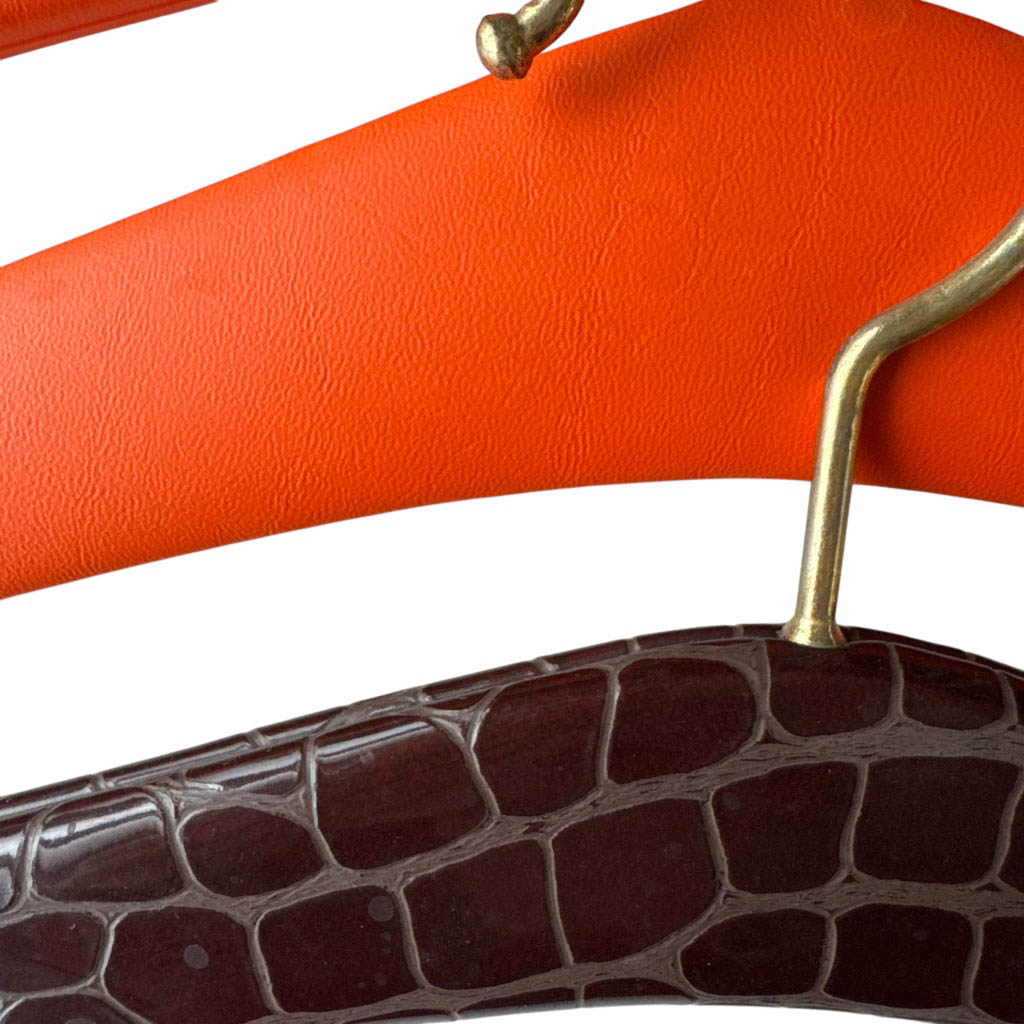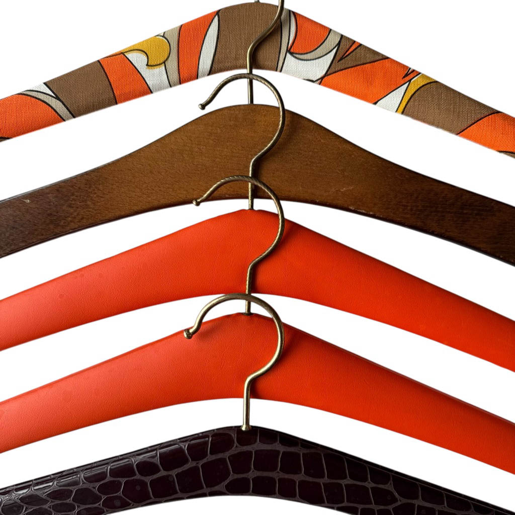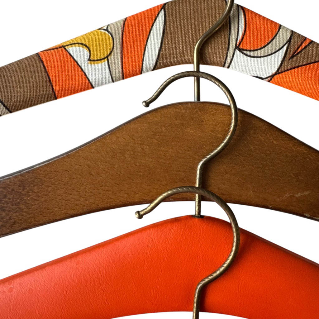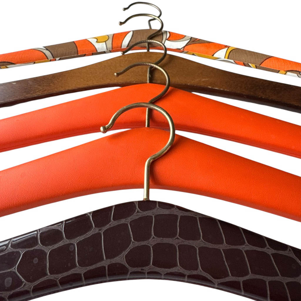 5 cintres 50s oranges Elephant Paris Vintage Cintres vintages des années 1 9 5 0, bois habillé de vinyl, Taille unique, très bon état général Accessoires très sympas pour harmoniser et rendre glamour l’habillage d’un dressing ou d’un vestiaire public ou privé