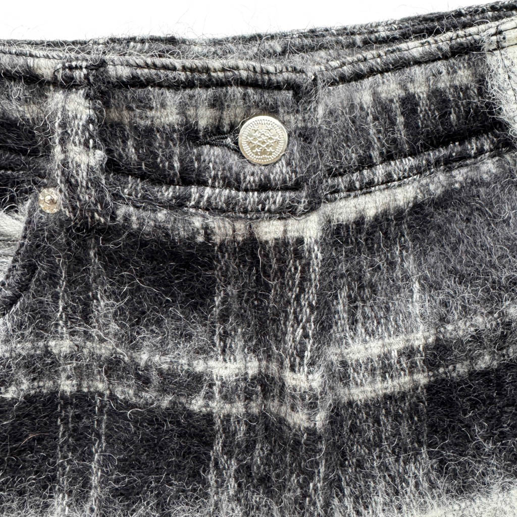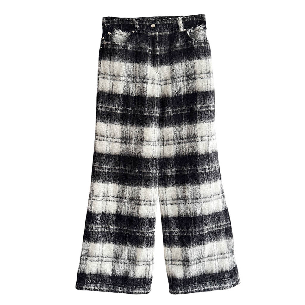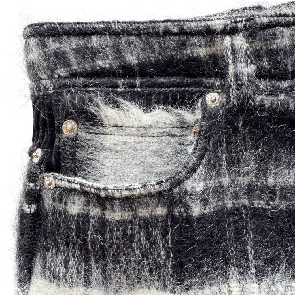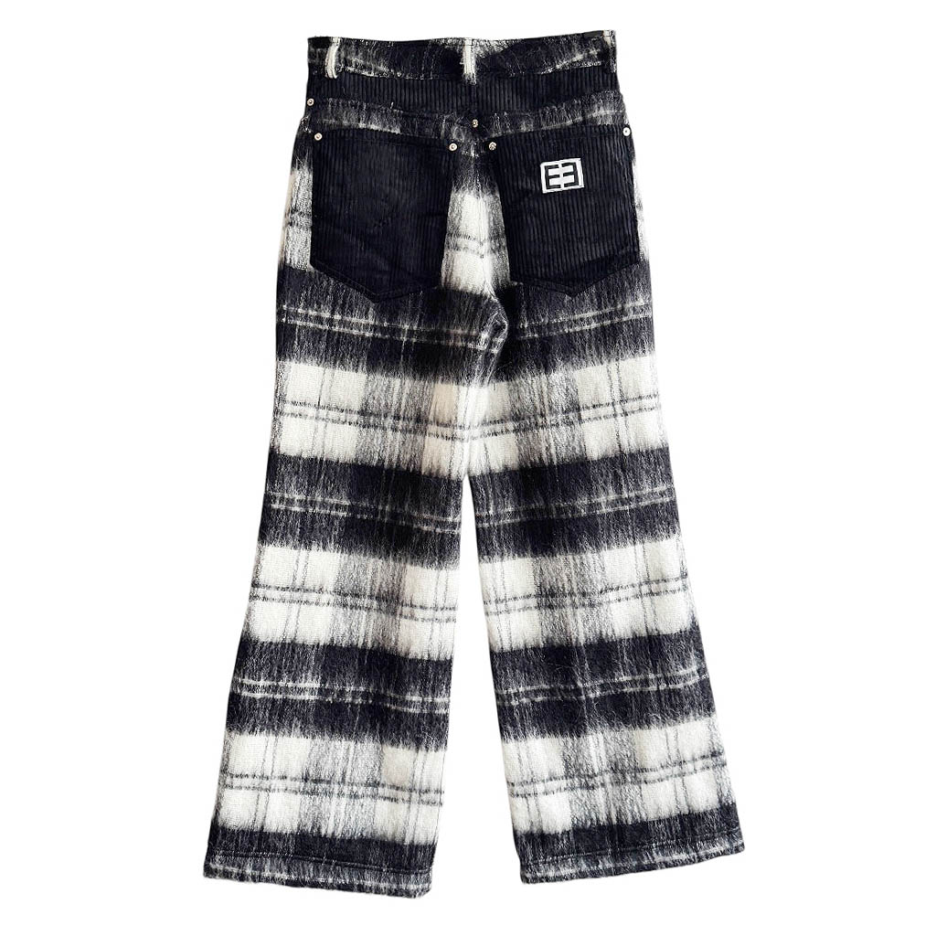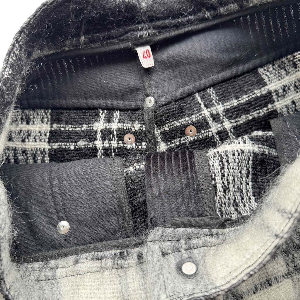 6 Poches flare Vegas Mohair noir et blanc Elephant Paris Design Ce pantalon Elephant Paris est une pièce unique, entièrement conçue et fabriquée à Paris à partir de matériaux anciens d’exception.Son tissu principal, un Tartan fin et léger en pure laine mohair et de velours de coton côtelé, provient d’un stock neuf d’époque des années 1 9 8 0. Le zip est lui aussi vintage neuf d’époque des années 1 9 7 0, il complète ce design au charme intemporel. La taille structure la silhouette, tandis que les quatre poches à l’avant et les deux poches plaquées au dos apportent une allure soignée et pratique.Les finitions sont gansées au…