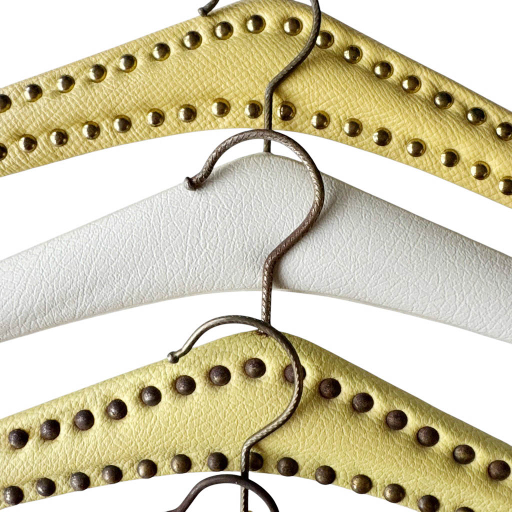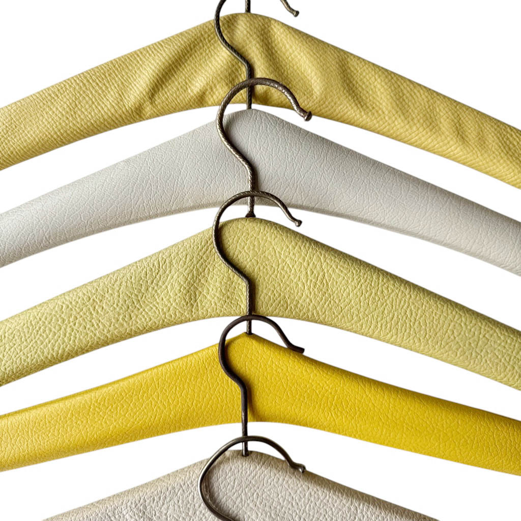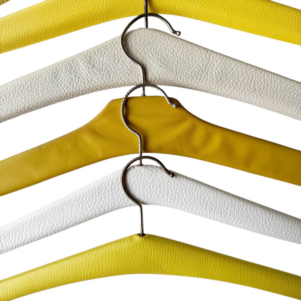 8 cintres 50s Jaunes et blancs Elephant Paris Vintage Huit cintres vintages des années 1 9 5 0, bois habillé de vinyl, cloutés pour certains en métal doré, Taille unique, très bon état général Accessoires très sympas pour harmoniser et rendre glamour l’habillage d’un dressing ou d’un vestiaire public ou privé