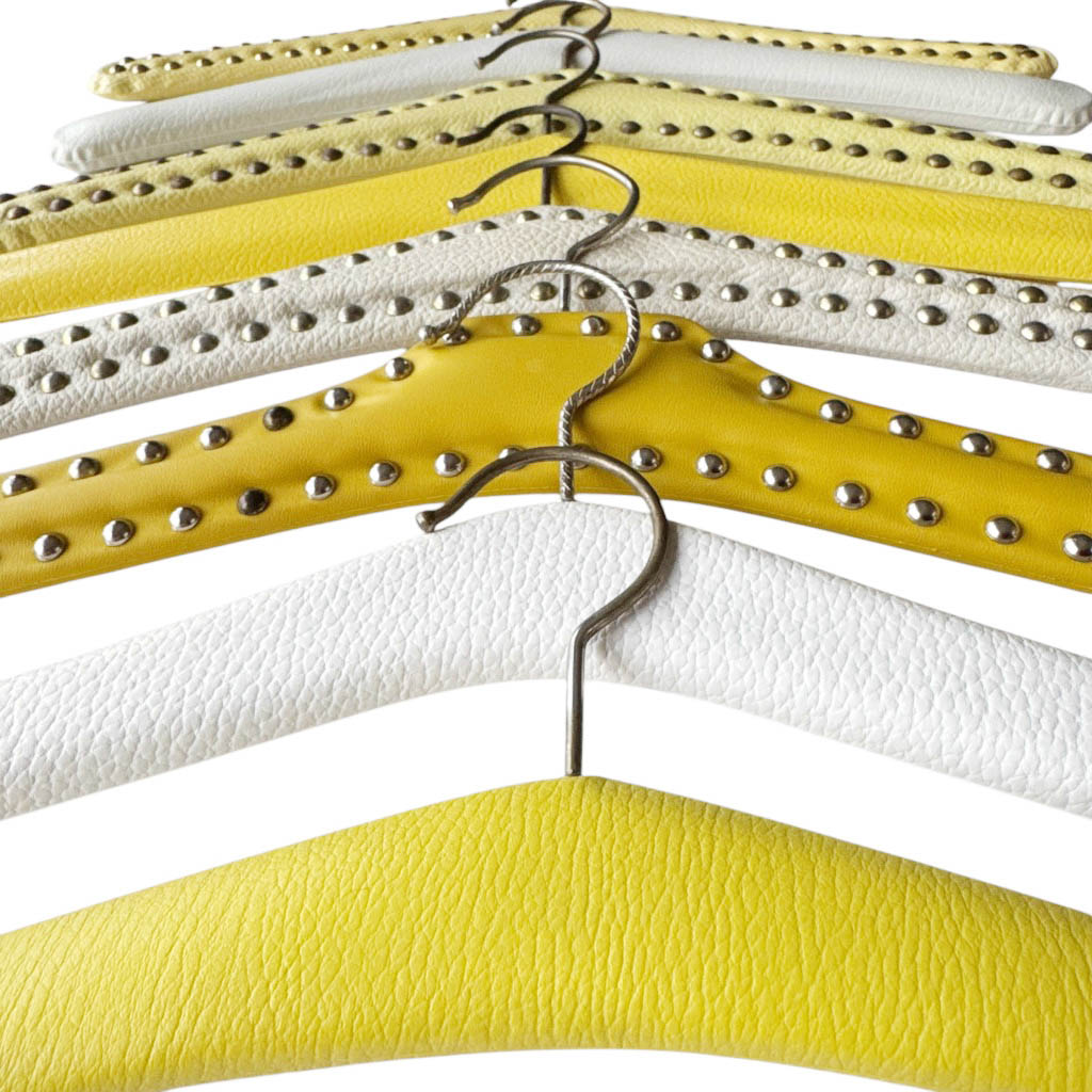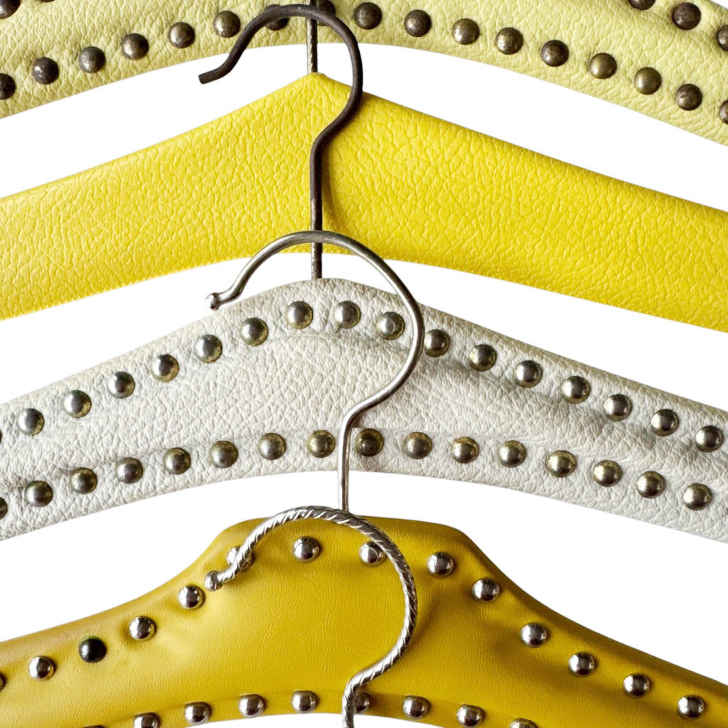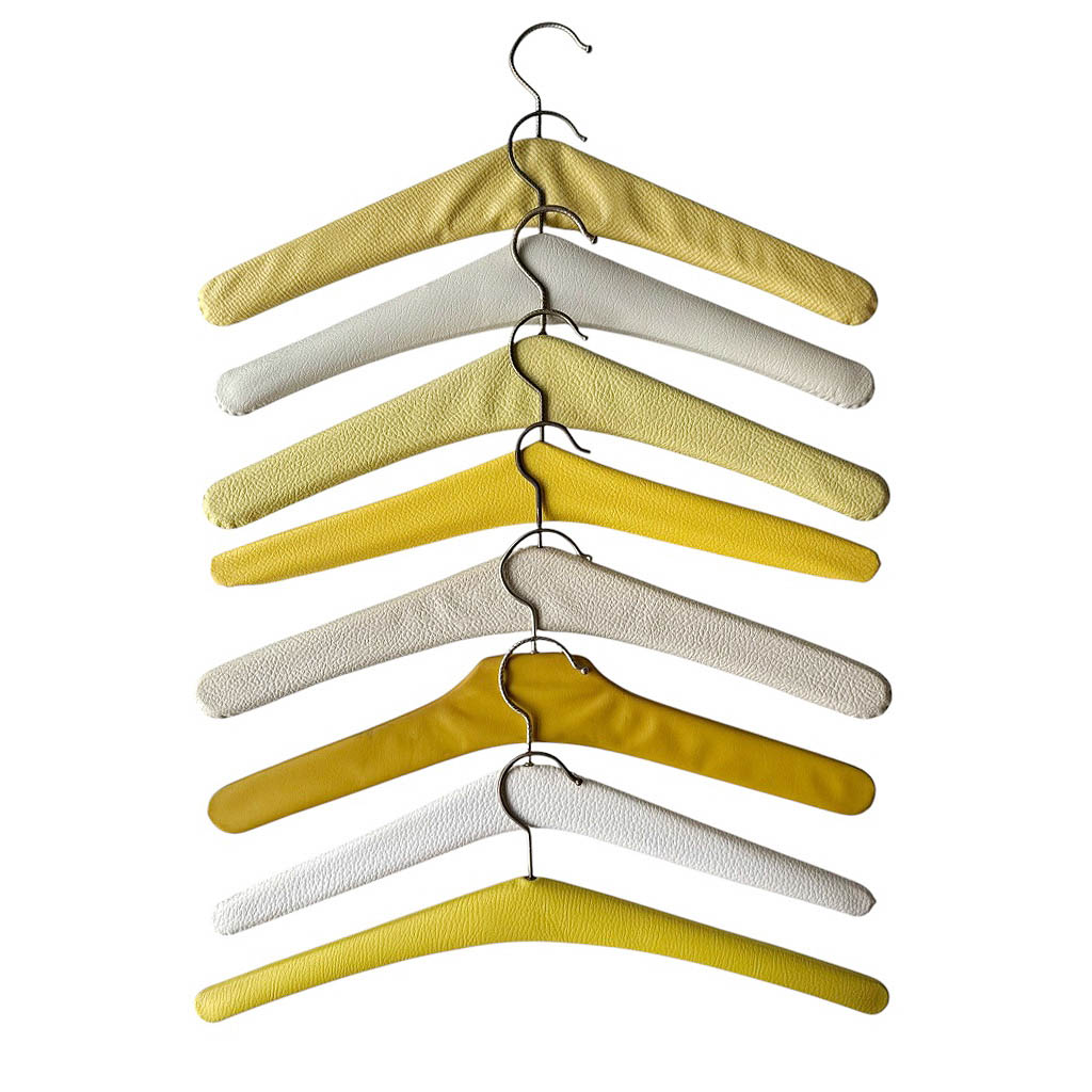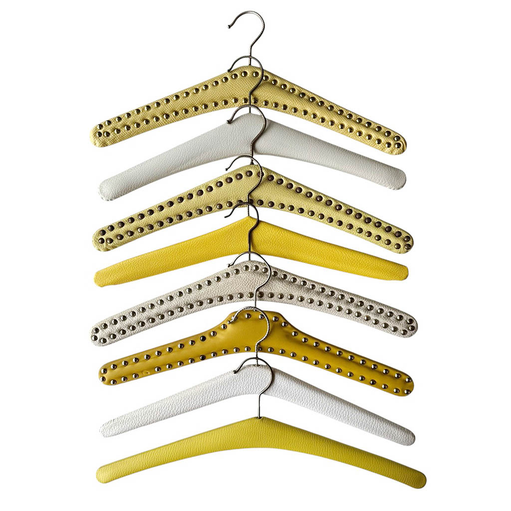 8 cintres 50s Jaunes et blancs Elephant Paris Vintage Huit cintres vintages des années 1 9 5 0, bois habillé de vinyl, cloutés pour certains en métal doré, Taille unique, très bon état général Accessoires très sympas pour harmoniser et rendre glamour l’habillage d’un dressing ou d’un vestiaire public ou privé