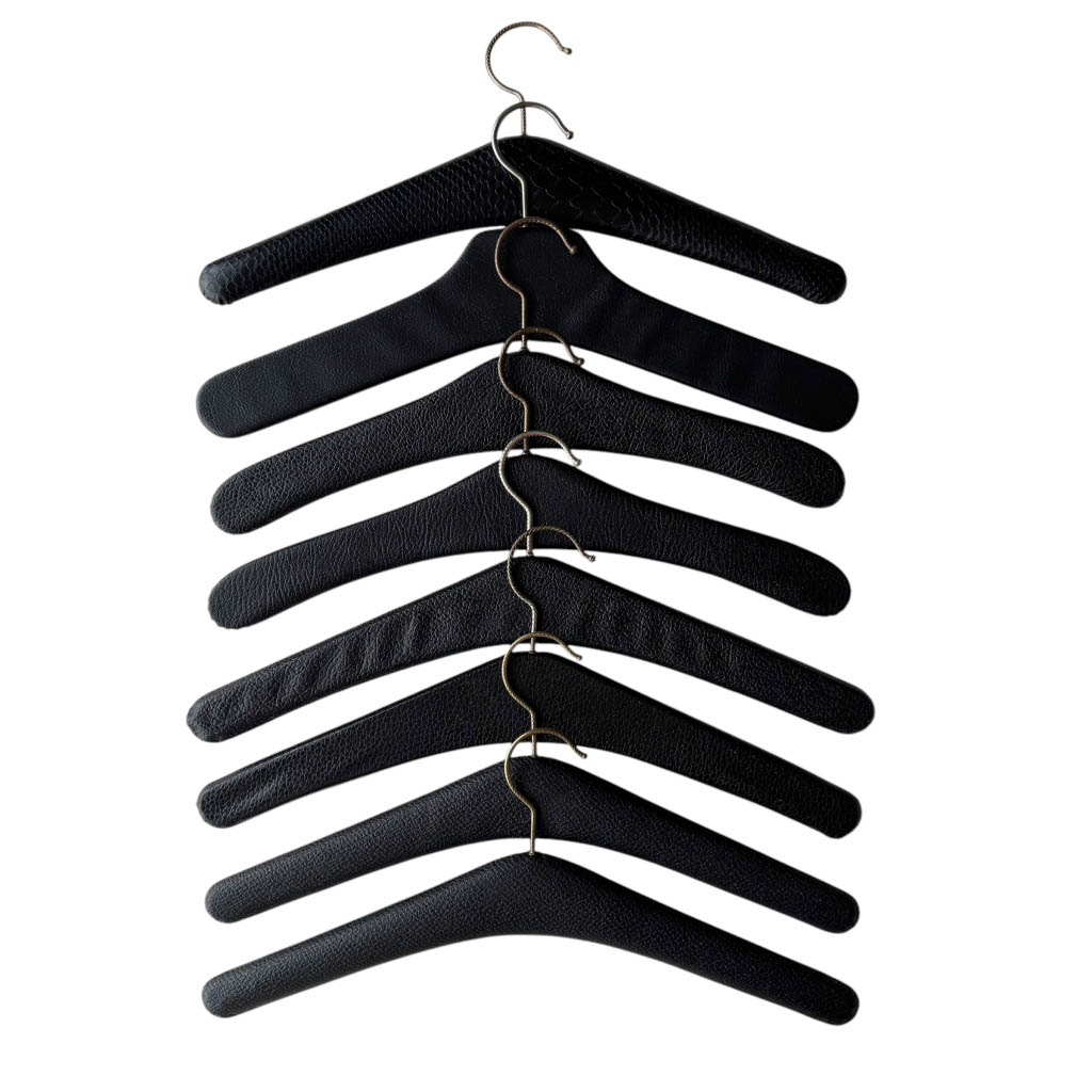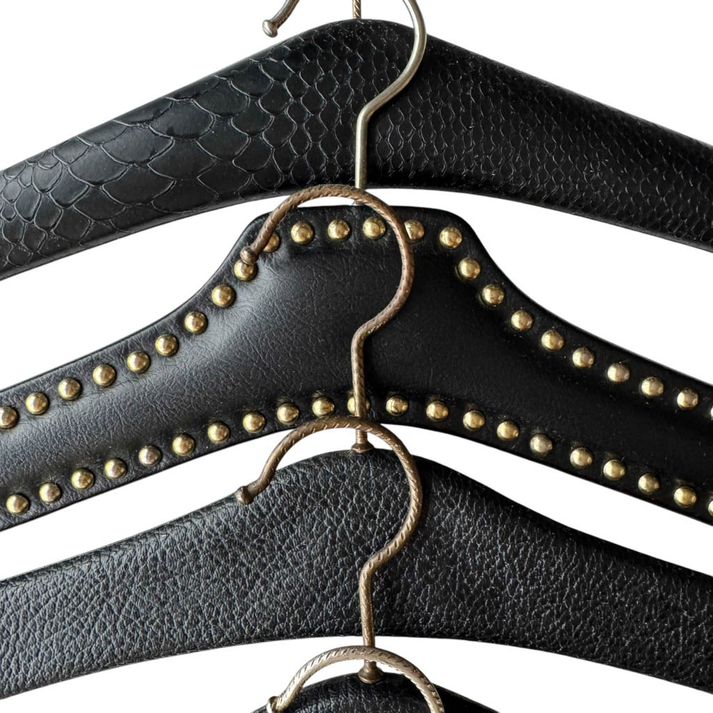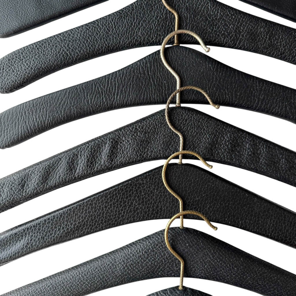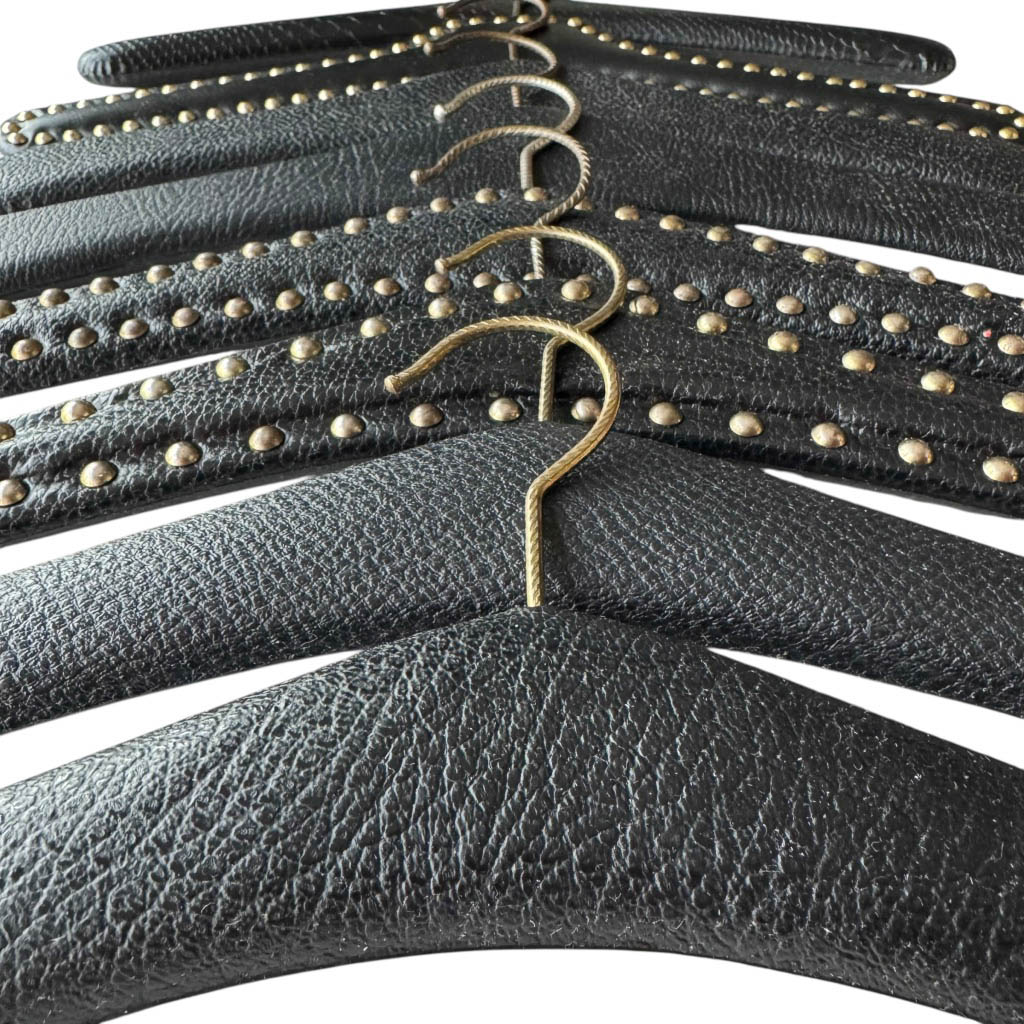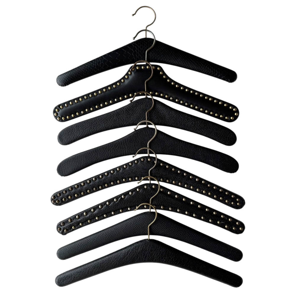 8 cintres 50s noirs et clous Elephant Paris Vintage Cintres vintages des années 1 9 5 0, bois habillé de vinyl, cloutés pour certains en métal doré, Taille unique, très bon état général Accessoires très sympas pour harmoniser et rendre glamour l’habillage d’un dressing ou d’un vestiaire public ou privé