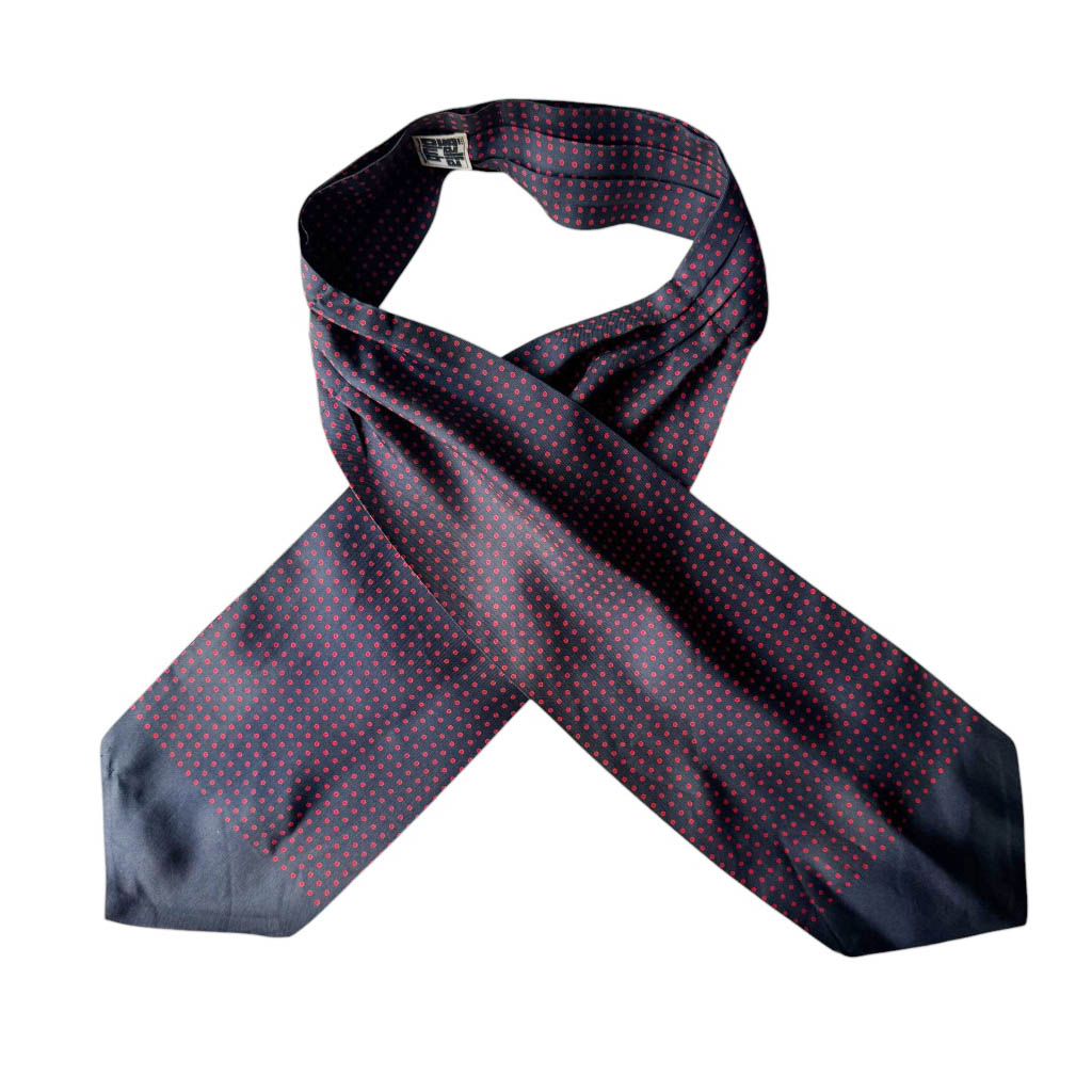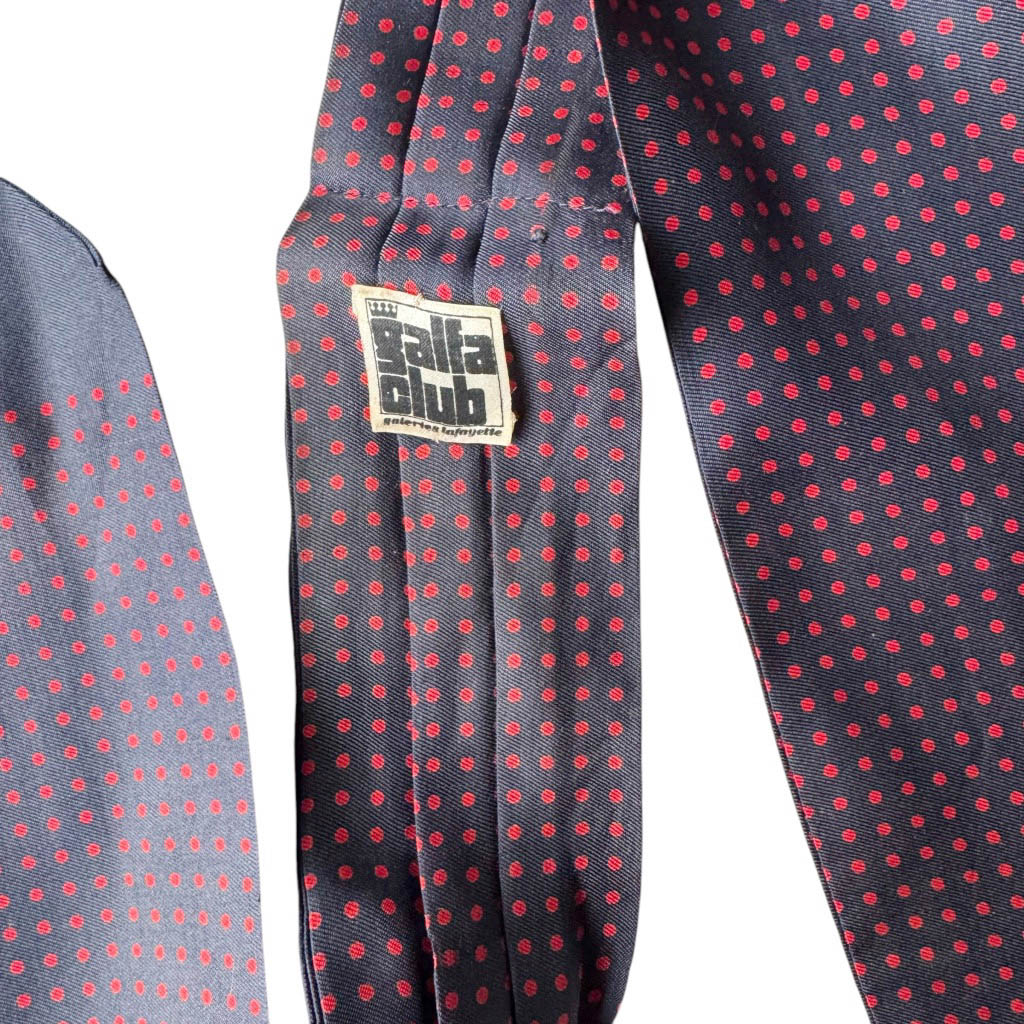 Ascot soie pois galfa club Elephant Paris Vintage Ascot en soie à pois rouges sur fond bleu marine foncé, ce modèle griffé galfa club était une marque des Galeries Lafayette, vintage des années 70, Longueur totale 117 cm, Taille unique, très bon état