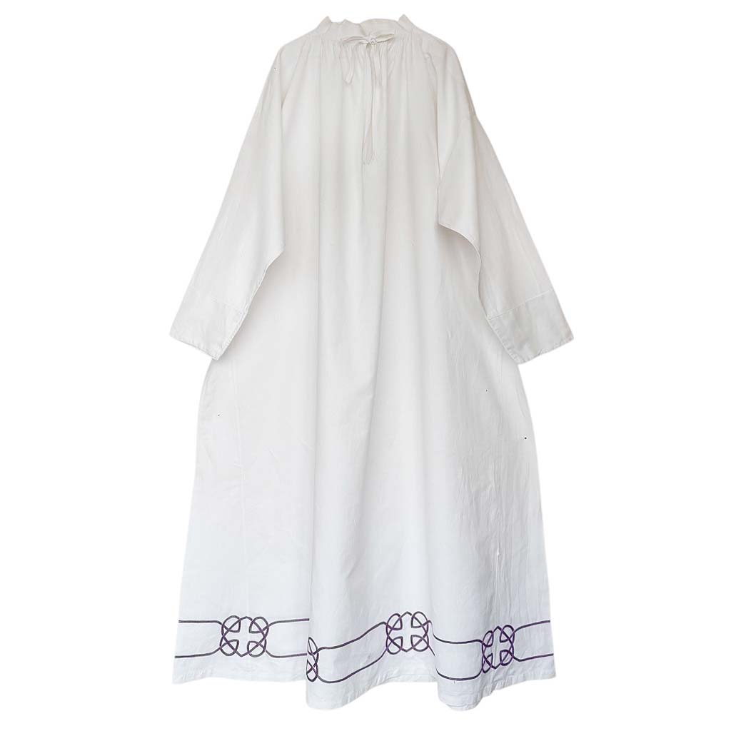 Aube de prêtre brodée violet Elephant Paris Vintage Grande robe liturgique 100% pur coton, brodée violet sur tout le bas, se ferme par un lien noué sur le décolleté, deux endroits sont décousus (voir photos) Dimensions : largeur 125 cm longueur 157 cm