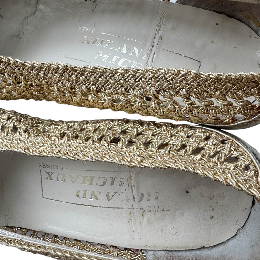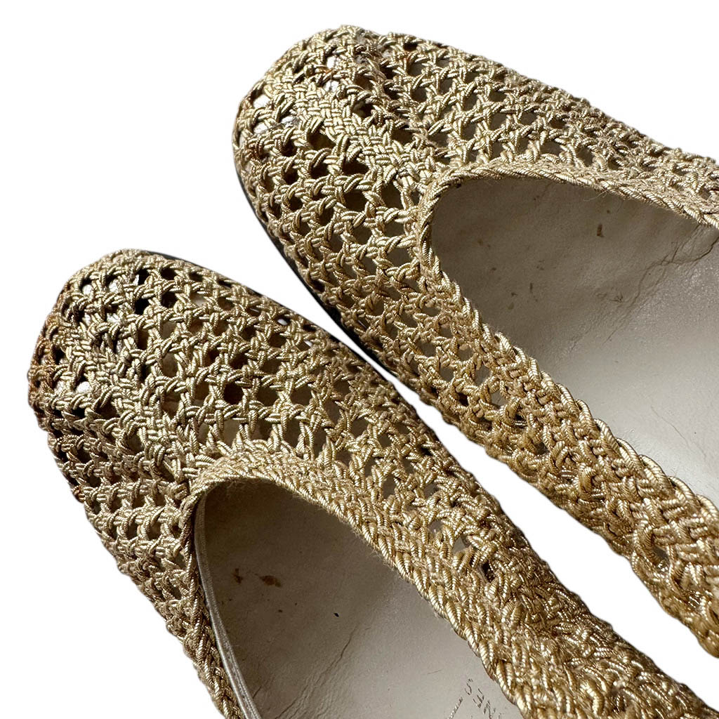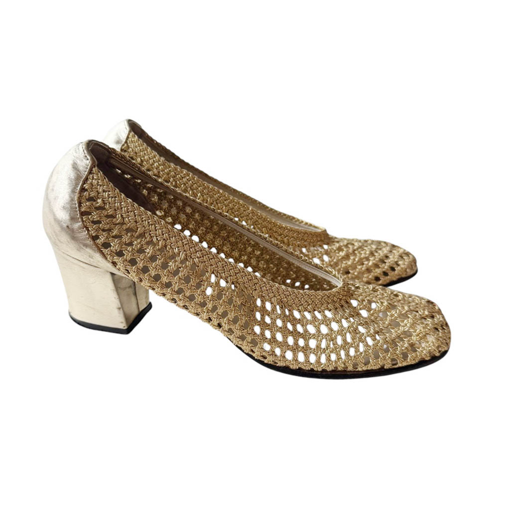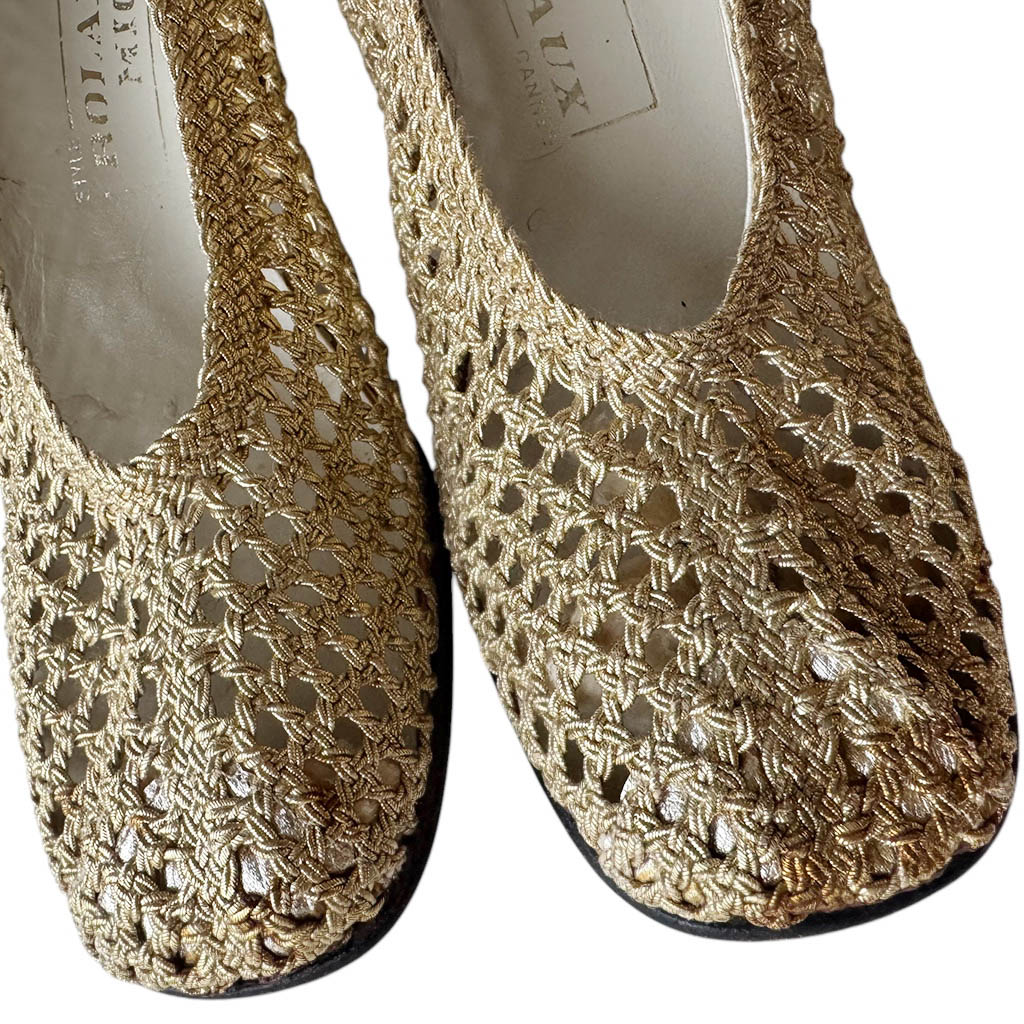 Ballerines cuir tressé or Roland Michaux Elephant Paris Vintage Ballerines à talons carrés arrondis en cuir tressé souple dorées, vintage des années 60, Pointure 37, 4 1/2, Hauteur talon 6 cm, bon état, semelles intérieures et extérieures en cuir, talons renforcés, fabriquées en France