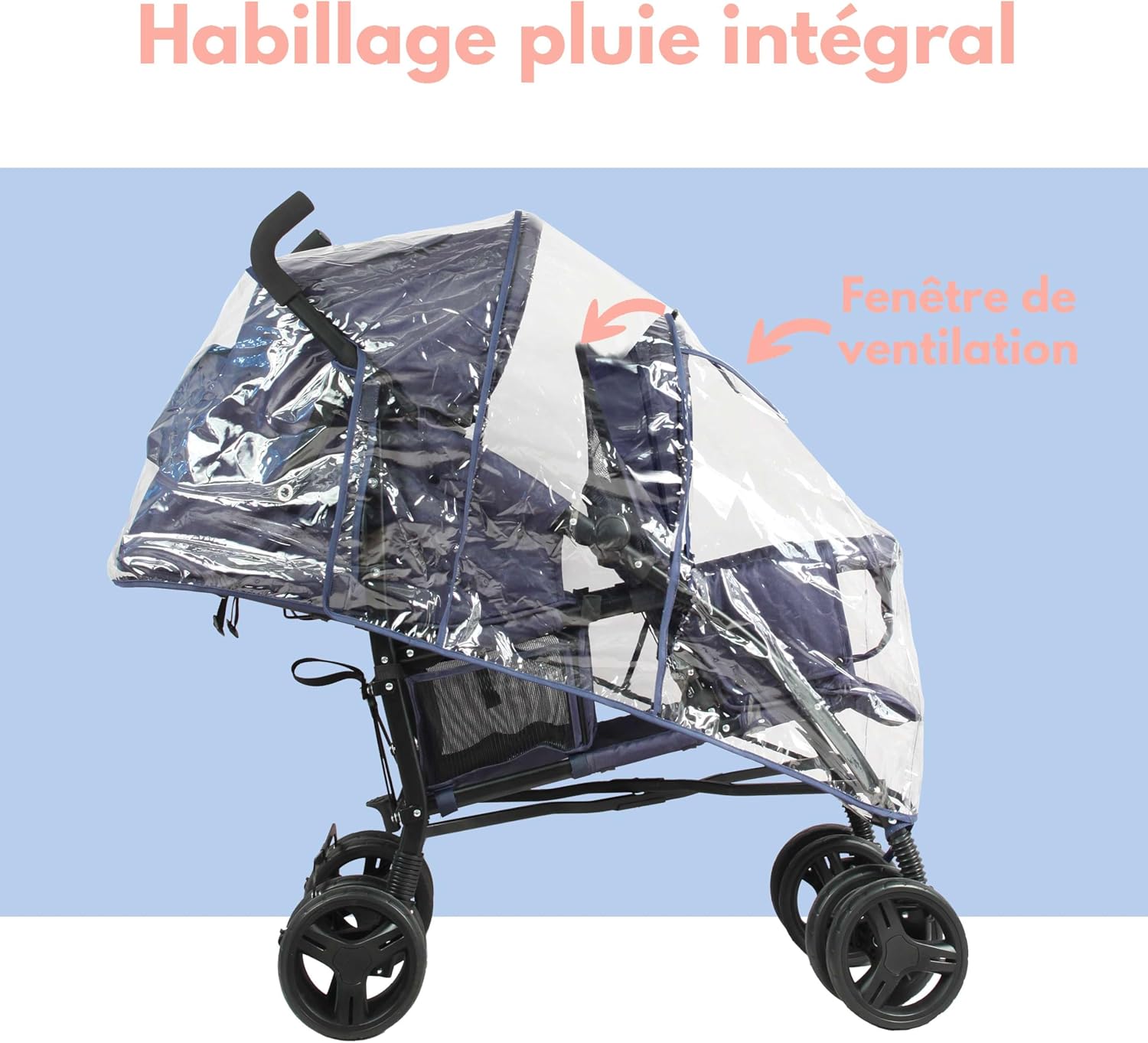 Bambisol Poussette Double Canne – Compacte & Pratique, Bleu Marine avec Habillage Pluie