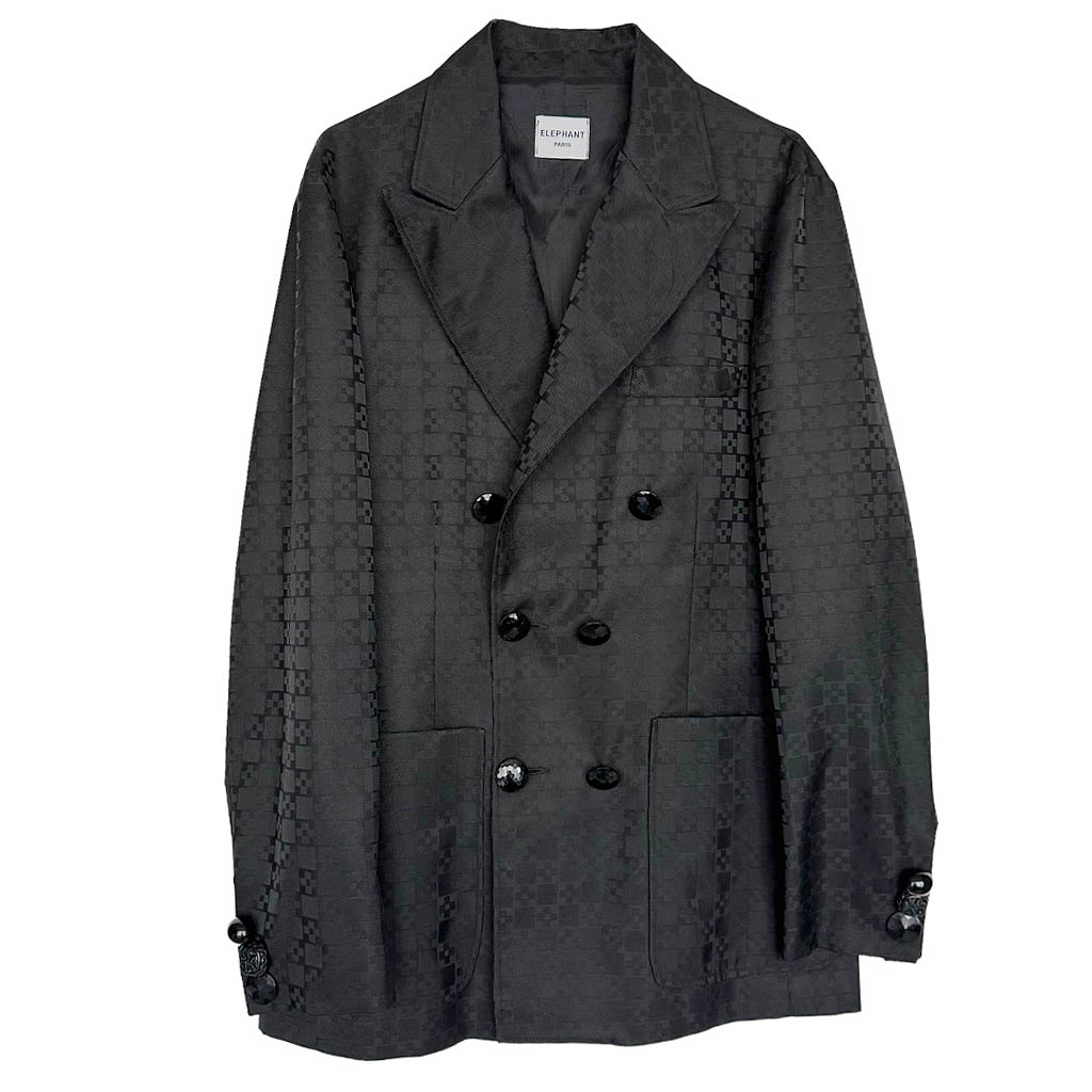 Blazer croisé costume Panthera Onca Elephant Paris Design Réalisé avec des matériaux anciens, tissus synthétique des années 70, boutons bijoux en jais et passementerie, Pièce unique Made in France Mesures prises à plat : Epaules 46cm, Poitrine 53cm, Taille 45cm, Longueur dos 80cm, Longueur manche 63cm, Taille 40/M