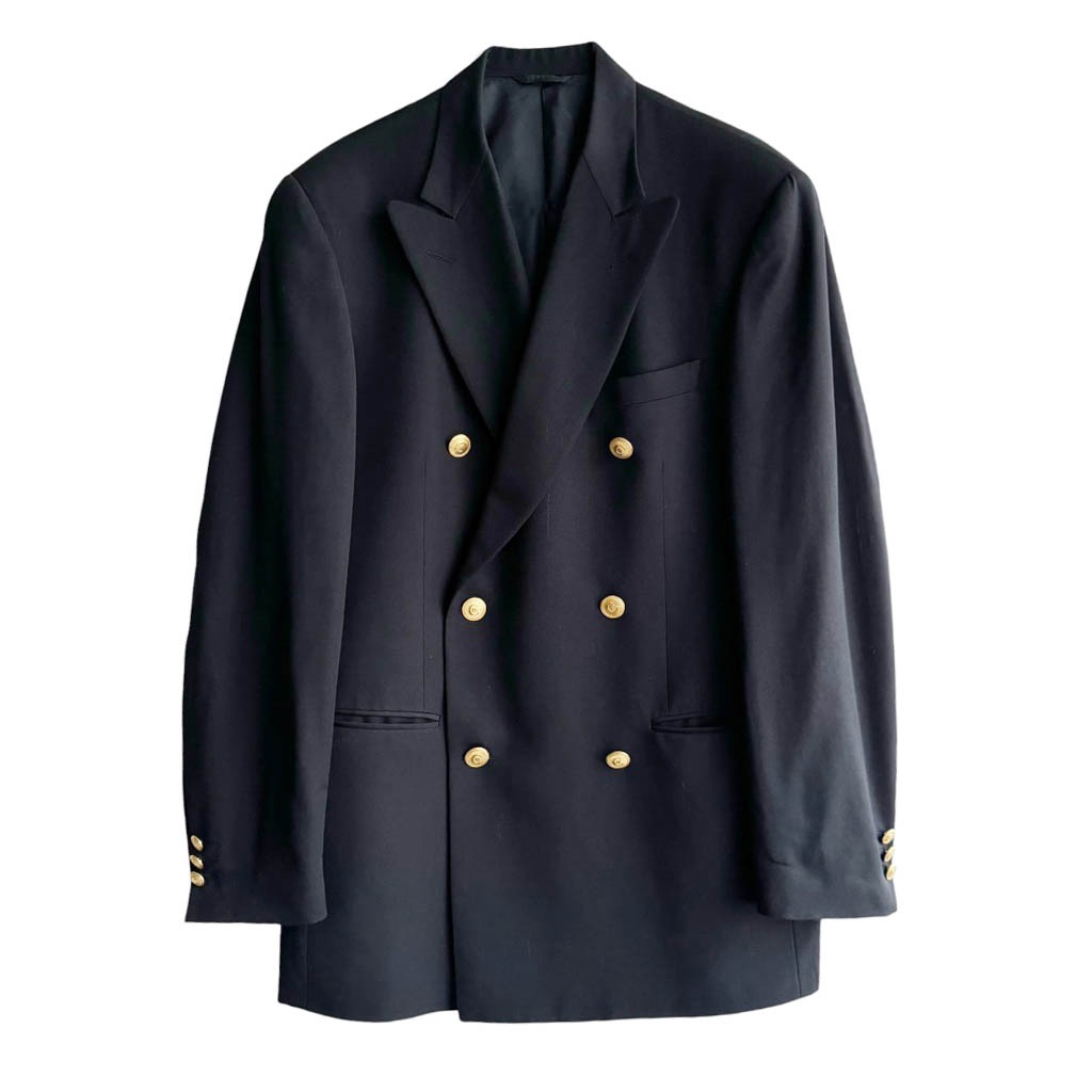 Blazer croisé marine Cerruti 1881 Elephant Paris Vintage Années 80, laine, boutons métal dorés signés et doublure Cerruti, poche gilet, col tailleur, Mesures à plat : Epaules 45cm, Poitrine 52cm, Taille 38cm, Longueur dos 81cm, Taille 48 italienne, L bon état Très chic en oversize sur une femme et très classique en oversize ou non sur un homme, parfait en demi-saison