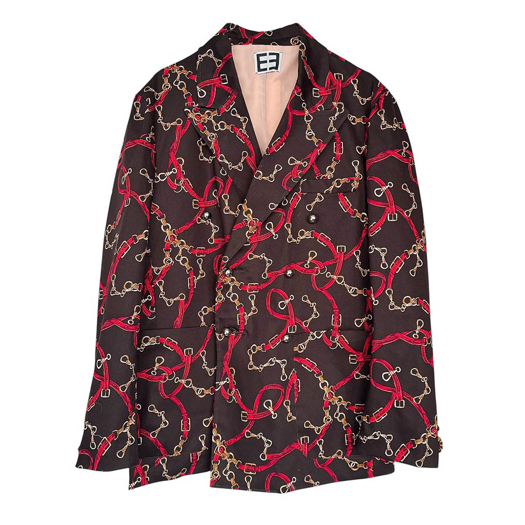 Blazer Heritages Elephant Paris Design Ce blazer croisé en coton et élasthanne au motif Saint-Honoré incarne l’élégance intemporelle et le savoir-faire parisien d’Elephant Paris Design. Il présente six boutonnières brodées à la main aux coordonné de soie, et huit boutons visibles en métal argenté, neufs d’époque, datant des années 1 9 7 0.Sur le bas des manches, de délicates broches anciennes en métal doré et argenté, strass – véritables pièces des années 1 9 8 0 – viennent enrichir le vêtement d’un éclat singulier. La doublure en nylon couleur rose poudre, d’origine années 1 9 7 0, souligne le soin…