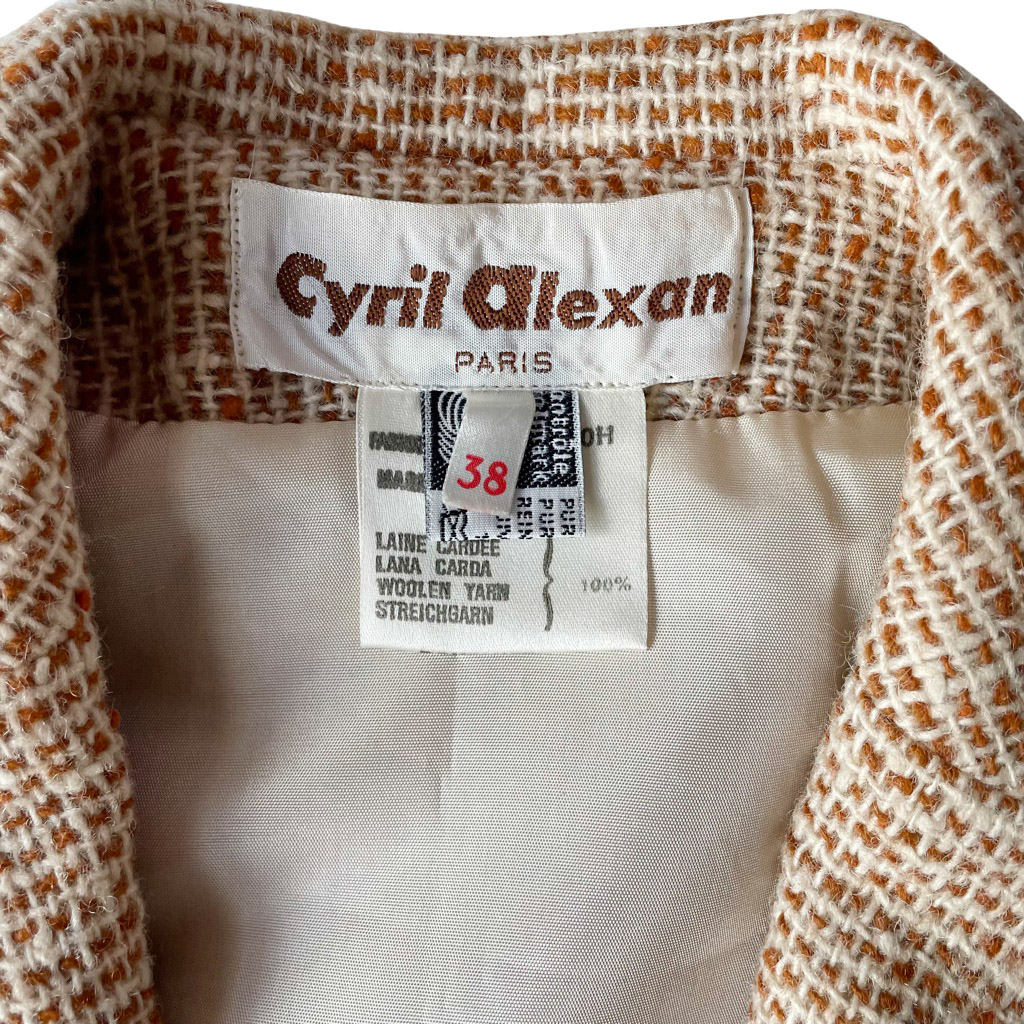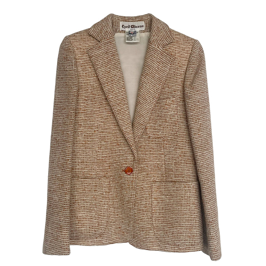 Blazer tweed Cyril Alexan, années 70, très ajustée, martingale élastique et plis creux dans le dos, deux poches plaquées devant.