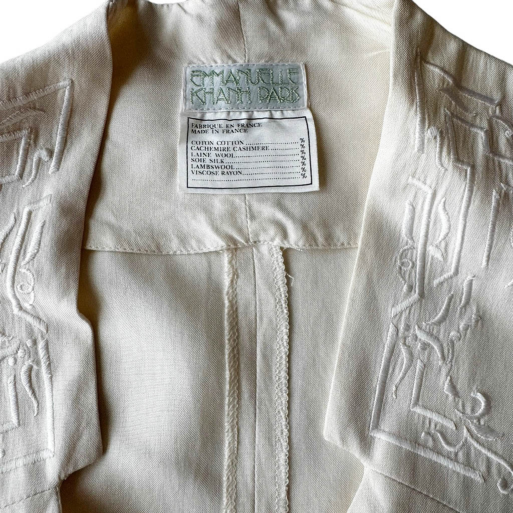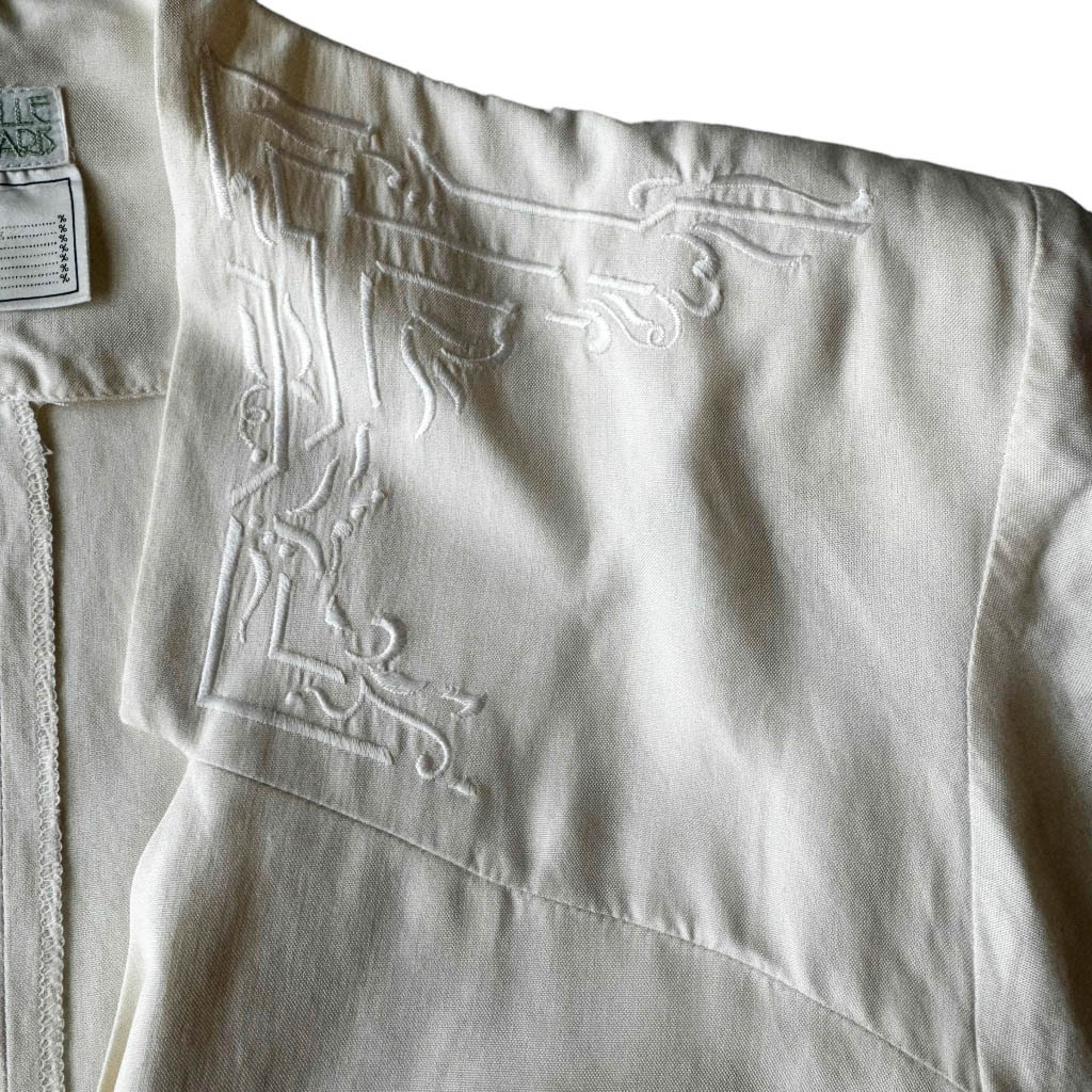 Blouse coton brode Emmanuelle Khanh Elephant Paris Vintage Années 80, coton imprimé et sequins, Mesures à plat : Epaules 43cm, Poitrine 50cm, Longueur dos 62cm, Taille 40/ M Une petite marque à signaler au dos en haut voir photos