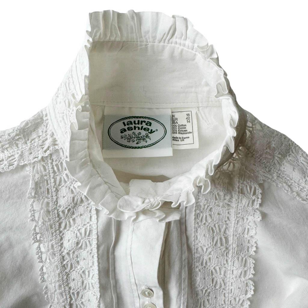 Blouse coton dentelle Laura Ashley Elephant Paris Vintage Années 80, pur coton et dentelle de coton, petits boutons en nacre, Mesures à plat : Epaules 34cm, Poitrine 50cm, Longueur dos sans le col 62cm, Taille 38 bon état général, Made in Carno, Wales, UK