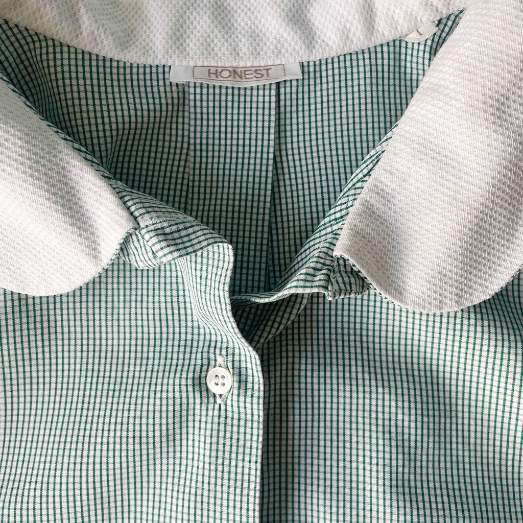 Blouse coton Honest rayée double col claudine, années 80 Elephant Paris Vintage Mesures à plat : Epaules 38cm, Poitrine 50cm, Longueur dos : 66cm, Taille globale 38/40