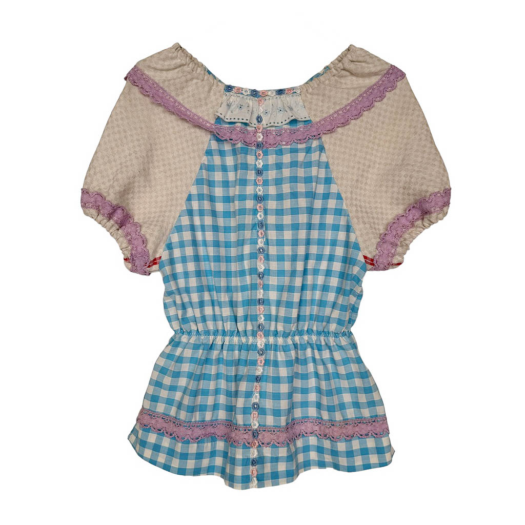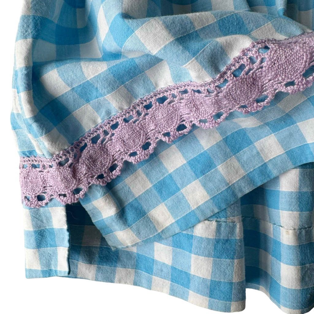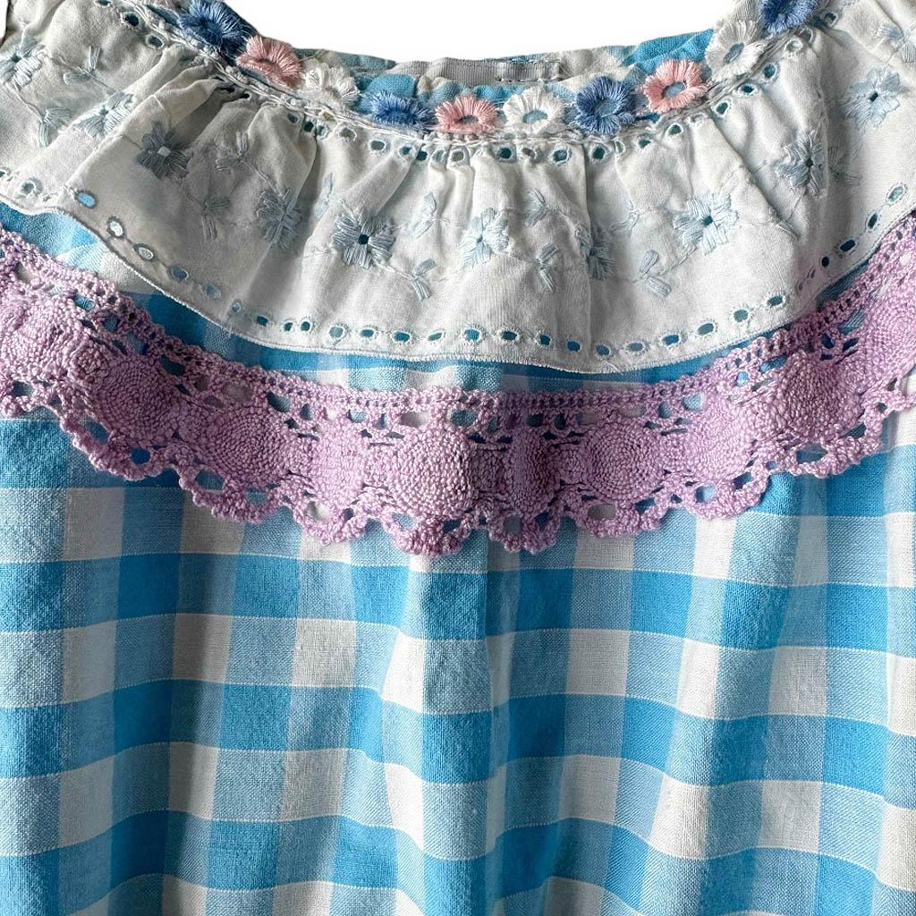 Blouse coton vichy turquoise lilas Elephant Paris Design Upcycling réalisé avec des matériaux anciens coton vichy, broderie coton années 70, Pièce unique Made in France, Longueur dos 58cm, Taille 36, S
