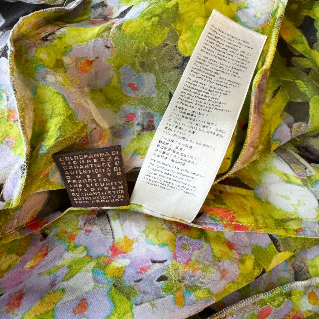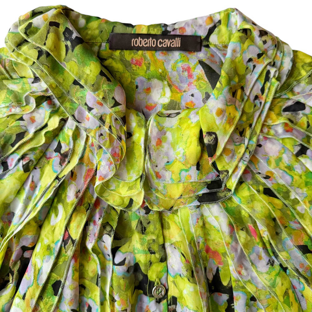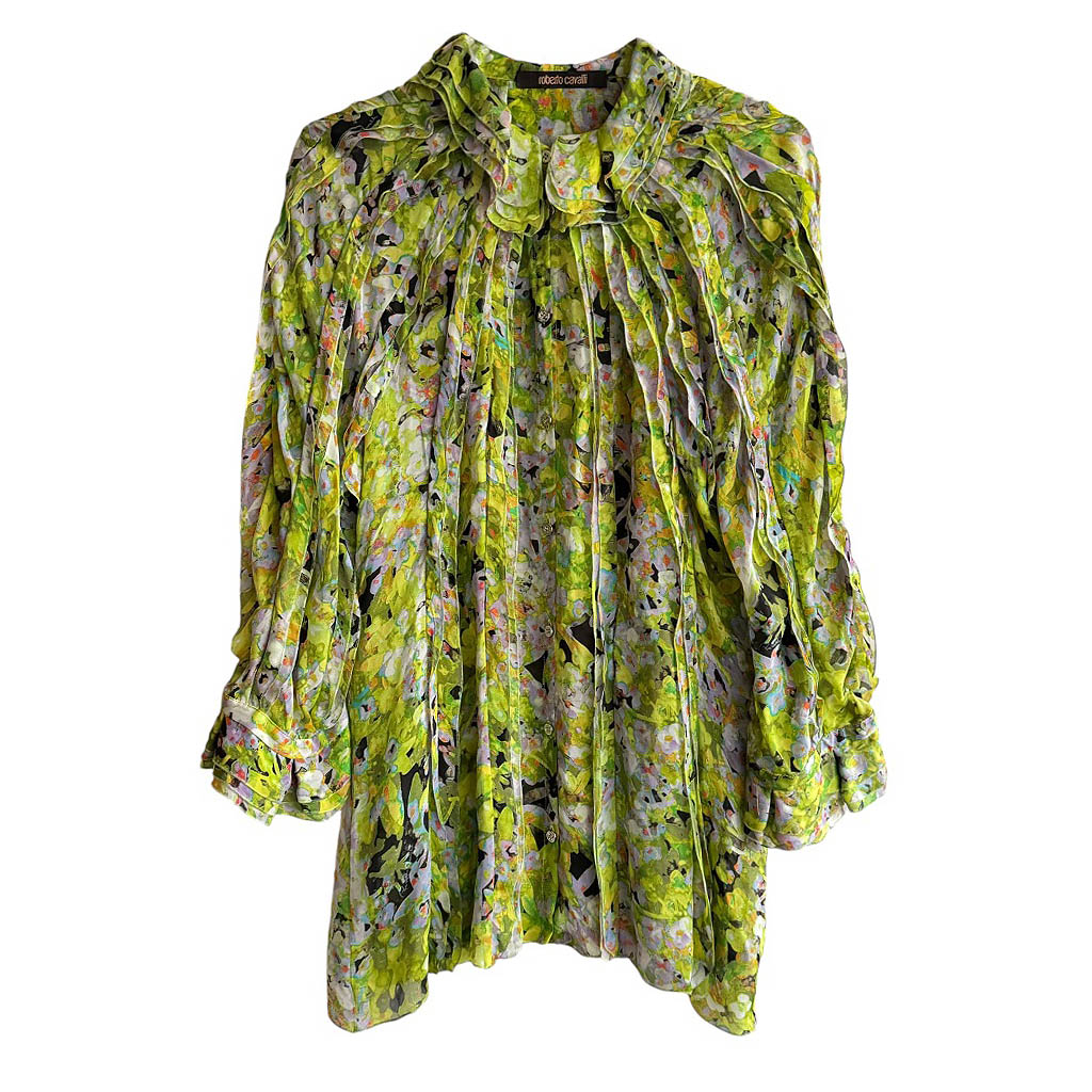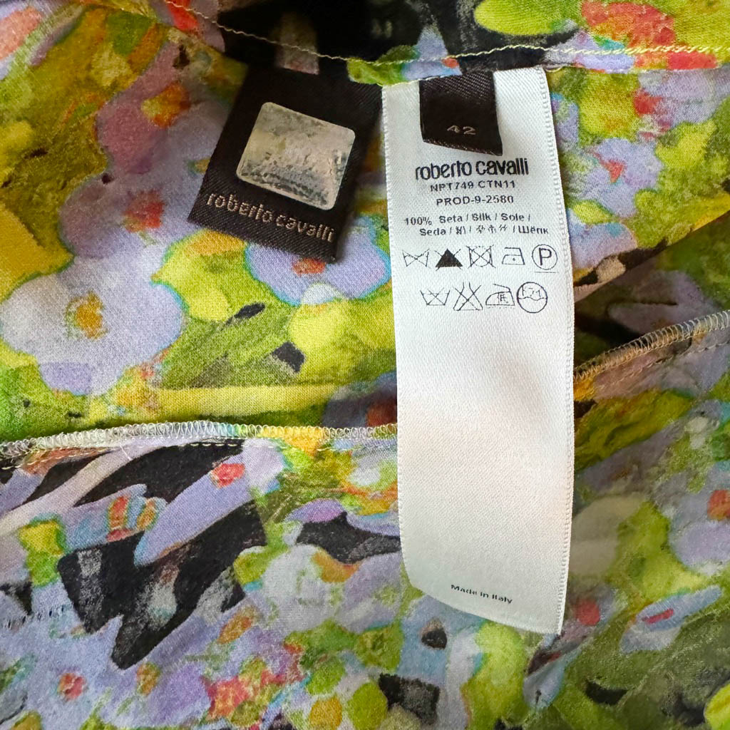 Blouse soie Roberto Cavalli Elephant Paris Vintage Très jolie blouse en soie imprimée années 2000, mousseline de soie à volants fins, jolis boutons bijoux fantaisie Mesures à plat : Manches raglans, Poitrine 48cm, Longueur dos 72cm, Taille 36/38 très bon état général