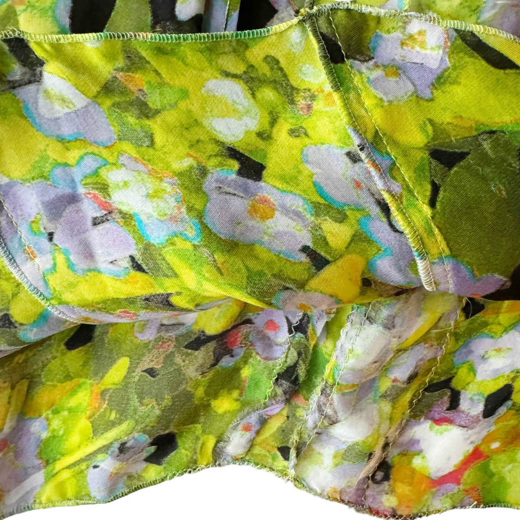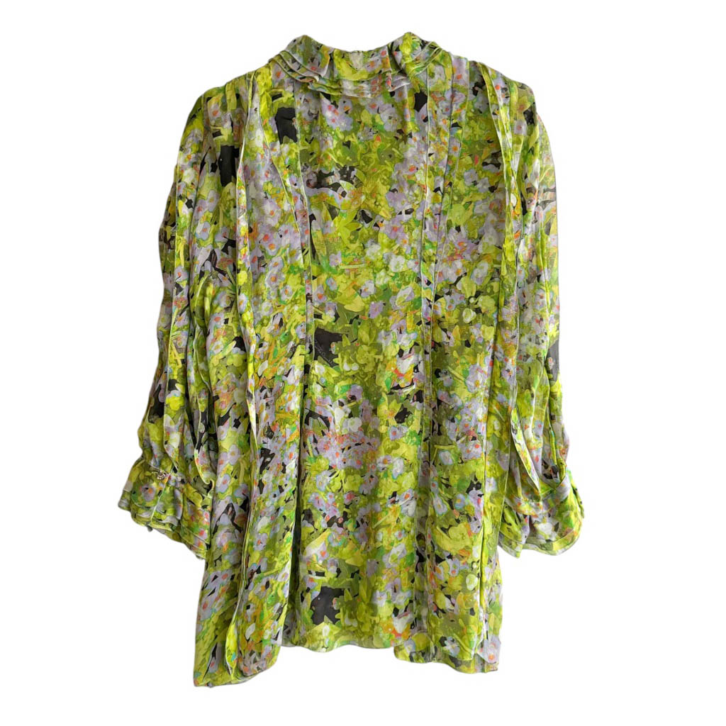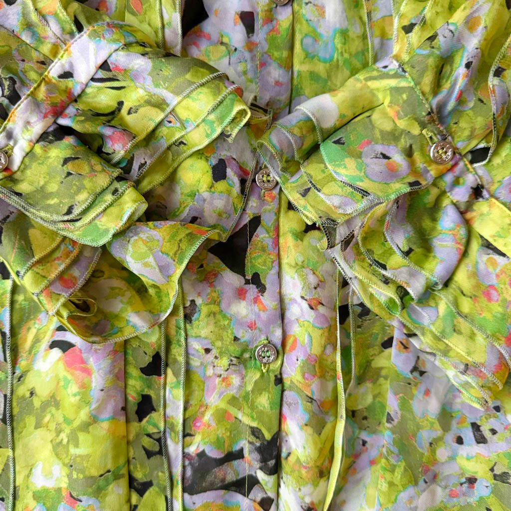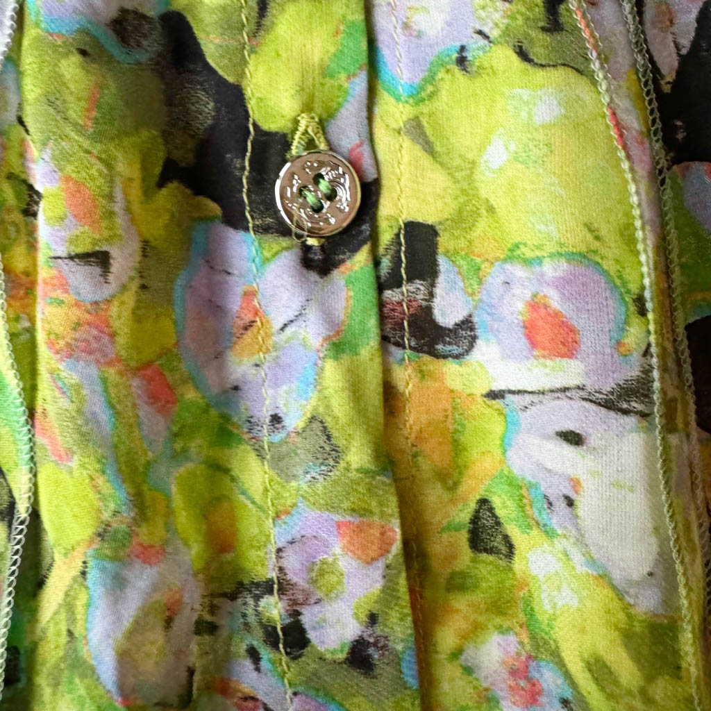 Blouse soie Roberto Cavalli Elephant Paris Vintage Très jolie blouse en soie imprimée années 2000, mousseline de soie à volants fins, jolis boutons bijoux fantaisie Mesures à plat : Manches raglans, Poitrine 48cm, Longueur dos 72cm, Taille 36/38 très bon état général
