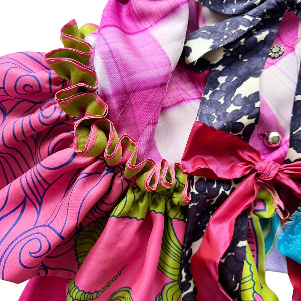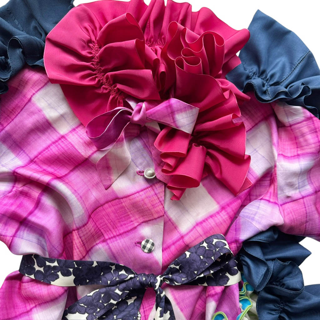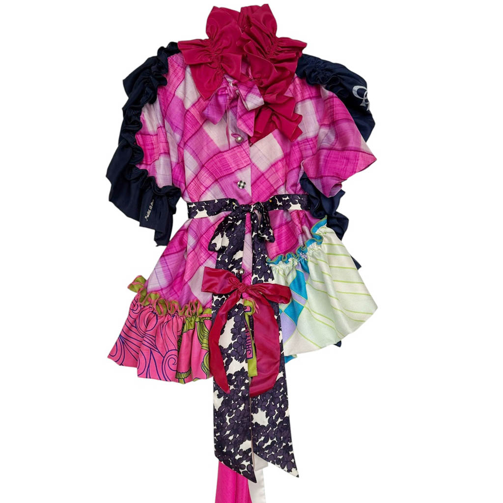 Blouse soie volants Pink Passion Elephant Paris Design Blouse en soie rose multicolore Travail d’upcycling sur blouse ancienne, tous les matériaux utilisés, boutons, rubans, noeuds, satins, sont anciens, peut se porter aussi comme une mini-robe, finitions sont faites à la main