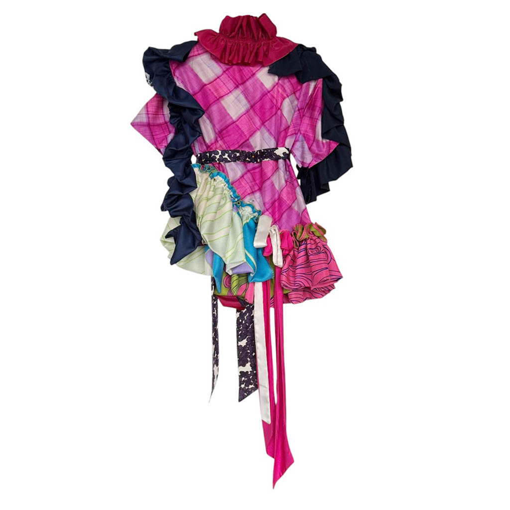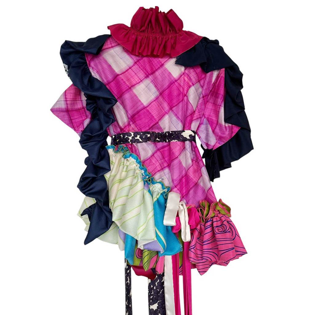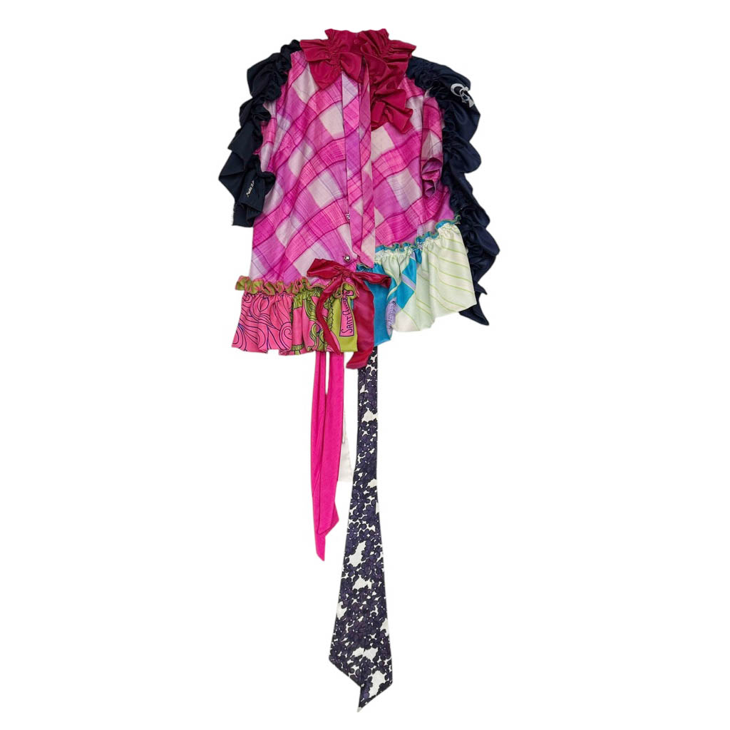 Blouse soie volants Pink Passion Elephant Paris Design Blouse en soie rose multicolore Travail d’upcycling sur blouse ancienne, tous les matériaux utilisés, boutons, rubans, noeuds, satins, sont anciens, peut se porter aussi comme une mini-robe, finitions sont faites à la main