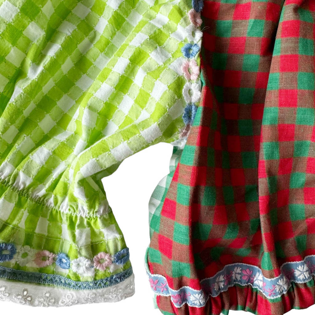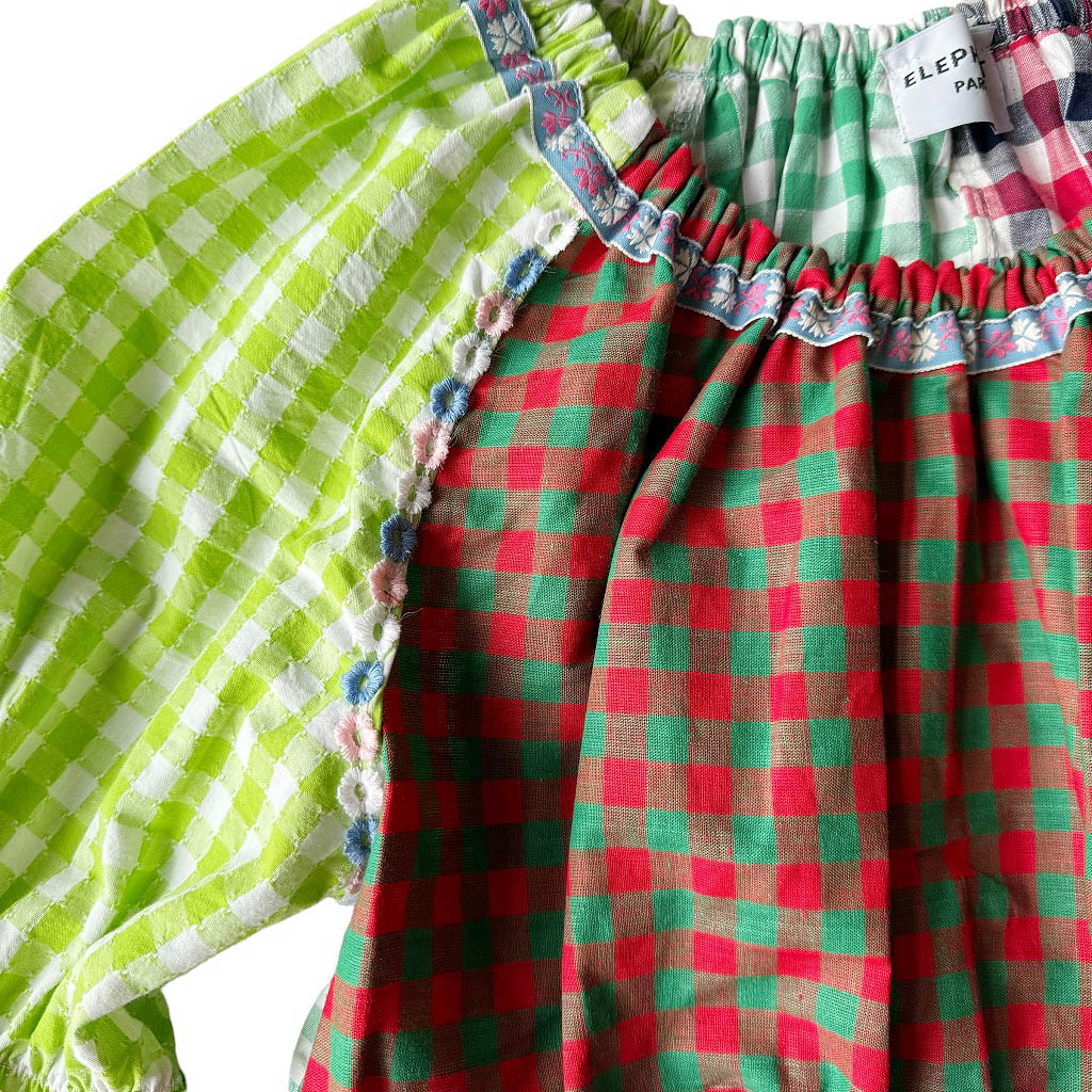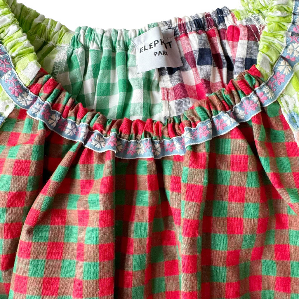 Blouse vichy vert marine rouge Elephant Paris Design Upcycling réalisé avec des matériaux anciens coton vichy et broderies années 70, Pièce unique Made in France, Longueur dos 34cm, Taille 36, S