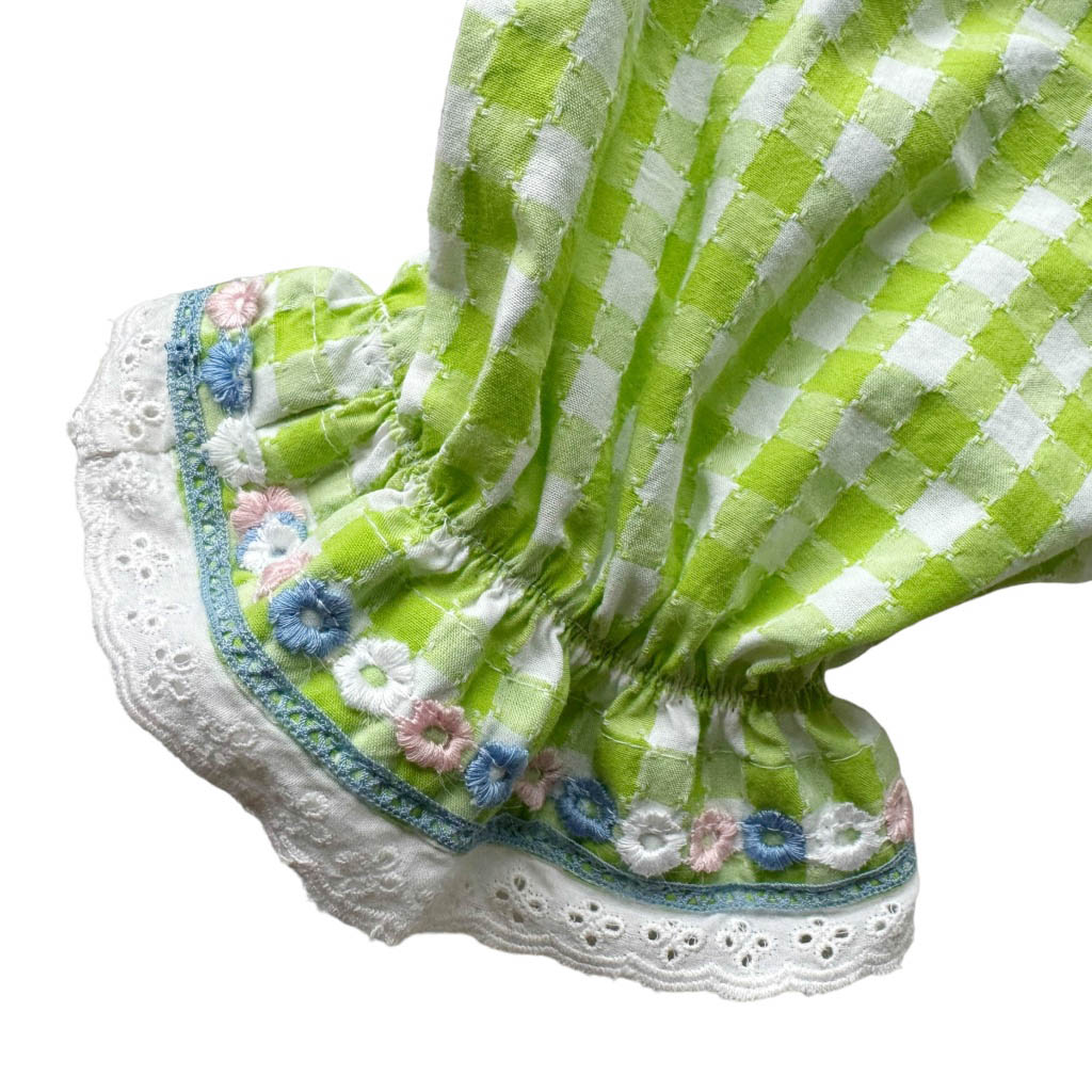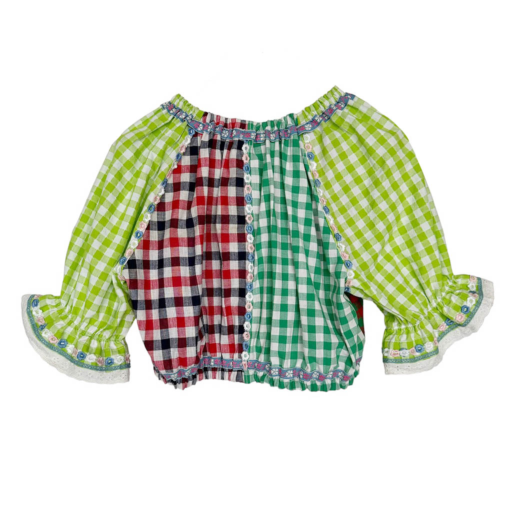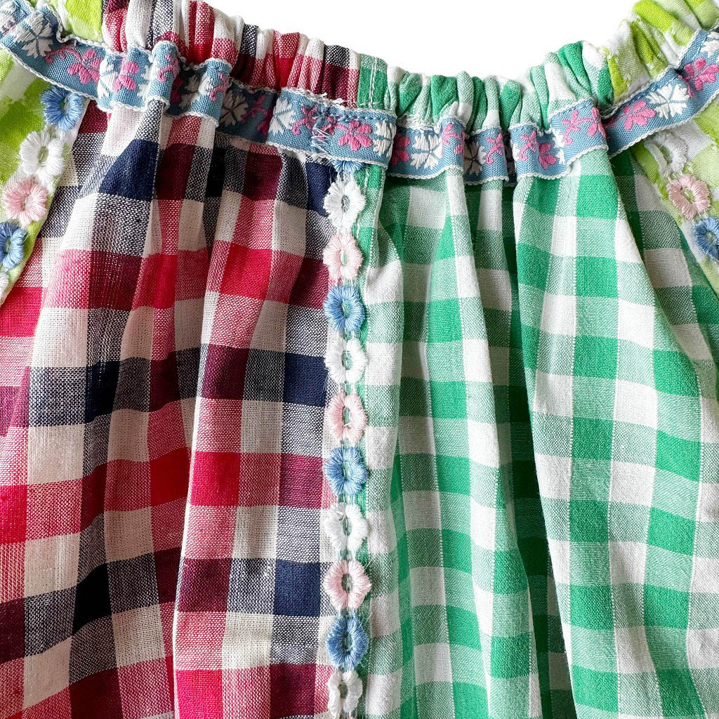 Blouse vichy vert marine rouge Elephant Paris Design Upcycling réalisé avec des matériaux anciens coton vichy et broderies années 70, Pièce unique Made in France, Longueur dos 34cm, Taille 36, S