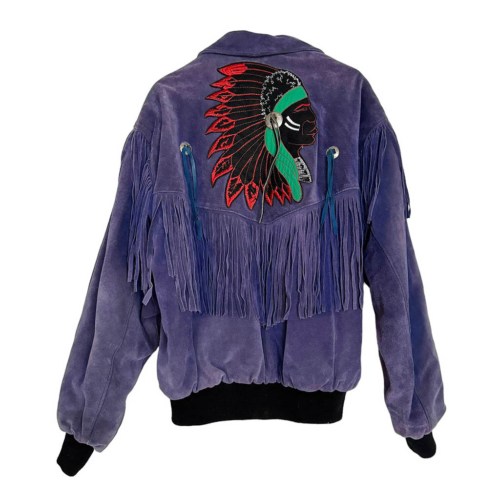 Blouson daim violet Okinawa à tête d’indien brodée dans le dos Elephant Paris vintage Mesures à plat : Épaules 54cm, Poitrine 63cm, Longueur dos avec le col 72cm, Taille L Marques de décoloration, voir photos