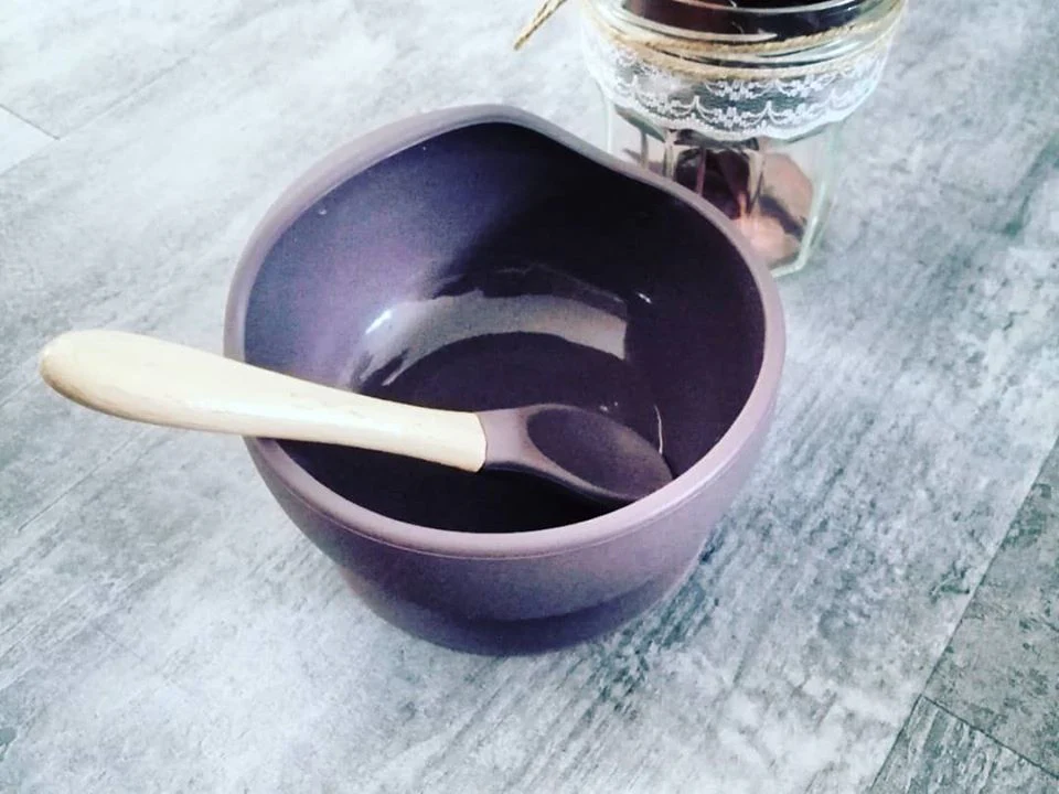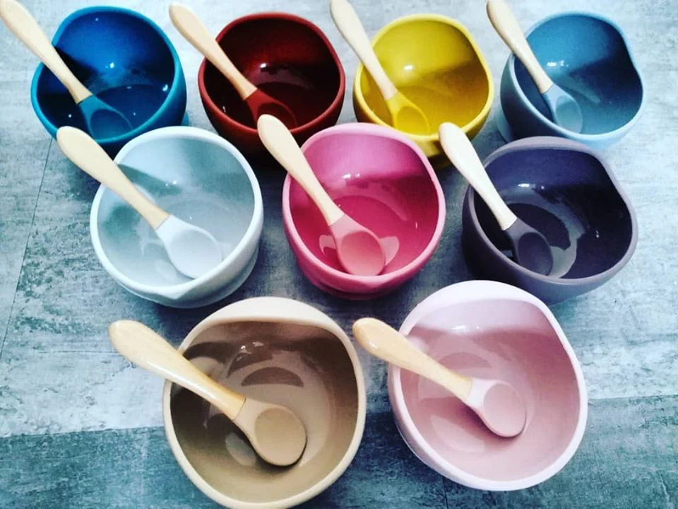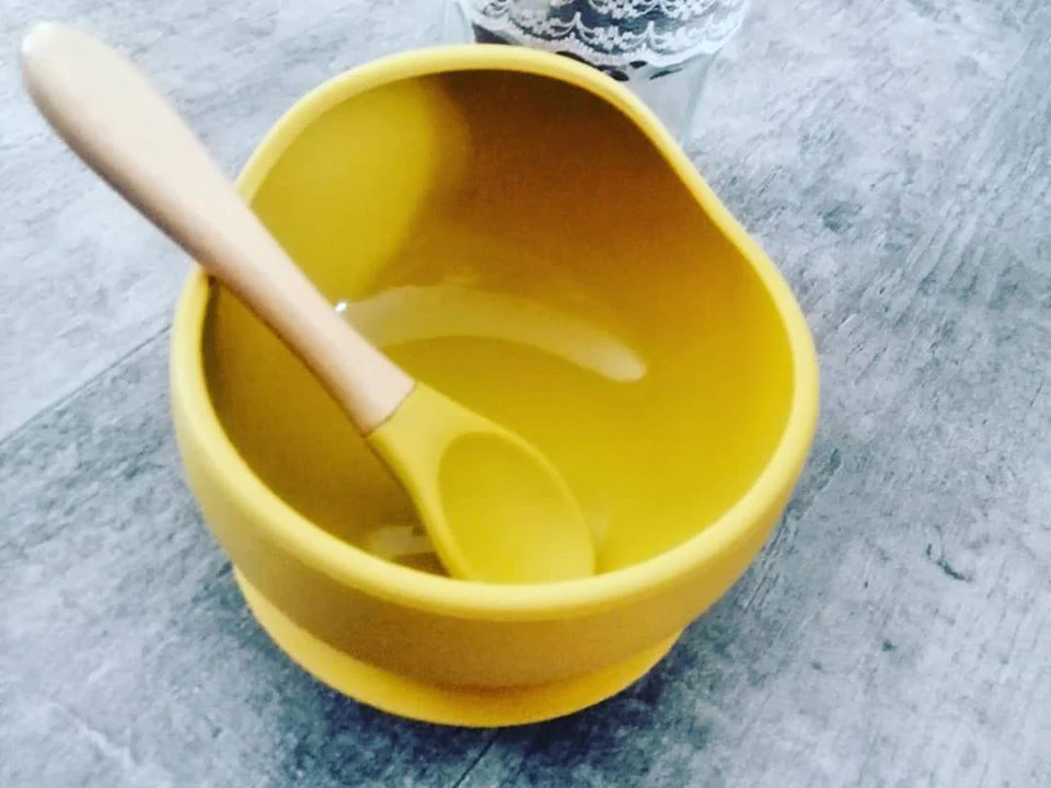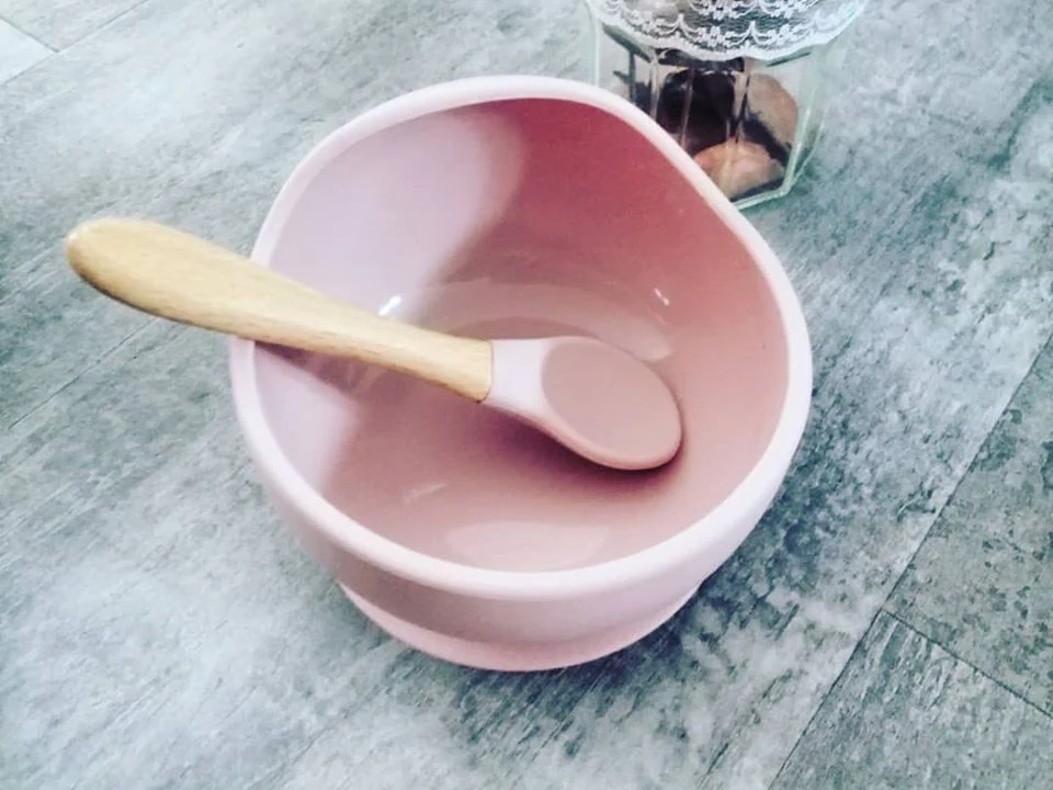 Bol à ventouse, antidérapant et étanche 100% en silicone de qualité alimentaire et sa cuillère assortie avec manche en bois organique