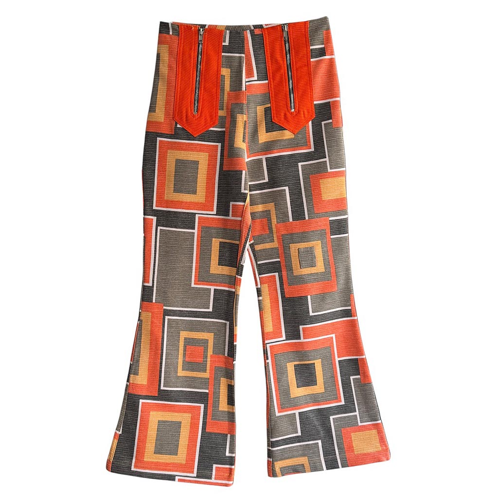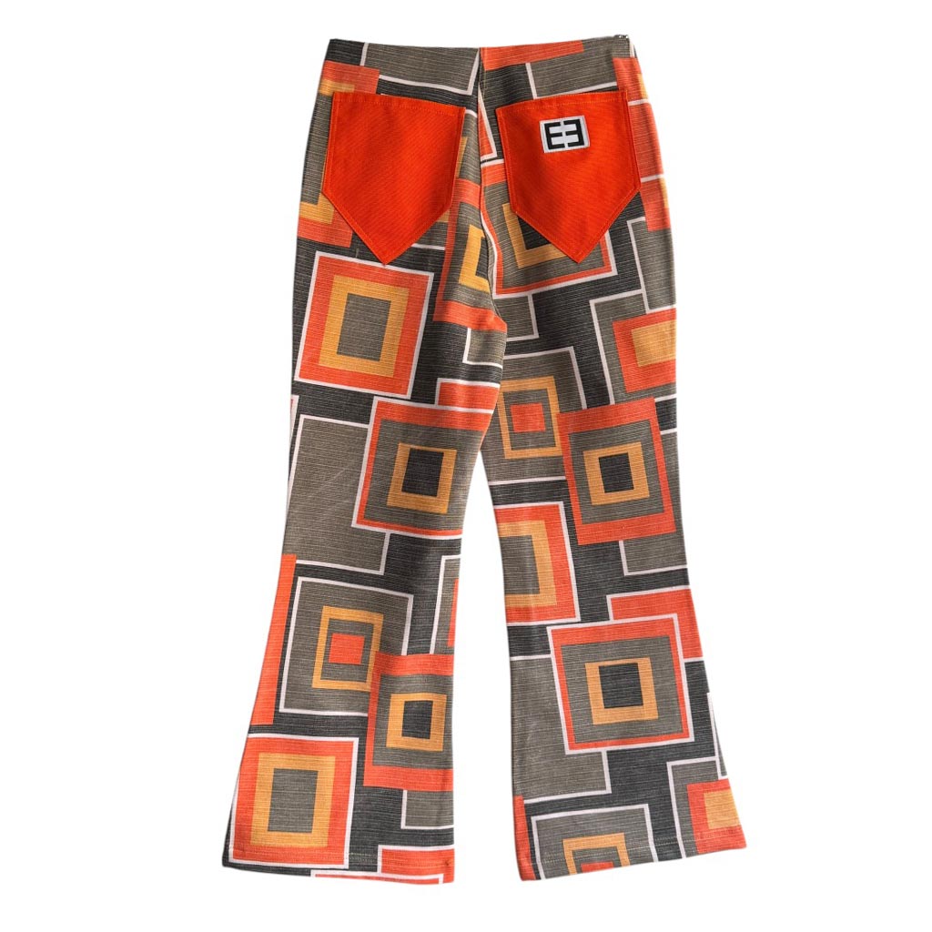 Bootcut Cotton Geometric Elephant Paris Design Ce design est réalisé avec une toile de coton épaisse d’ameublement aux motifs géométriques et cinétiques datant des années 1 9 7 0, 1 0 0 % coton, et une toile orange unie mélangée coton et fibres synthétiques, datant également des années 1 9 7 0, finitions biais de coton orange, surpiqures fil de coton orange et coutures anglaises, les deux fermetures à glissière datent des années 2 0 0 0 Cette pièce est unique et entièrement fabriquée à Paris. ELEPHANT PARIS n’utilise que des matériaux anciens et de qualité pour la création de…