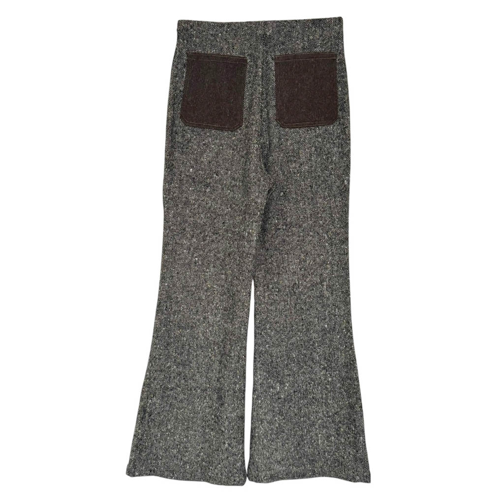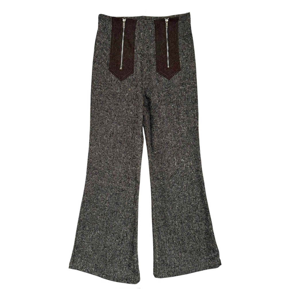Bootcut lainage tweed gris noir Elephant Paris Design Pantalon pattes d’éléphants en tweed, design réalisé avec des matériaux anciens, tweed et cachemire années 70, coutures anglaises et finitions biais de coton Pièce unique Made in France Taille haute 34cm, Hanches 42cm, Longueur entrejambes depuis la taille 32cm, Longueur 105cm, Taille 36/S