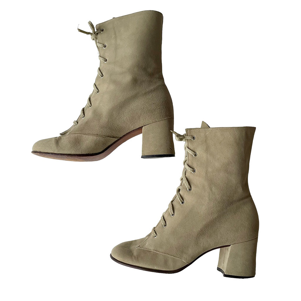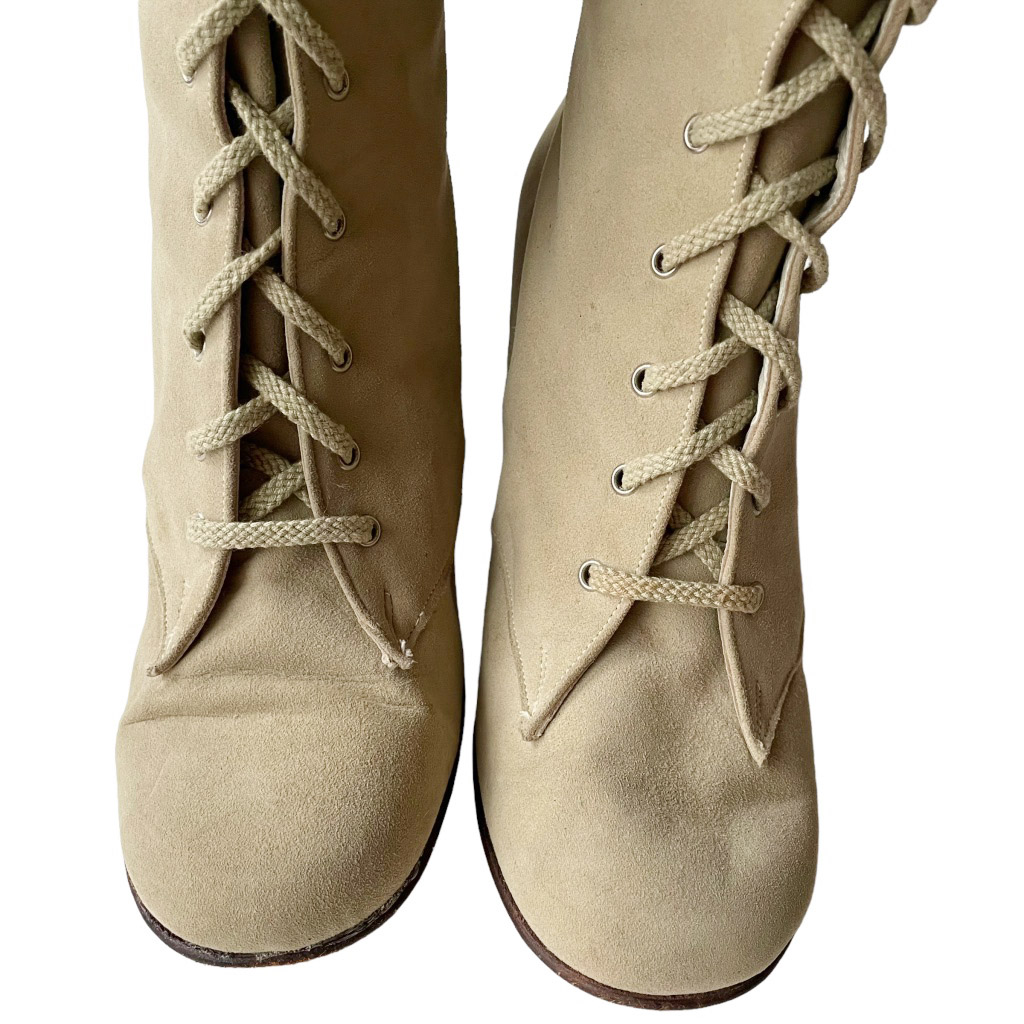 Boots beiges chèvre velours lacées à talons, vintage années 70, semelle cuir et doublée cuir, Pointure 36, 36/5, Hauteur talon 6cm