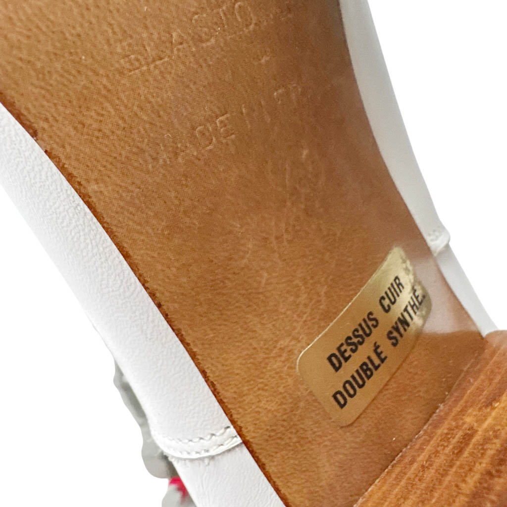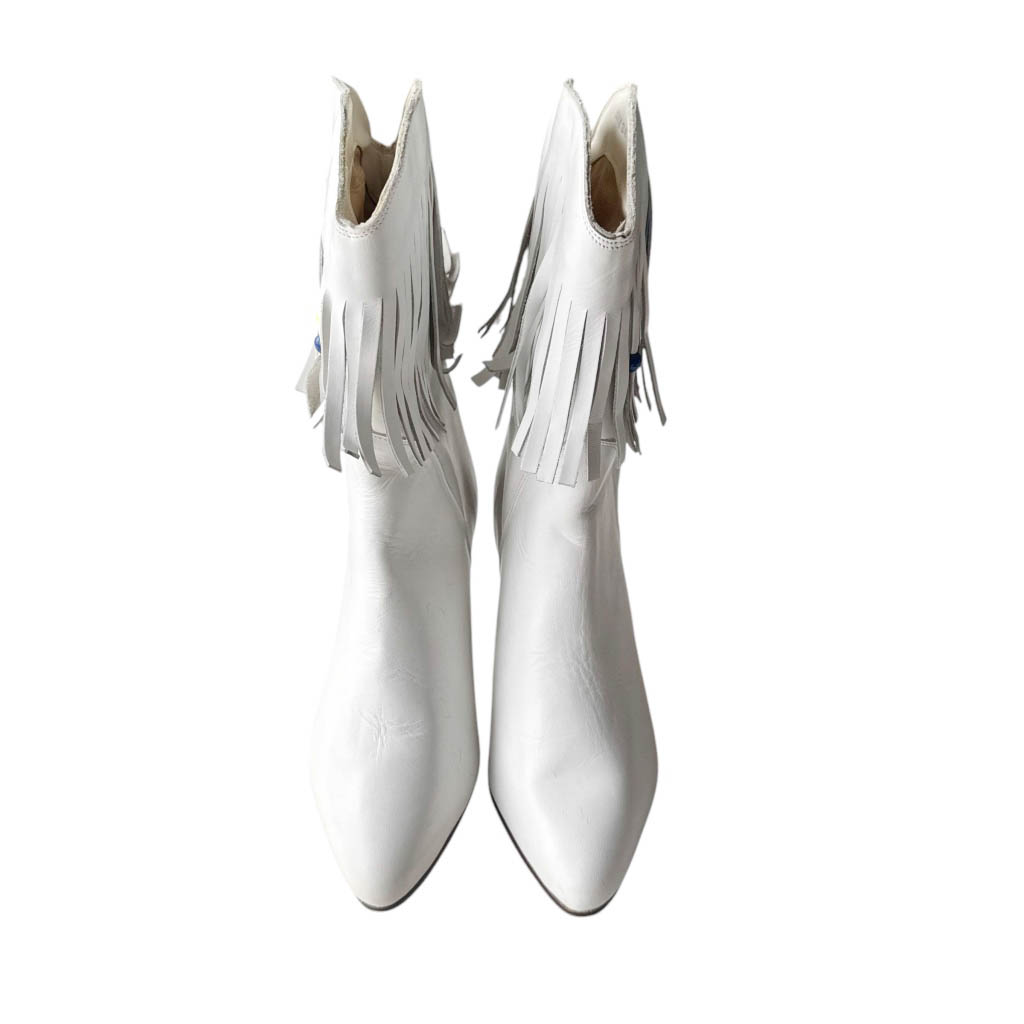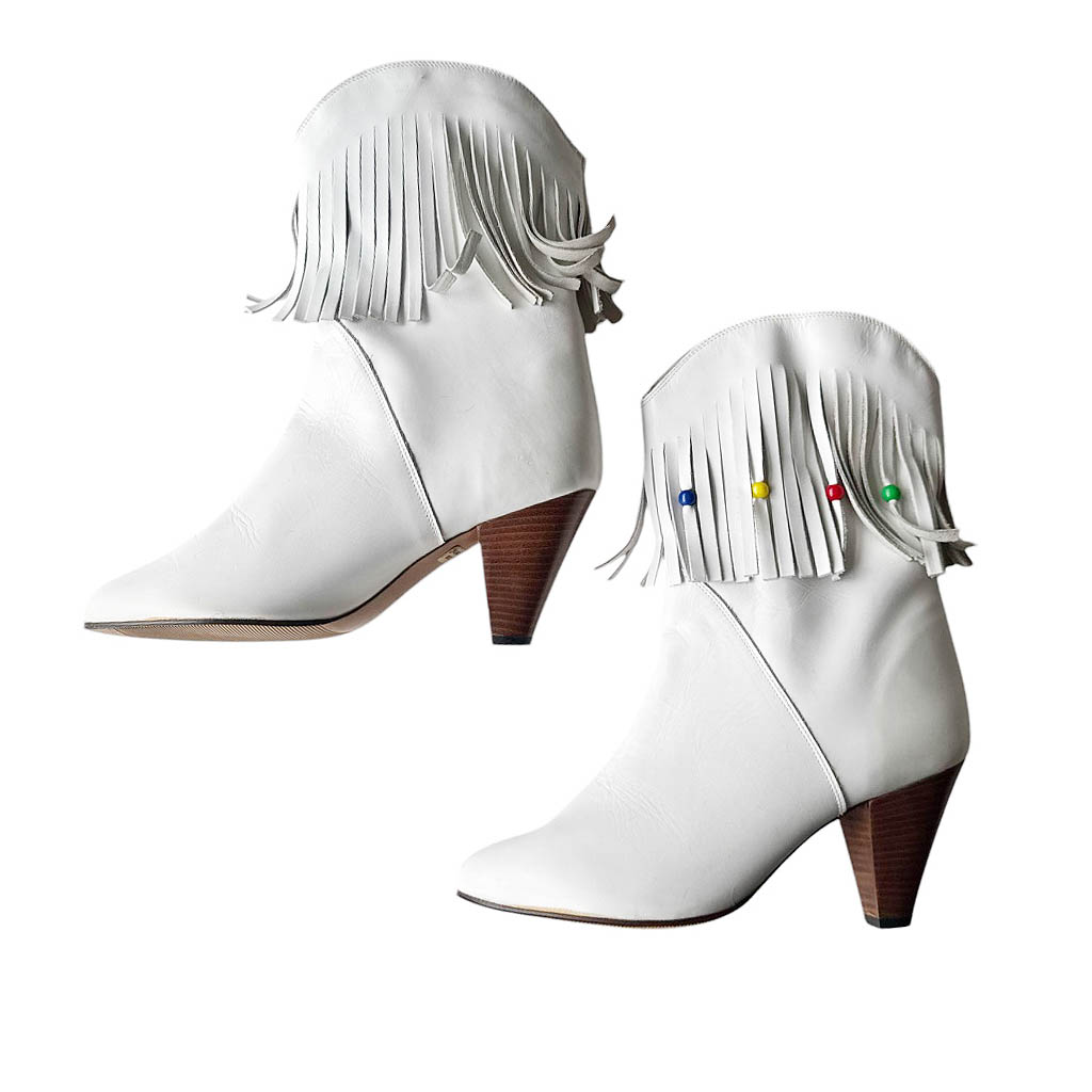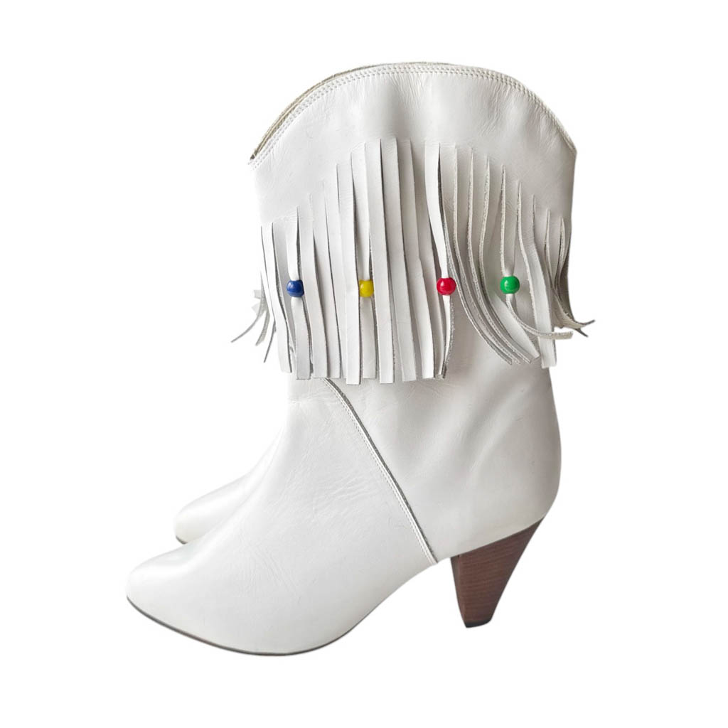 Bottes blanches cuir franges Elephant Paris Vintage Bottes demi-jambe en cuir blanc avec des franges en cuir et perles de couleurs sur le haut de la tige, vintage des années 80, Pointure 40, Hauteur talon en bois 8cm, Neuves d’époque, semelles élastomère, fabriquées en France