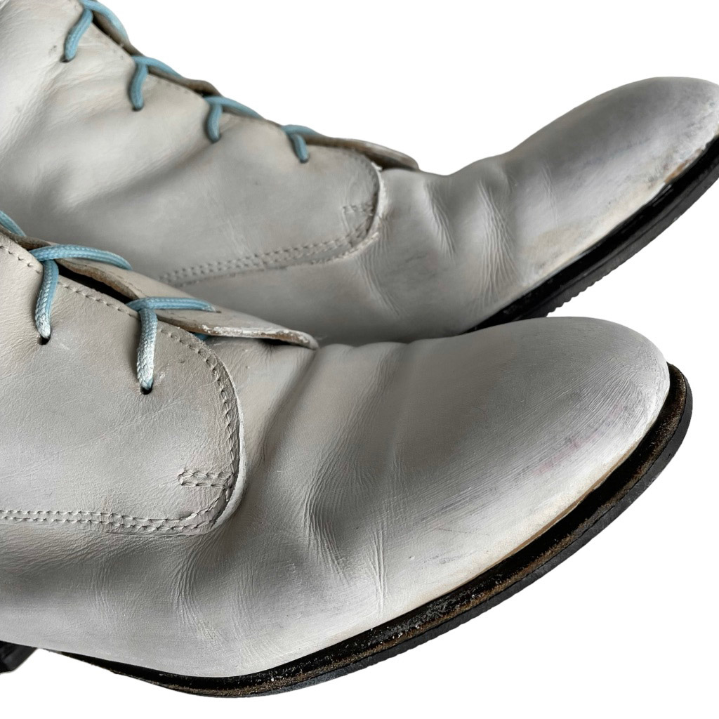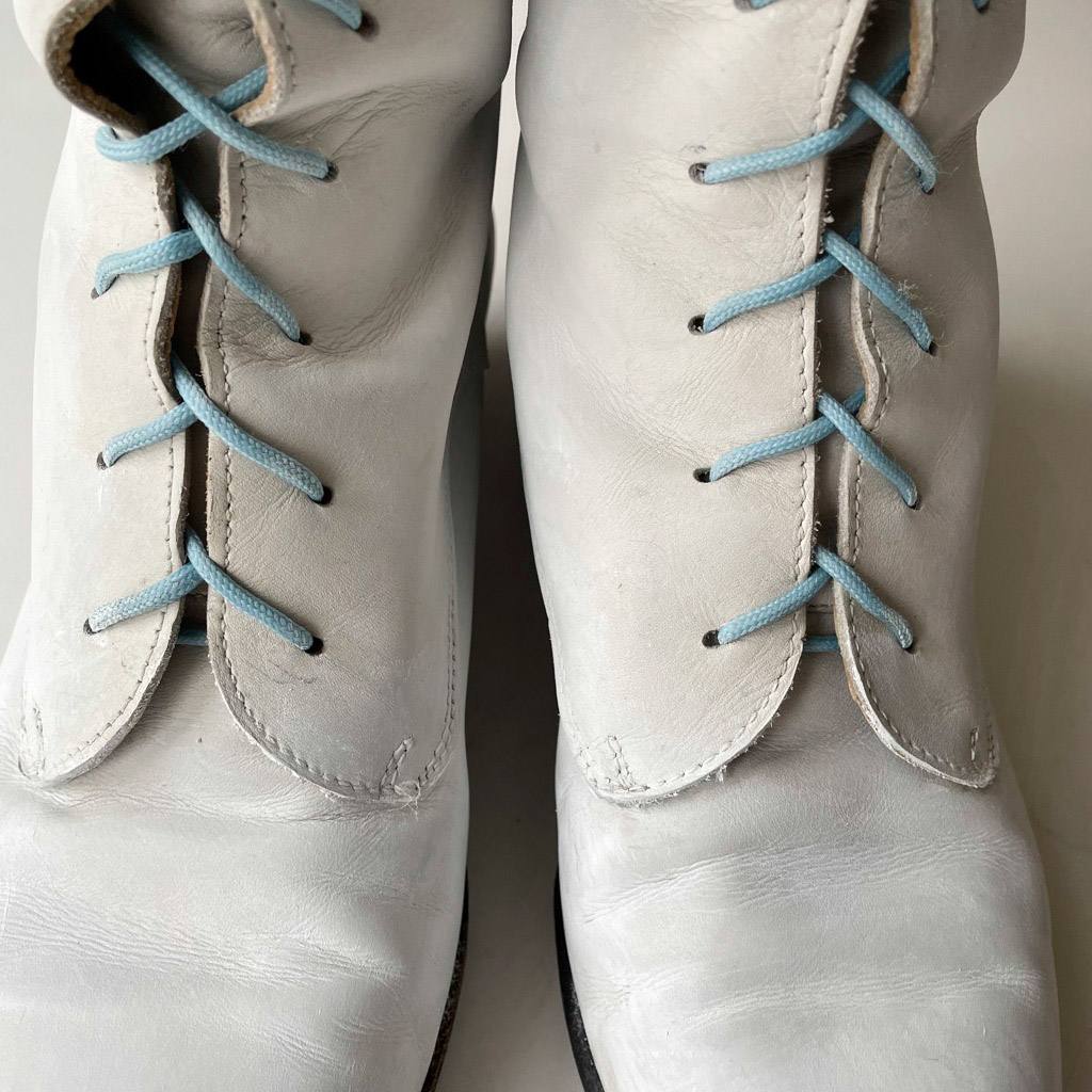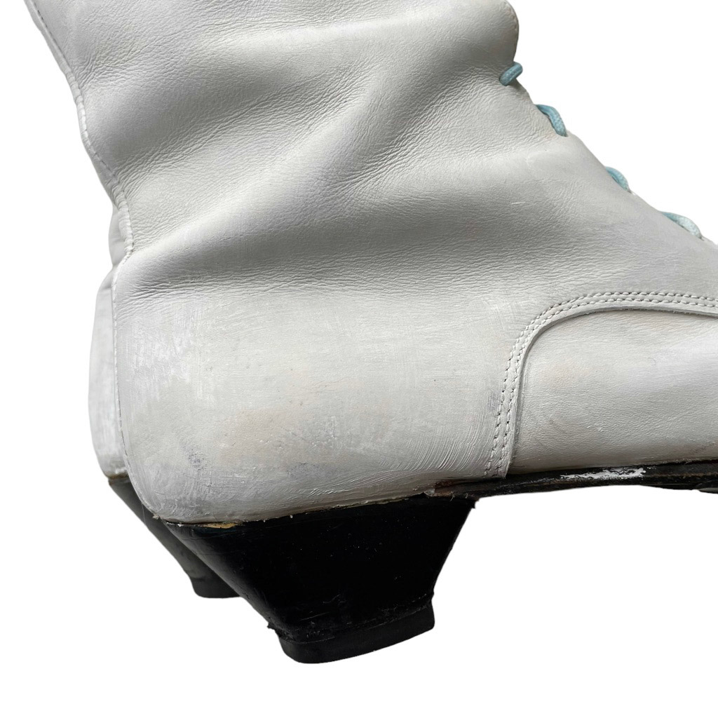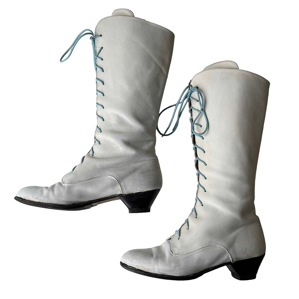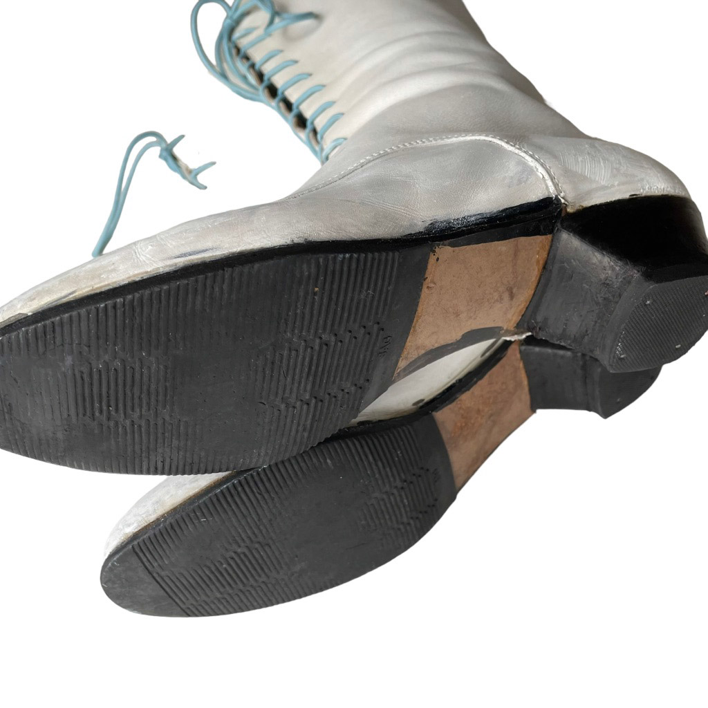 Bottes de majorette blanches en cuir, vintage années 70 Pointure 39, Hauteur 3,5cm, Hauteur tige 32cm