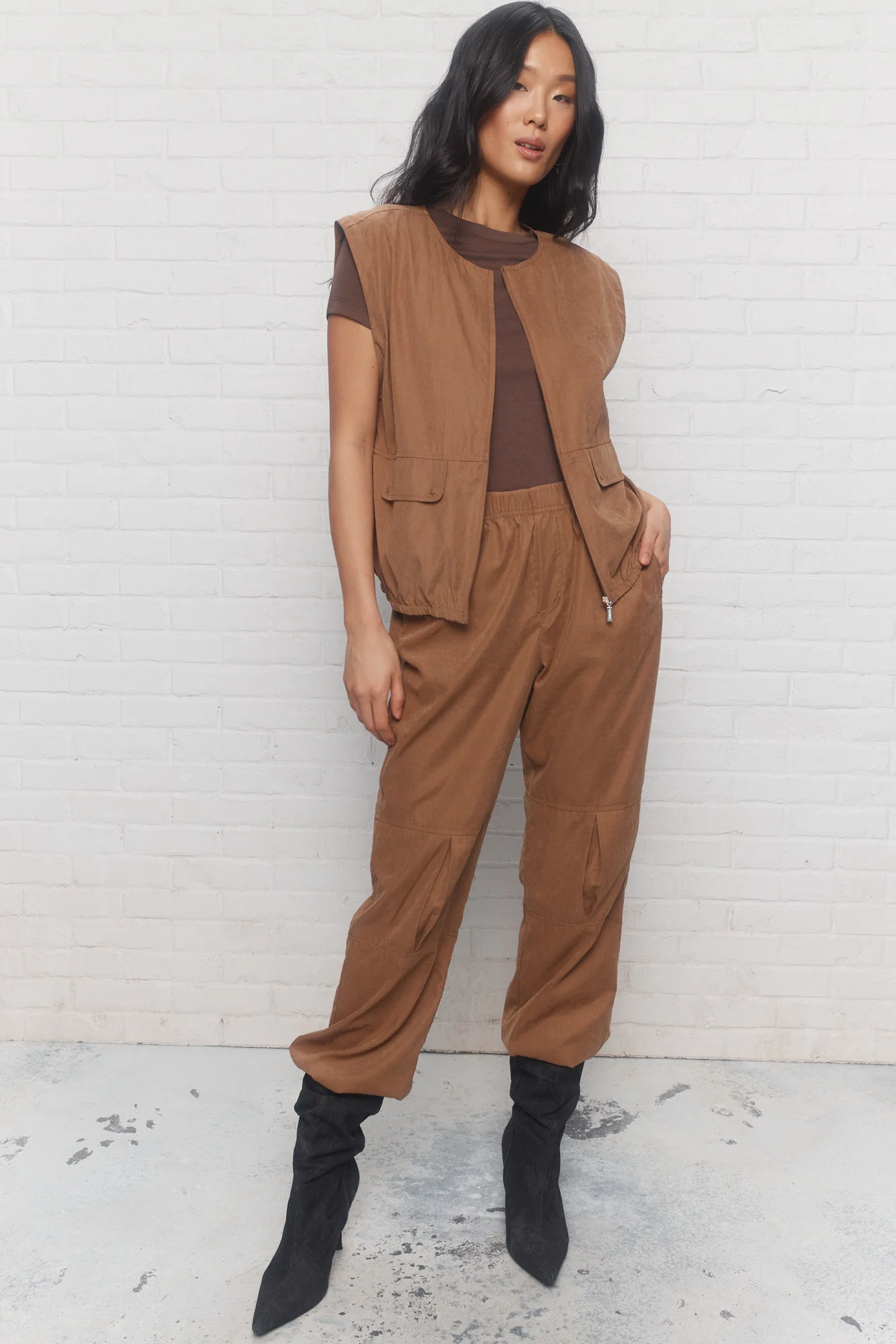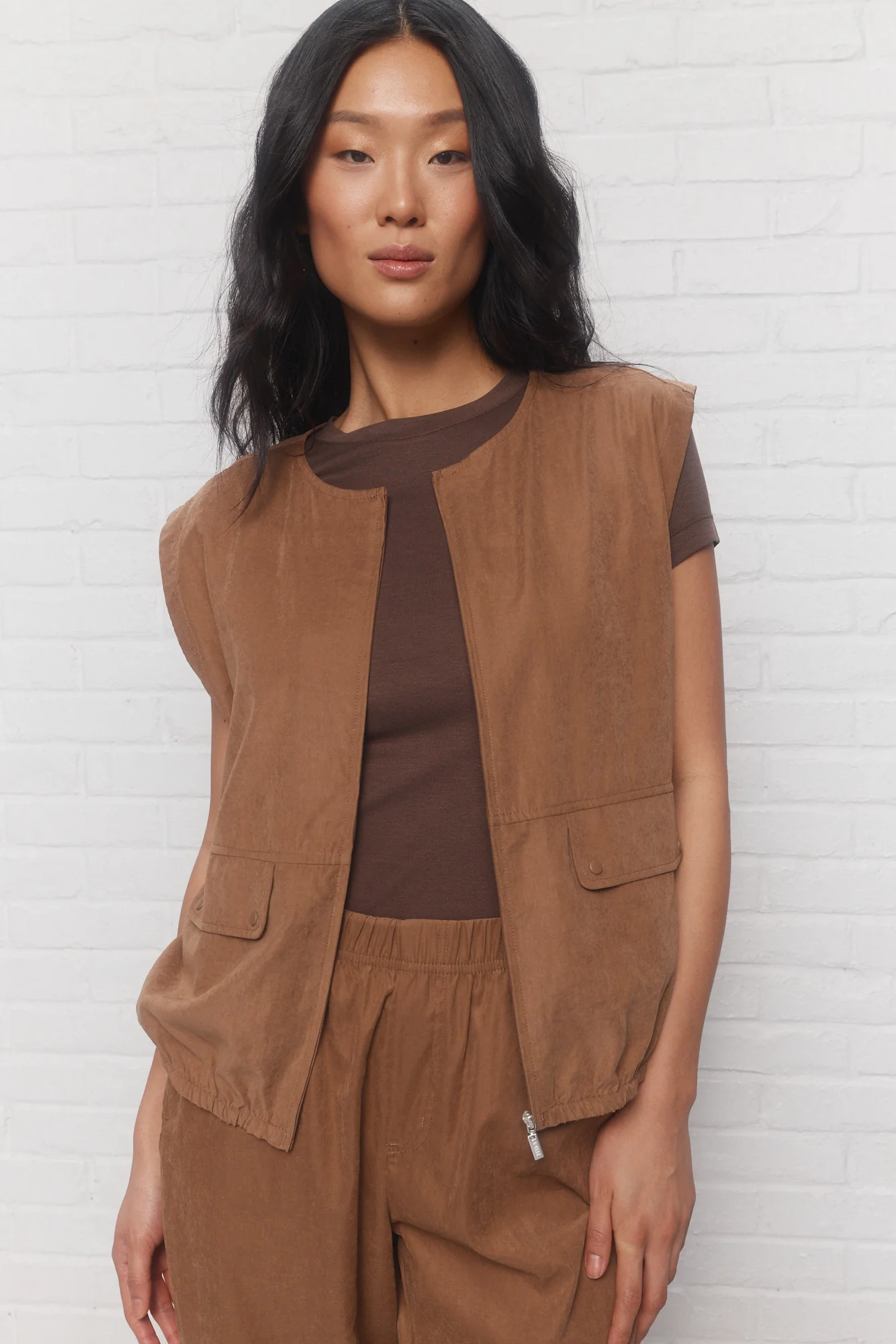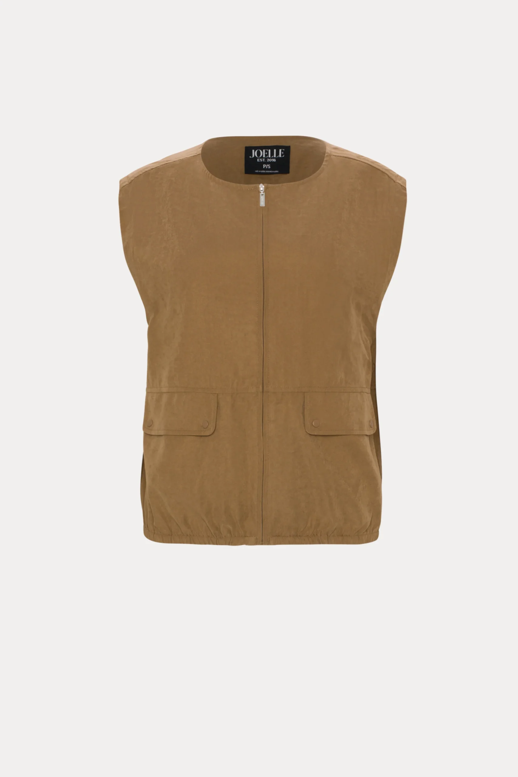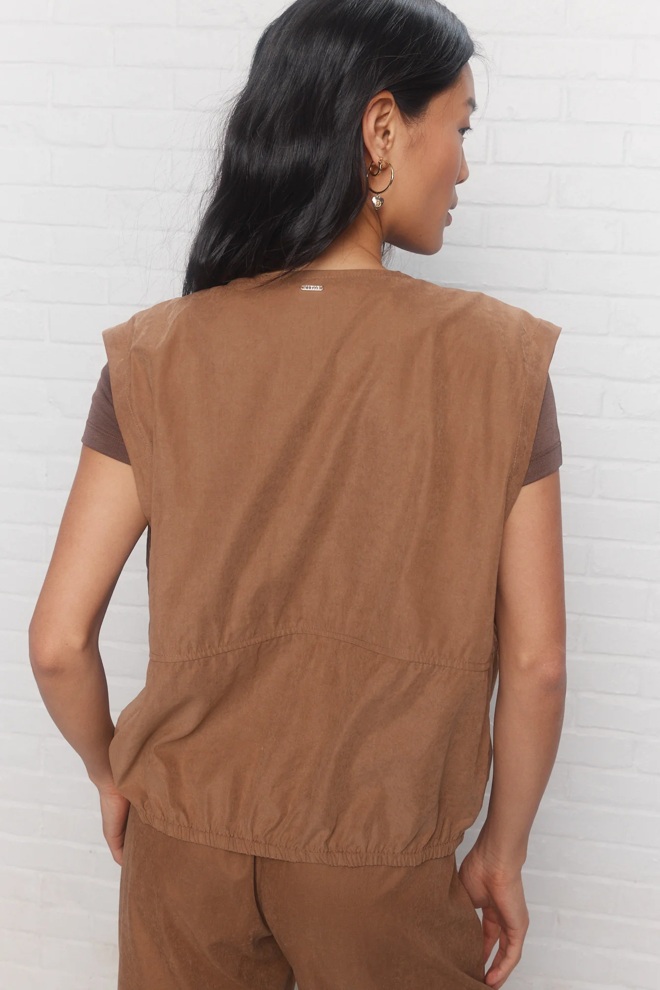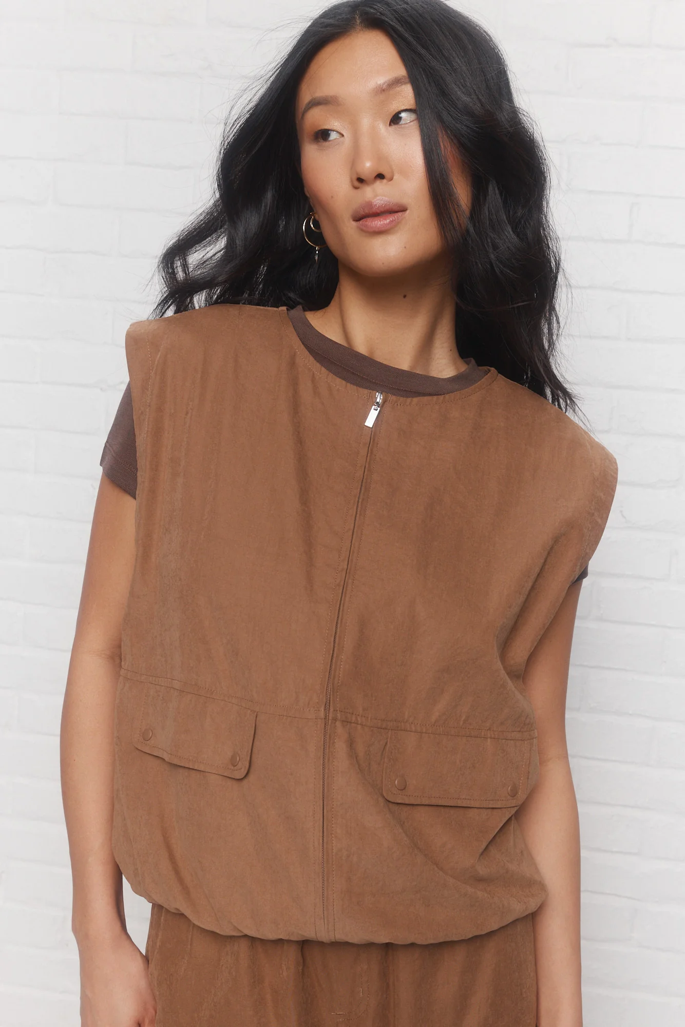 Voici la veste brune sans manches Briar à effet légèrement bouffant. Stylée, elle insuffle un look aventurière avec sa coupe ample, sa fermeture à glissière et ses poches au-devant.
