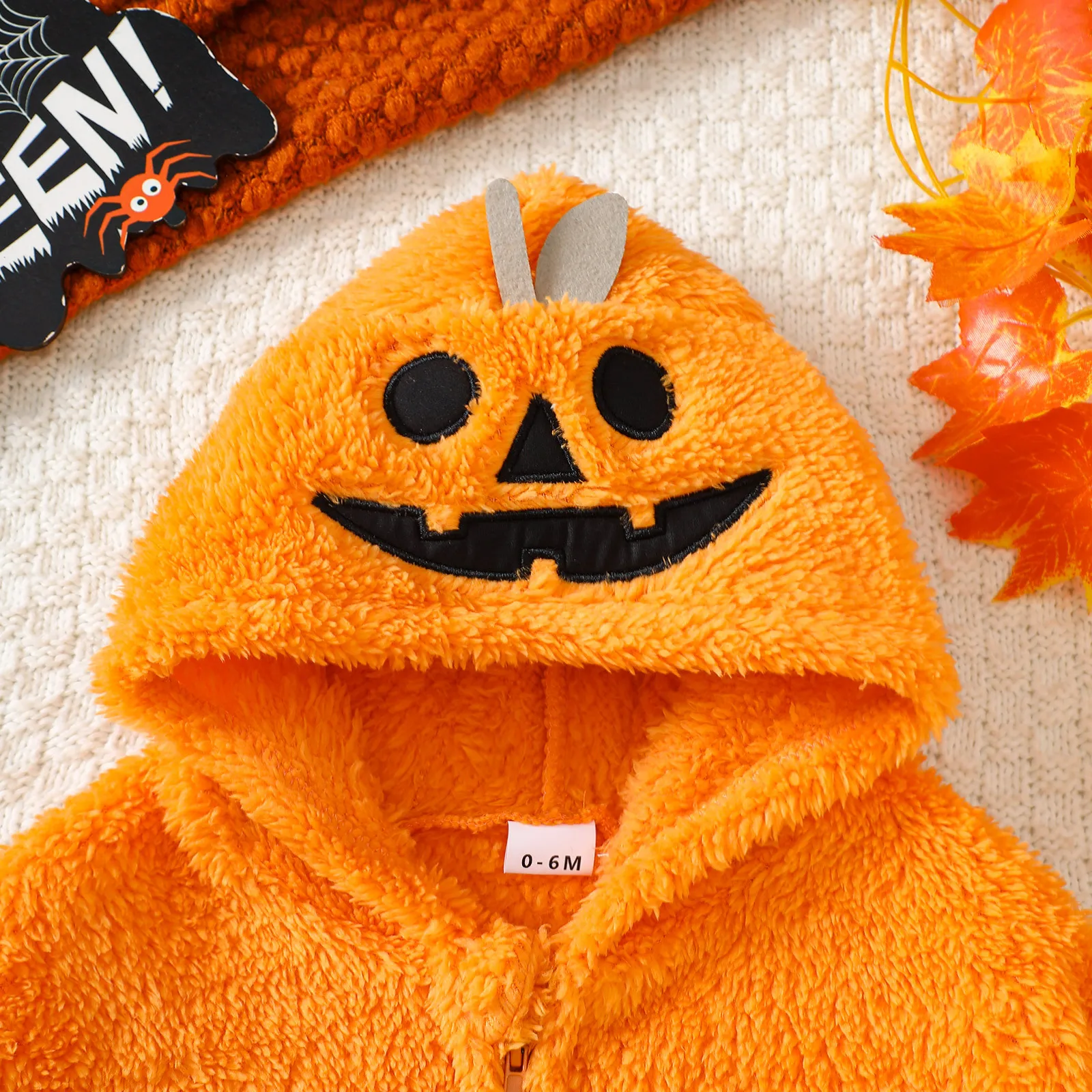 Cape Halloween bébé avec capuche : déguisement citrouille (orange) ou fantôme (blanc). En polyester doux et chaud, style polaire. Fermeture par boutons-pression. Idéale pour Halloween et toutes saisons. Conçue pour les 0-4 ans.
