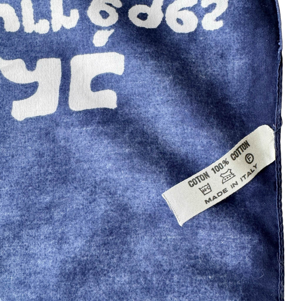 Carré coton bleu Courrèges Elephant Paris Vintage Carré % 100 coton fin marquée des logos et des signatures Courrèges Paris, Accessoire joli et rigolo vintage des années 1980, dimensions : 45 cm X 45 cm, Made in Italy, Neuf d’époque, jamais porté