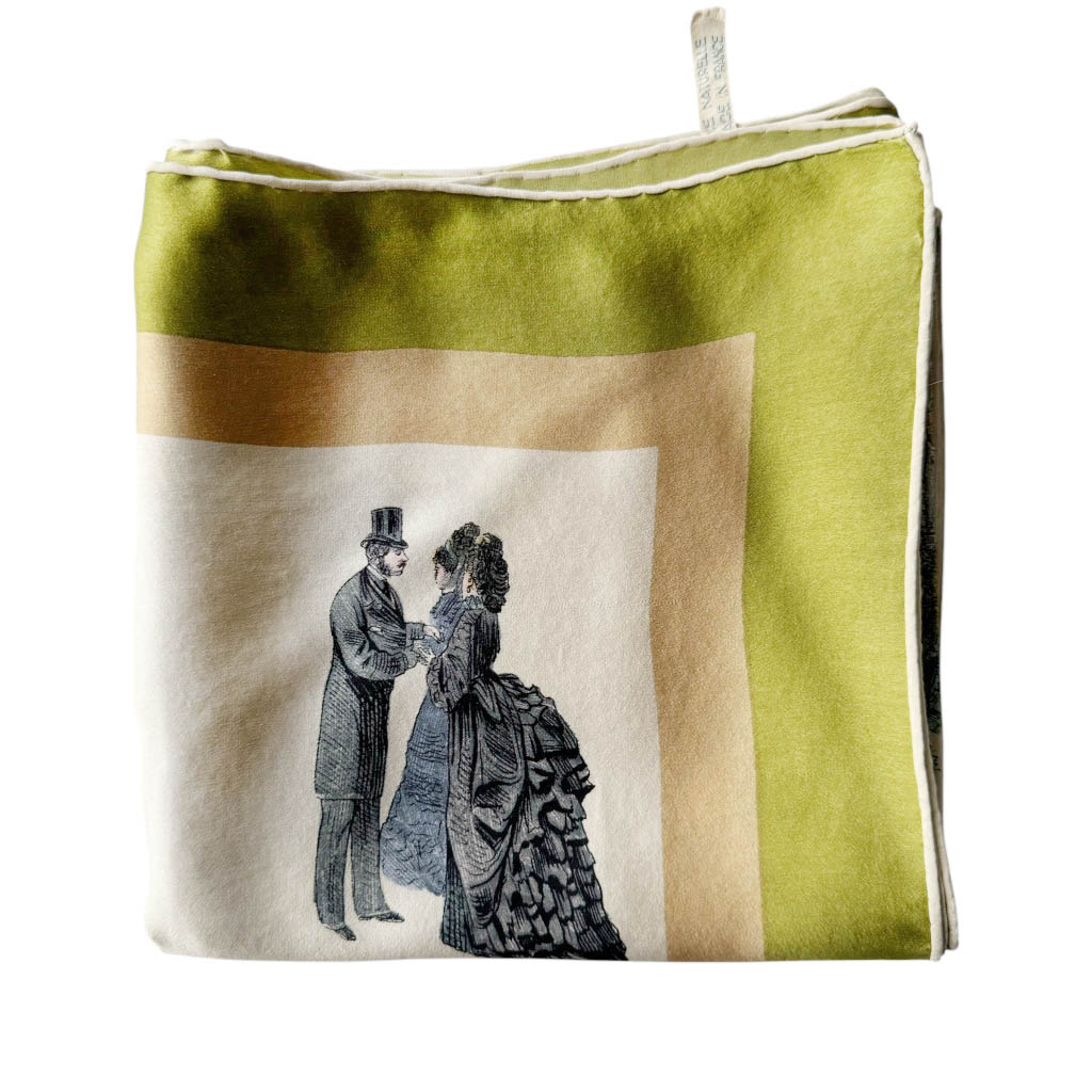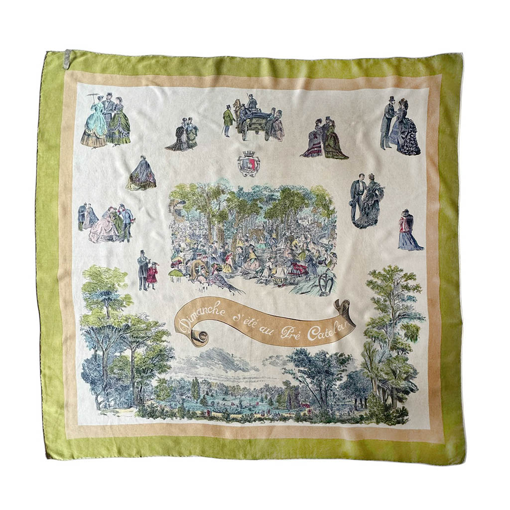 Carré soie Dimanche d’été Elephant Paris Vintage Dimensions : 84 X 87 cm carré en soie rouloté à la main, bon état, grand format, soie naturelle, Made in France