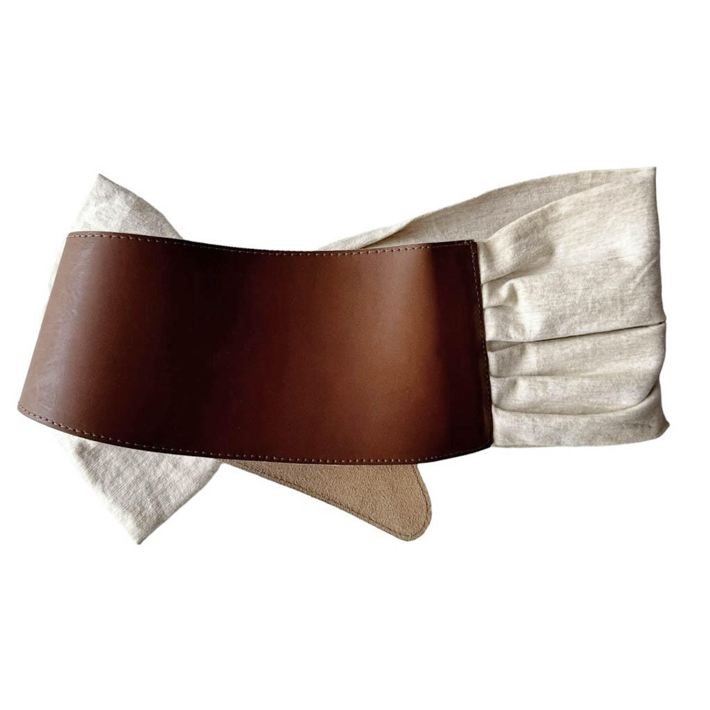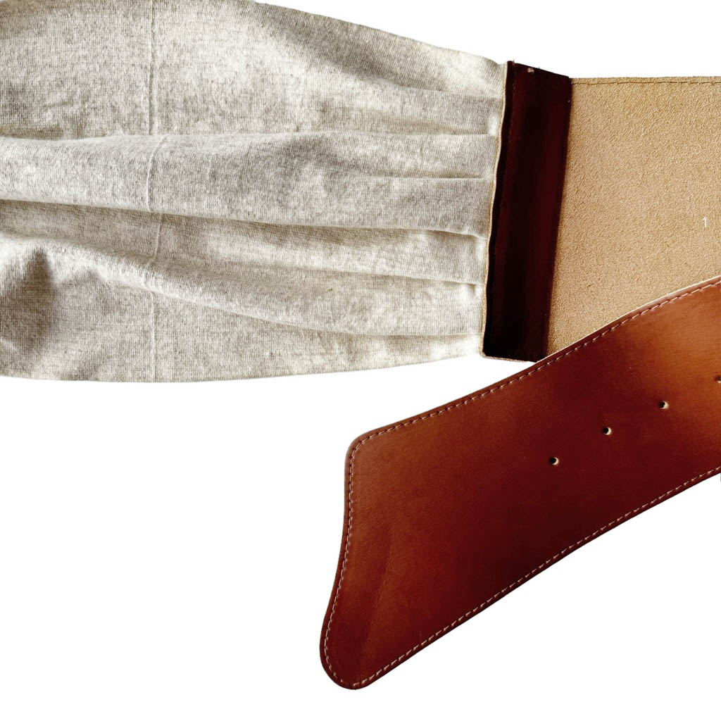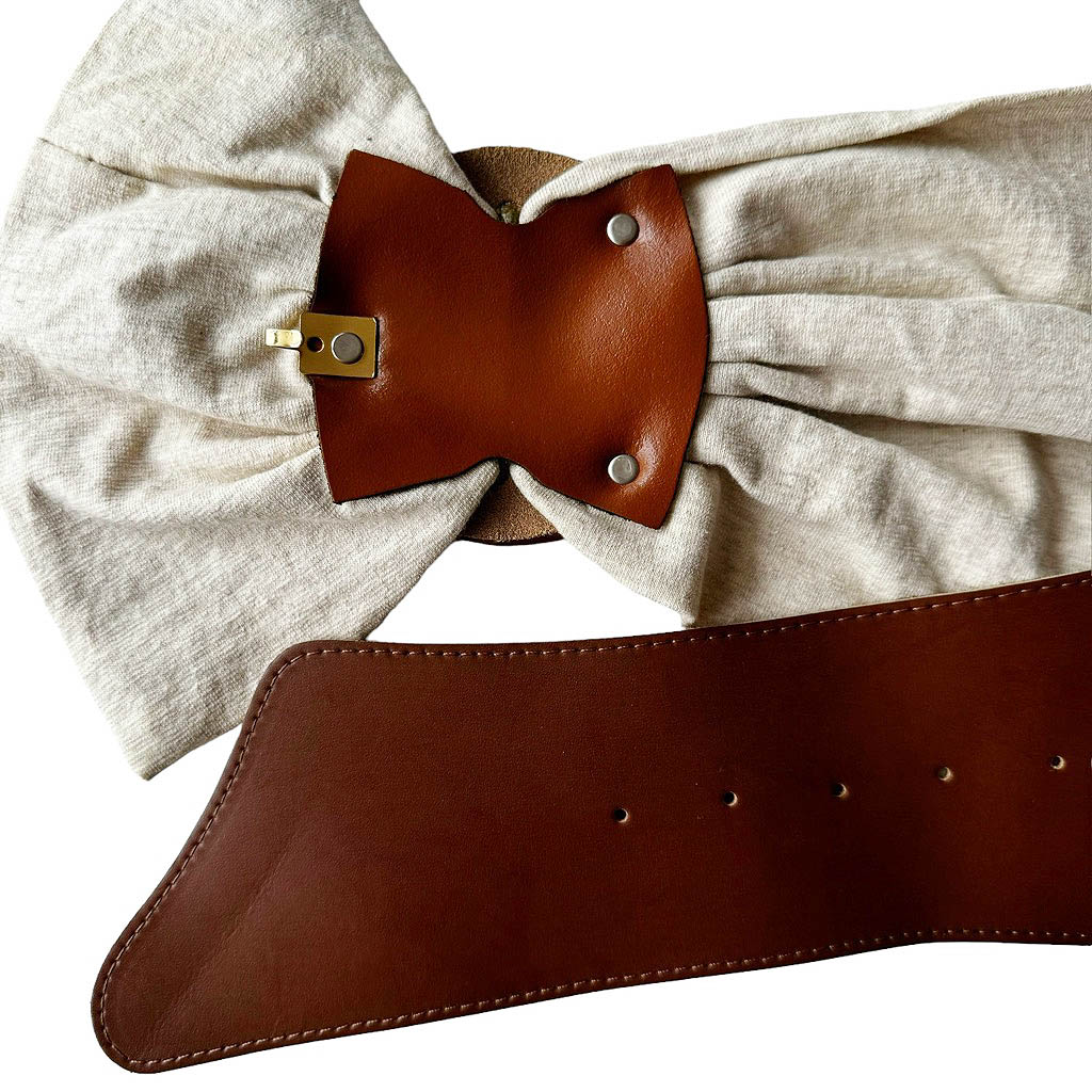 Ceinture beige en cuir et coton lycra années 80 Elephant Paris vintage Neuve d’époque, plus petite fermeture 33cm, Plus grande fermeture 40cm, Hauteur 16cm, taille 36
