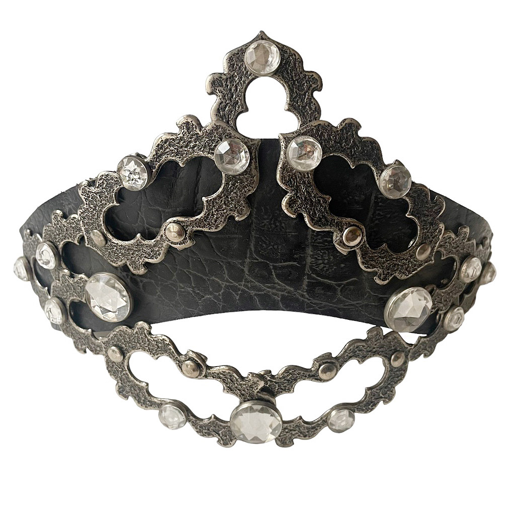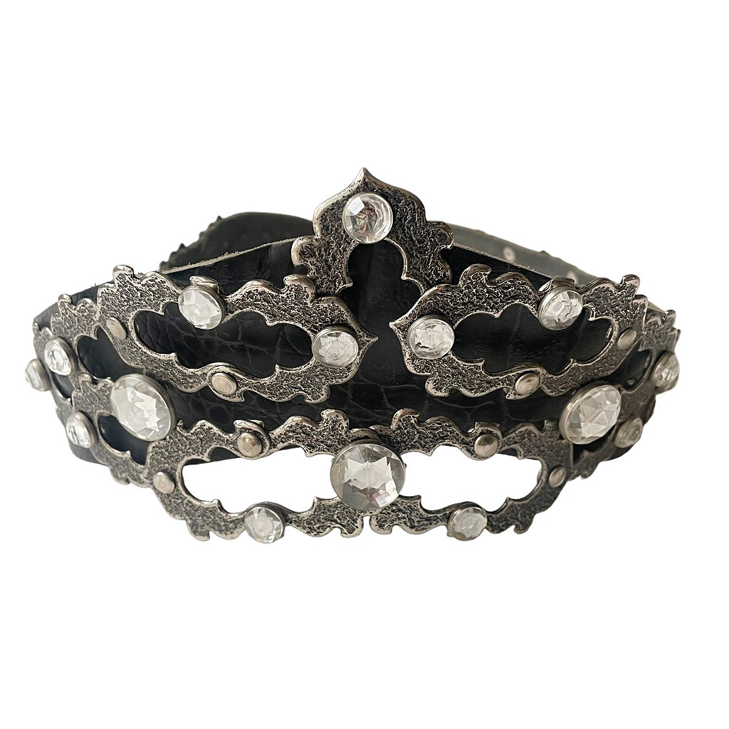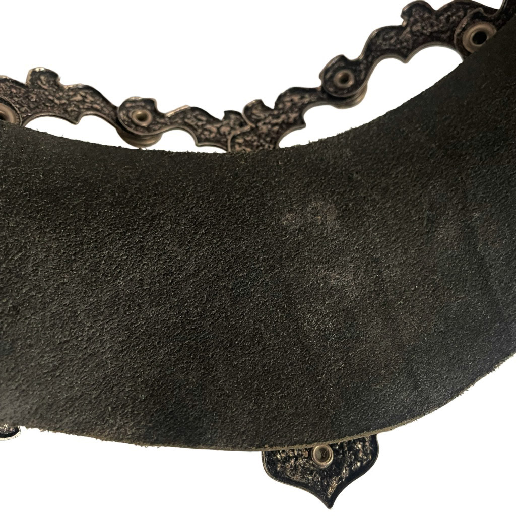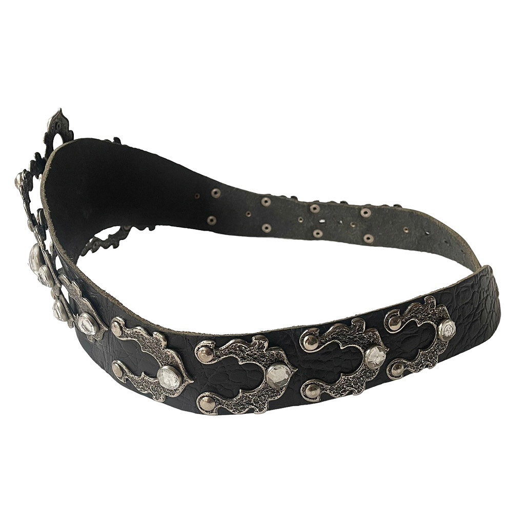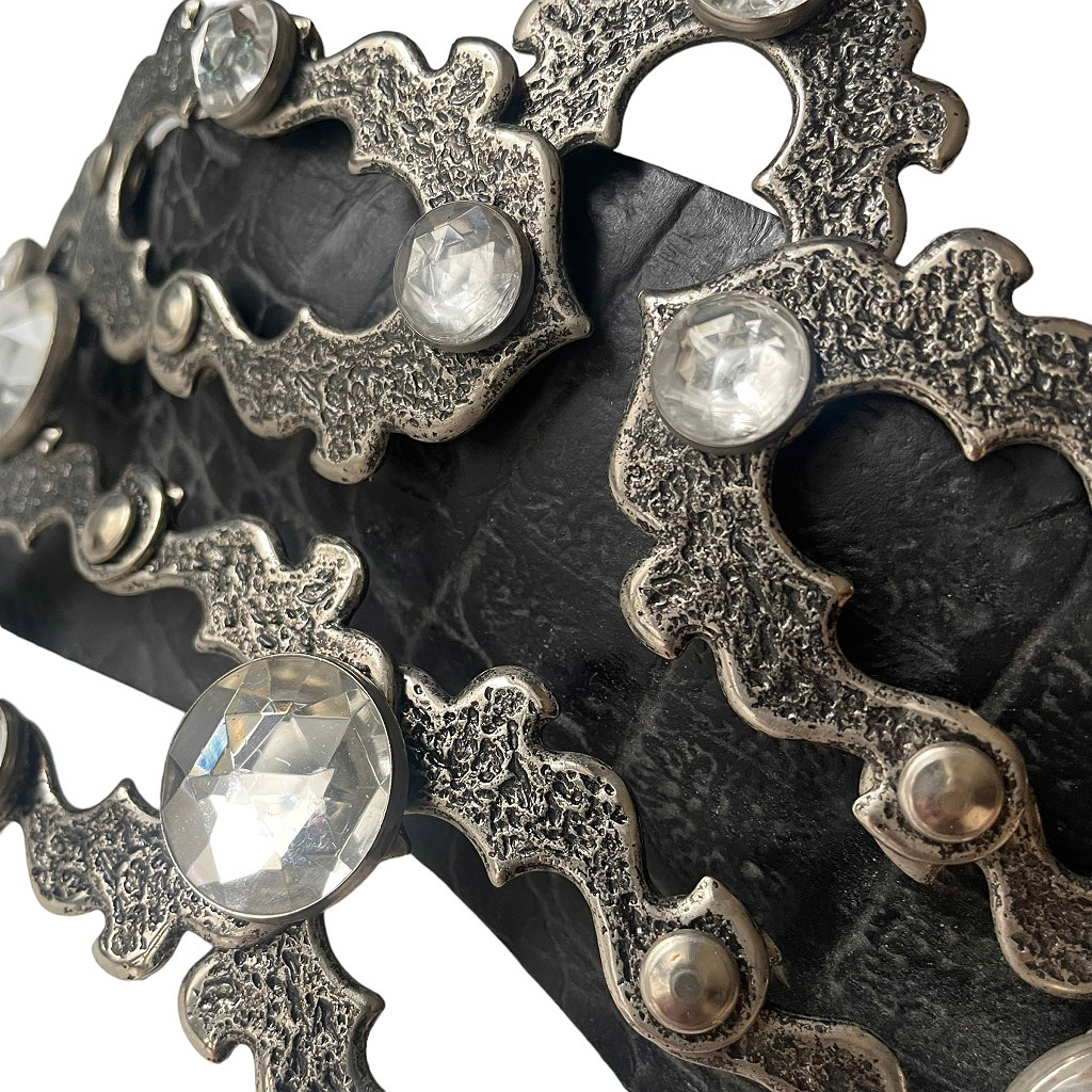 Ceinture bijoux cuir José Cotel articulée en cuir épais strass et métal argenté sculpté, José Cotel Elephant Paris vintage années 80, taille 34/36