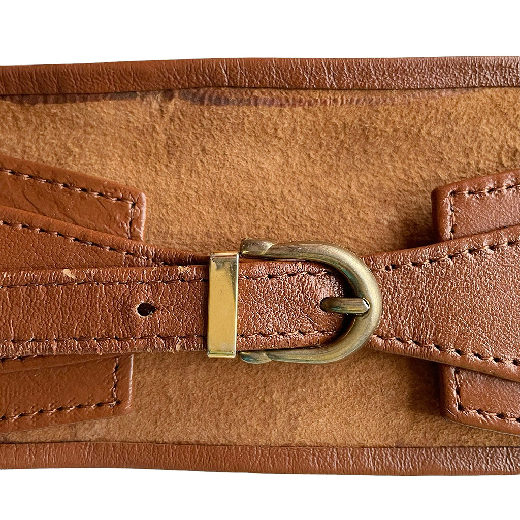 Ceinture camel large en cuir souple, vintage années 70/80 Hauteur 7cm, Plus petite largeur 35cm, Plus grande largeur 38cm, Taille globale 36
