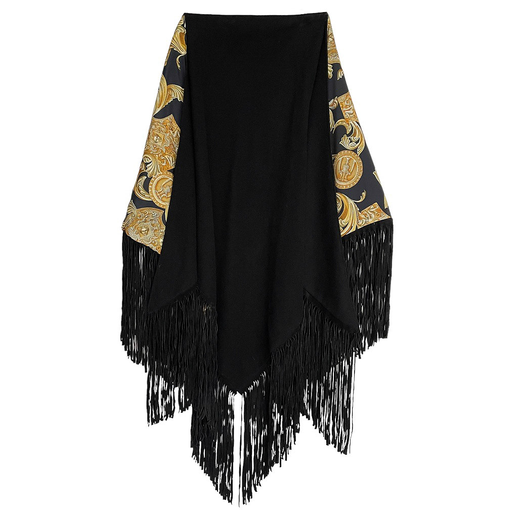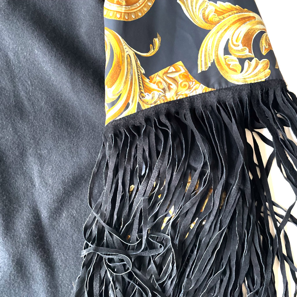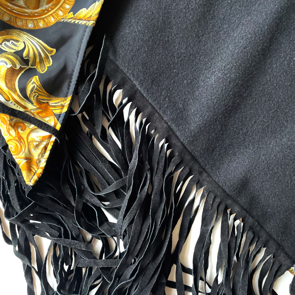 Châle noir en lainage et daim, franges en daim doublé en satin imprimé vintage années 80 Elephant Paris Vintage Longueur 103cm, Longueur avec franges 136cm, Taille unique