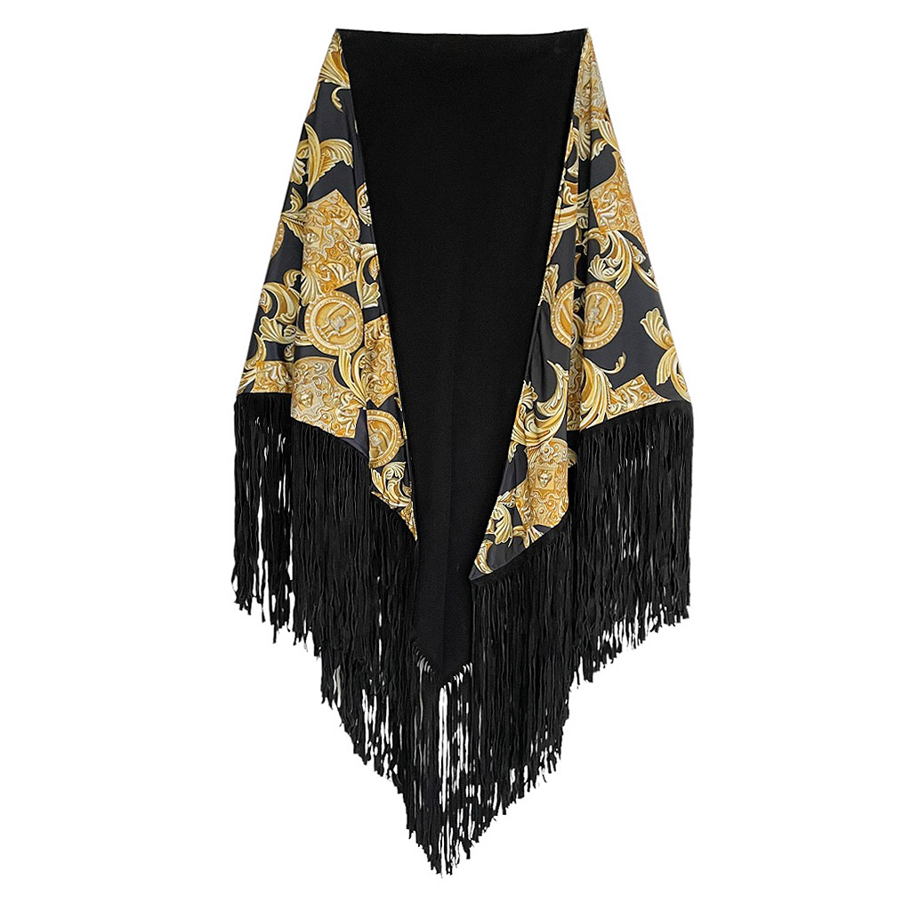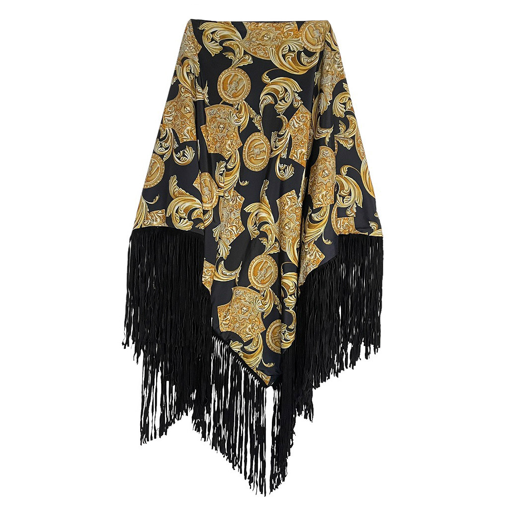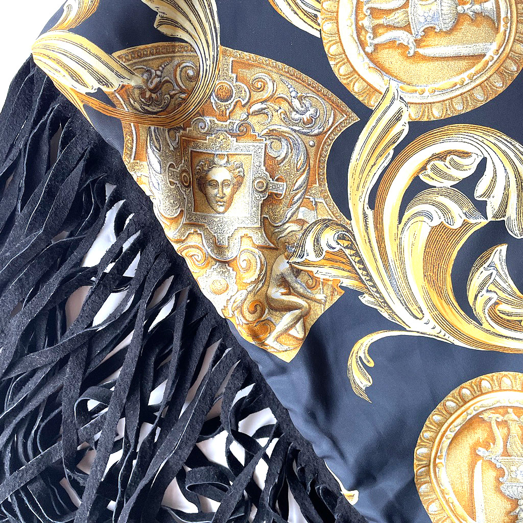 Châle noir en lainage et daim, franges en daim doublé en satin imprimé vintage années 80 Elephant Paris Vintage Longueur 103cm, Longueur avec franges 136cm, Taille unique