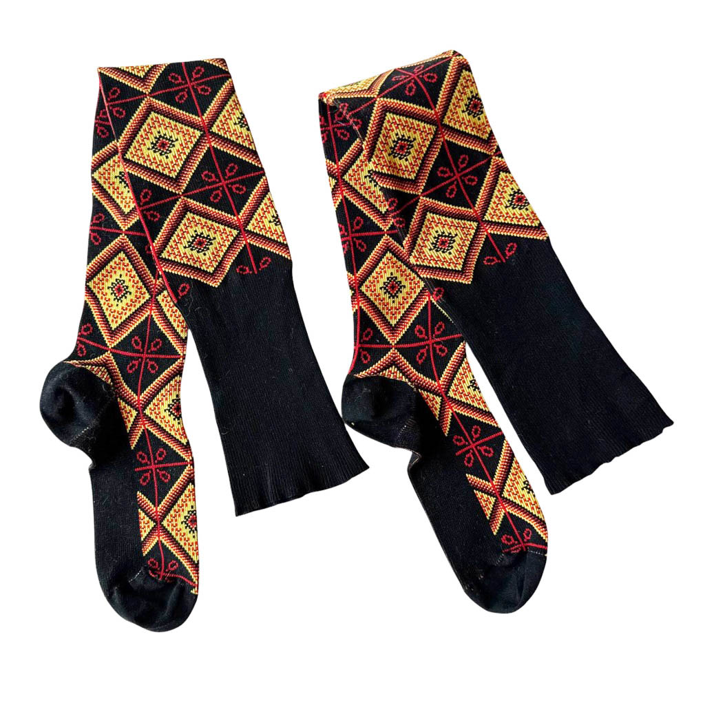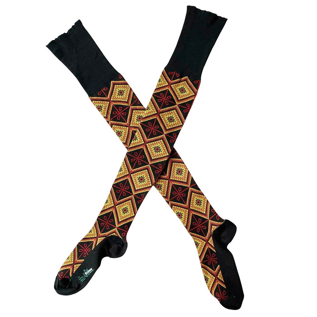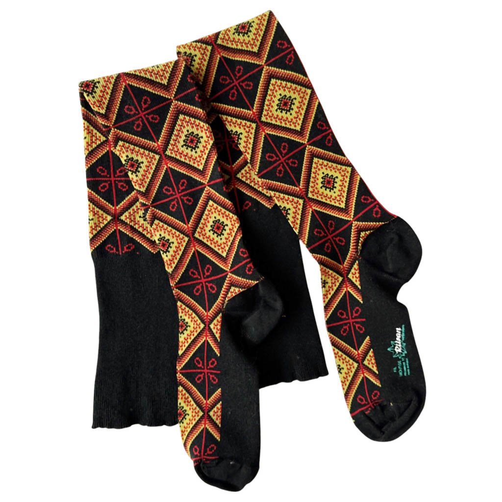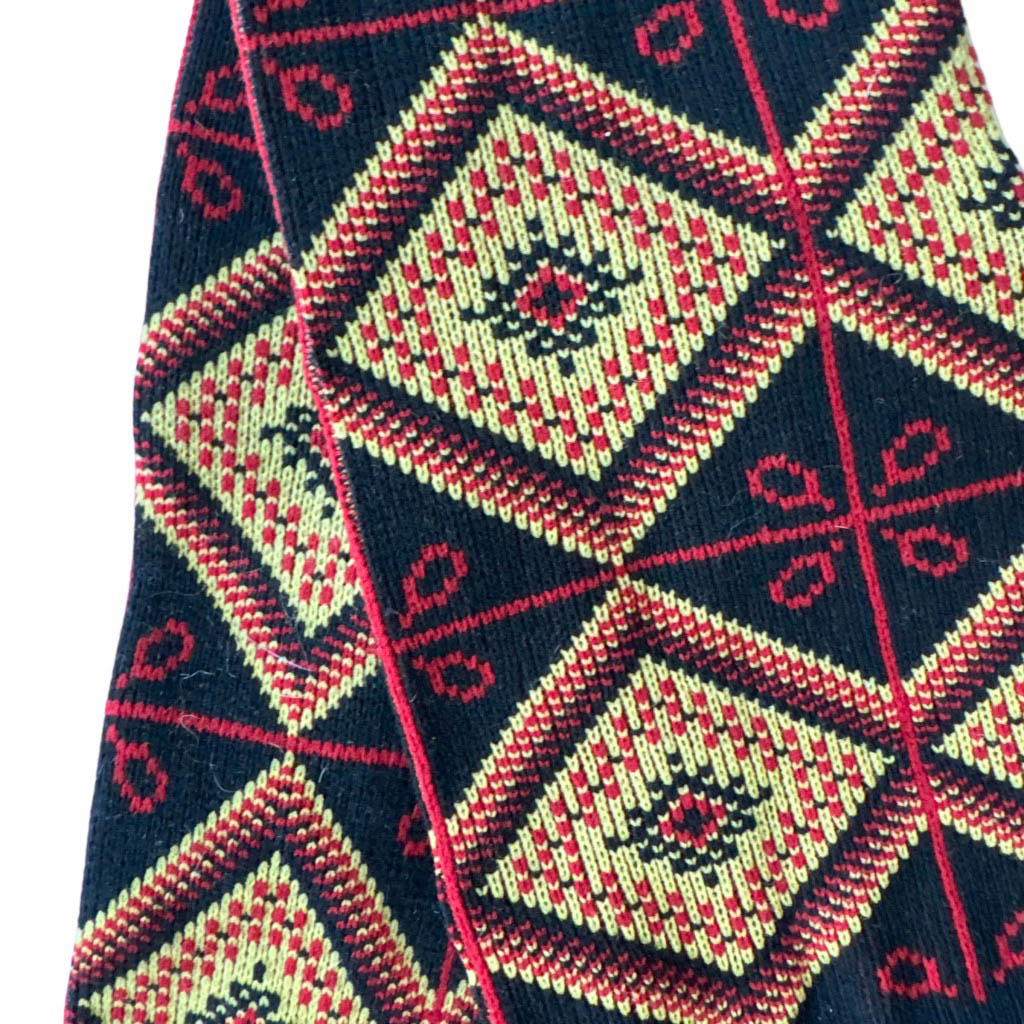 Chaussettes hautes graphiques 70s Elephant Paris Vintage tissage losanges et lignes rouges et jaunes sur fond noir, Rilsan Marque déposée, fil mousse polyamide, made in France, neuves d’époque années 70, fil légèrement détendu en haut de la tige Dimensions : taille unique, hauteur de la tige 60 c m,