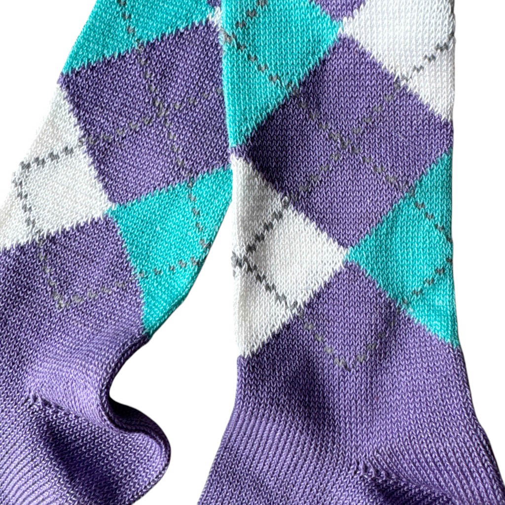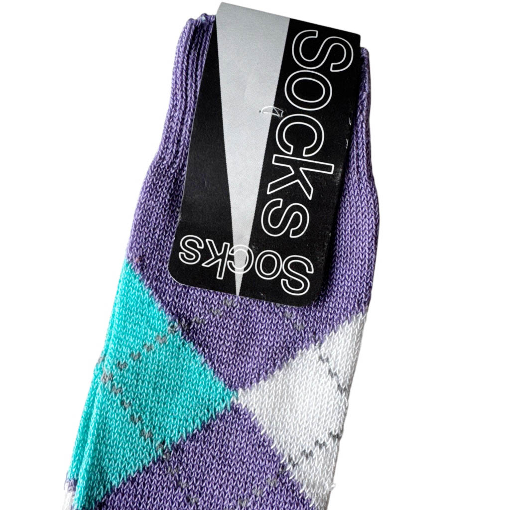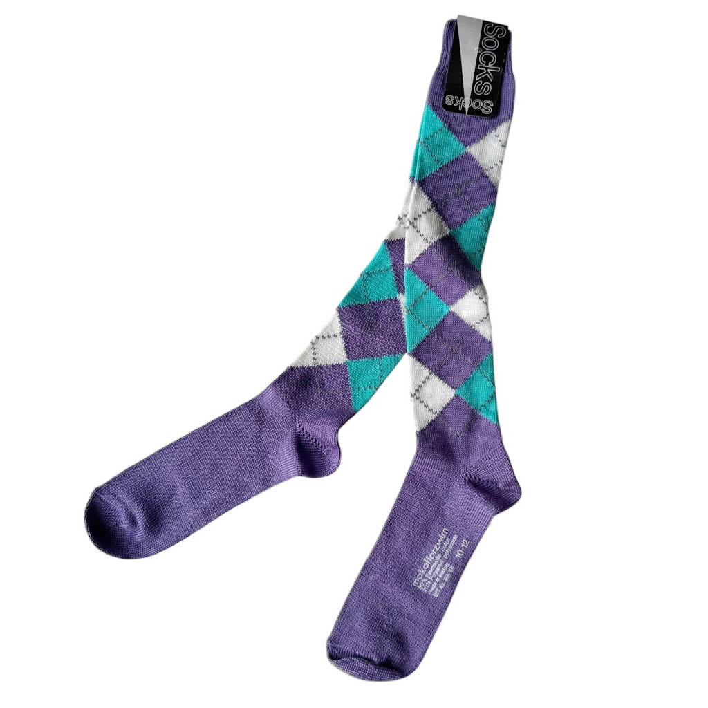 Chaussettes jacquard Socks Elephant Paris Vintage Makoflorzwin, Made in Austria, fabriquées en Autriche, neuves d’époque, 80 % de coton baumwolle et 20 % de polyamide, motif jacquard turquoise violet gris et blanc Pointure 10 / 12, 37 / 38, coton fin, brillant et confortable