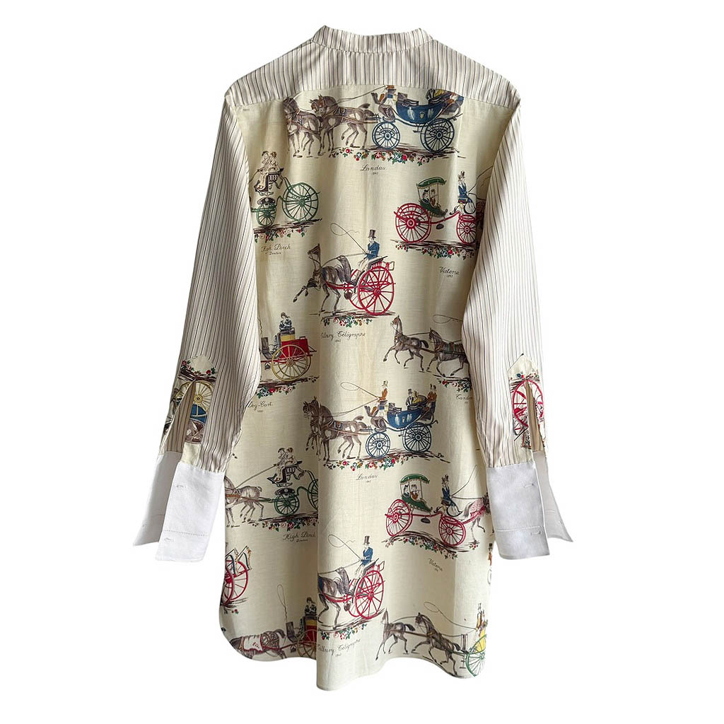 Chemise coton Plastron cochers Elephant Paris Design Ce design est réalisé avec des matériaux anciens, draps de coton fin imprimé, le plastron est en drap de coton blanc ajouré, 1 0 0 % coton, et satin rayé ancien pour tailoring, les boutons bijoux sont dépareillés, les longs poignets se ferment avec des boutons de manchettes, ils ne sont pas fournis avec cette chemise Cette pièce unique est entièrement fabriquée à Paris Mesures prises à plat : Epaules : 4 3 c m, Poitrine : 5 9 c m, Longueur devant avec le col : 7 1 c m, Longueur dos…
