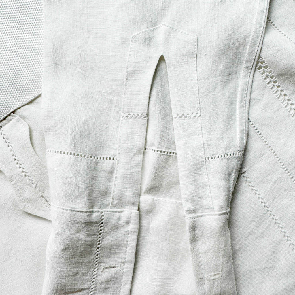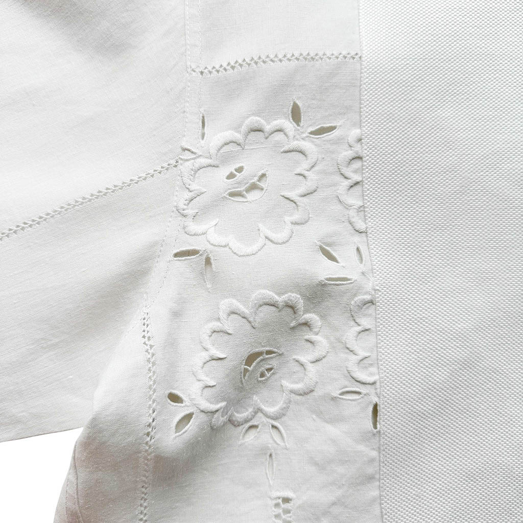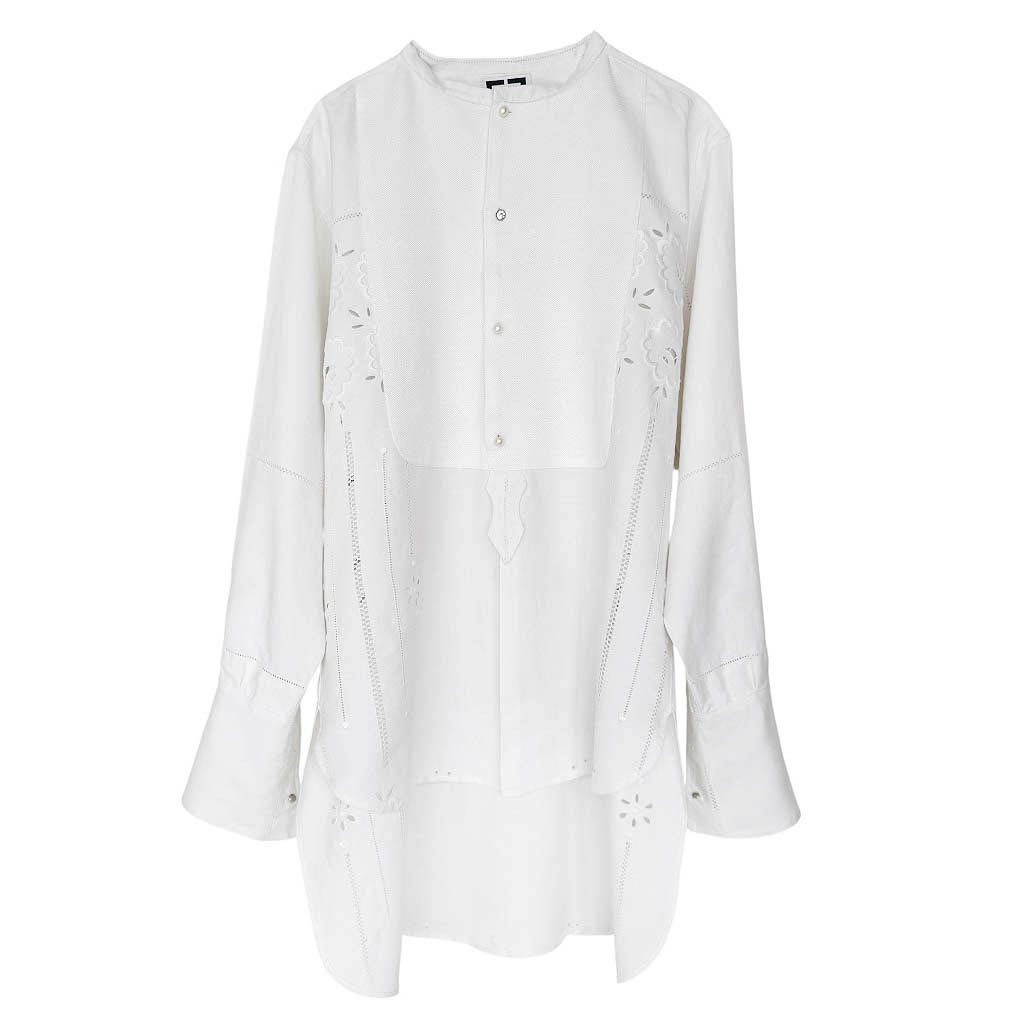 Chemise coton Plastron drap brodé blanc Elephant Paris Design Ce design est réalisé avec des matériaux anciens, draps de coton brodé et ajouré, 1 0 0 % coton, le plastron est en pur coton piqué de coton nid d’abeille, les boutons bijoux sont dépareillés, les longs poignets se ferment avec des boutons de manchettes dépareillés également, ils sont fournis avec cette chemise Cette pièce unique est entièrement fabriquée à Paris Mesures prises à plat : Epaules : 4 8 c m, Poitrine : 6 2 c m, Longueur devant avec le col : 7 4 c m, Longueur dos avec…