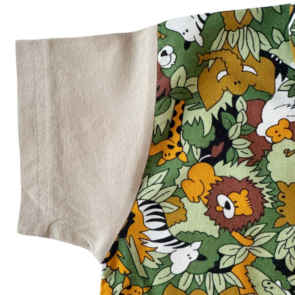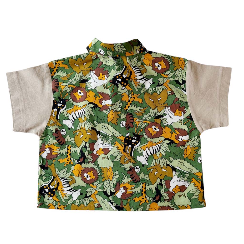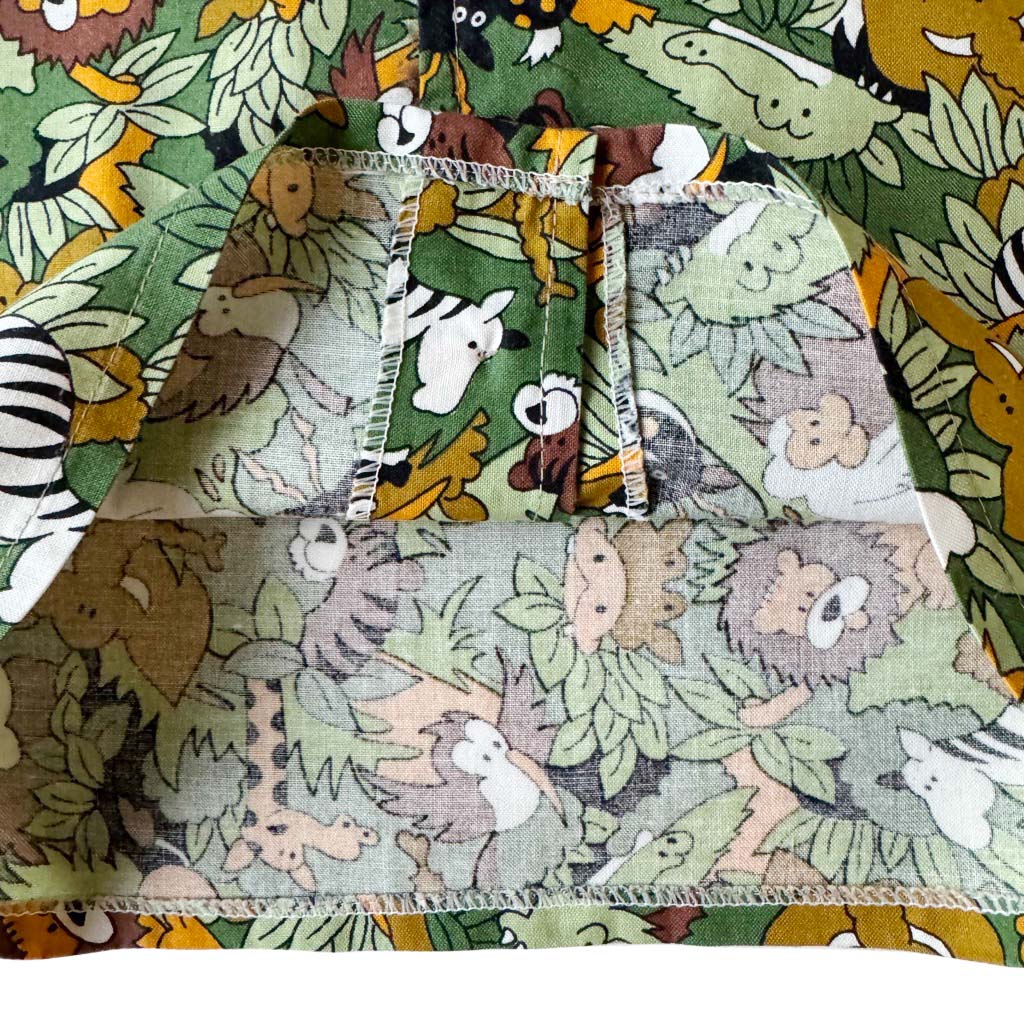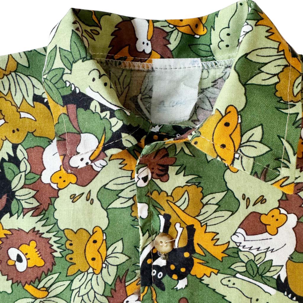 Chemisette coton jungle 2 ans Elephant Paris Vintage Chemisette coton Tony Boy Tintin Elephant Paris Vintage Chemise manches courtes simple et sans poche motif jungle et ses animaux vintage des années 80, 100 % pur coton, boutonnage devant, manches extensibles en jersey de coton, et corps en coton semi-épais, taille 2ans Très bon état général, Mesures à plat : Epaules 35 cm, Poitrine 53 cm, Longueur dos 29 cm