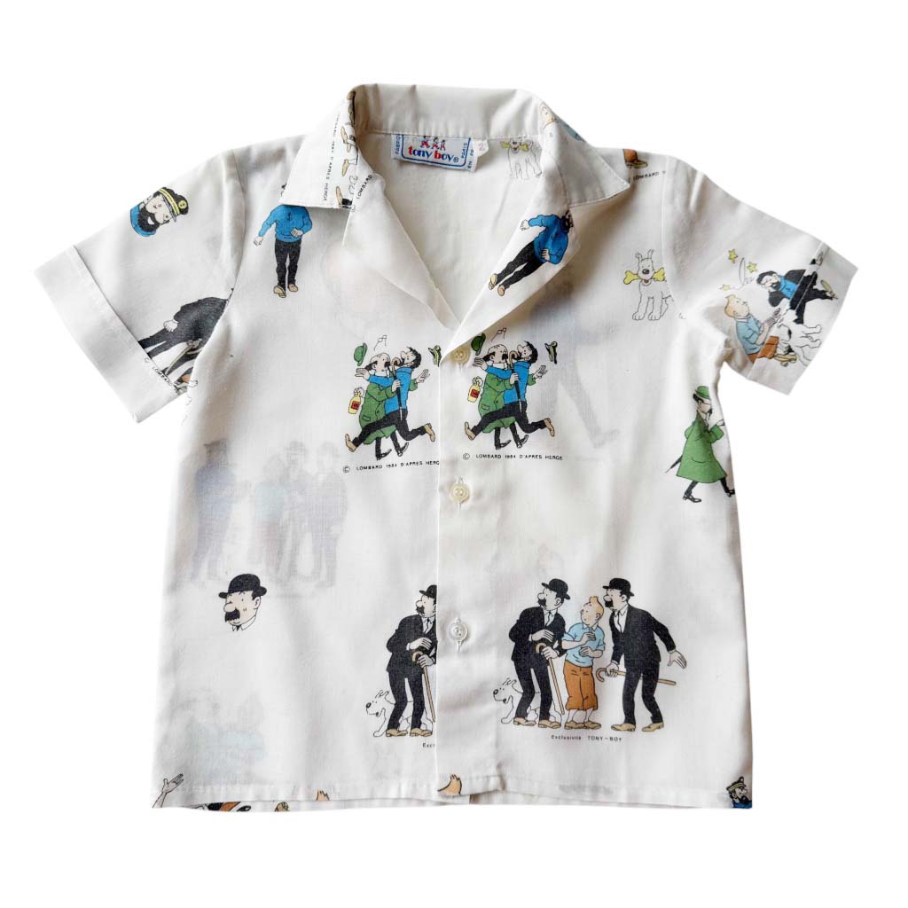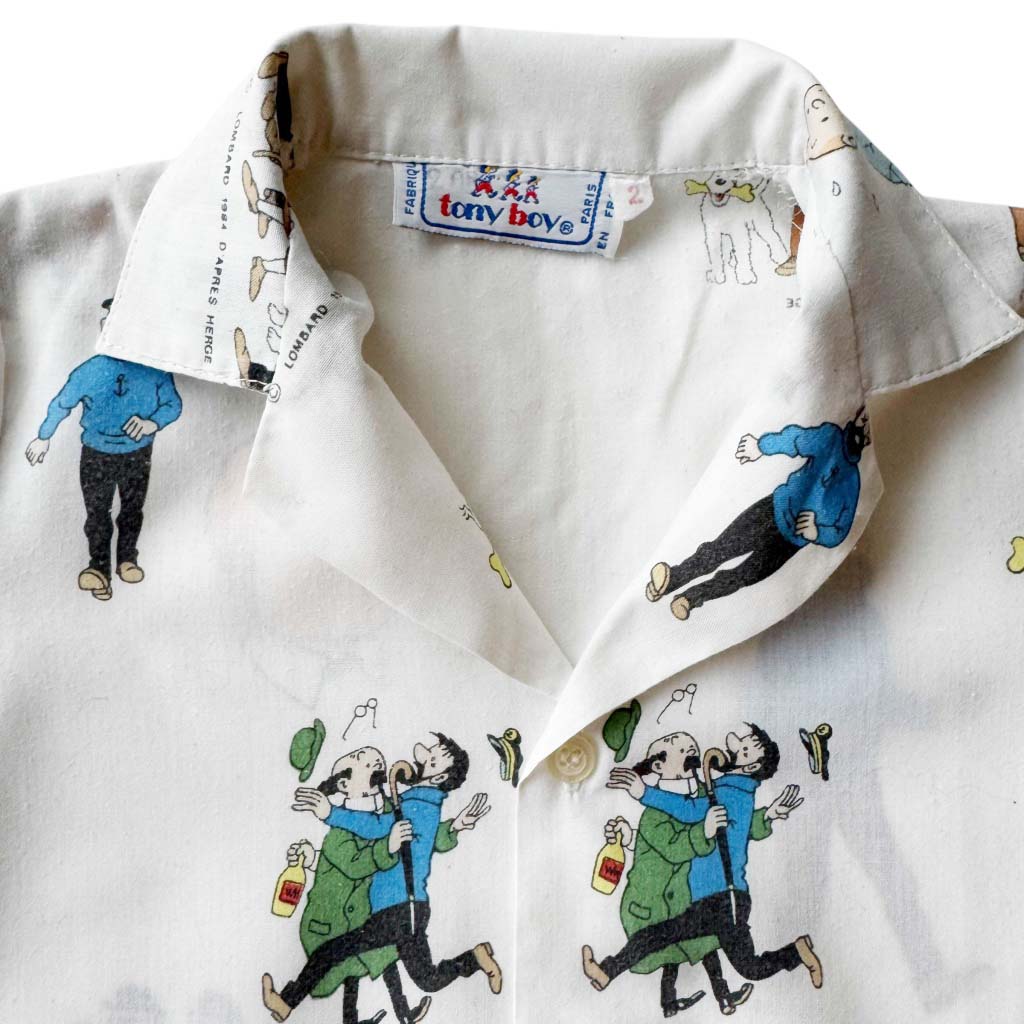 Chemisette coton Tony Boy Tintin Elephant Paris Vintage Chemise manches courtes simple et sans poche Tintin et Milou sont entourés de tous les personnages clés des bandes dessinées Tintin, fabriquée en France par la marque Tony Boy Paris, vintage des années 80, 100 % pur coton fin, boutonnage devant, taille 2ans Bon état général, Mesures à plat : Epaules 35 cm, Poitrine 53 cm, Longueur dos 29 cm