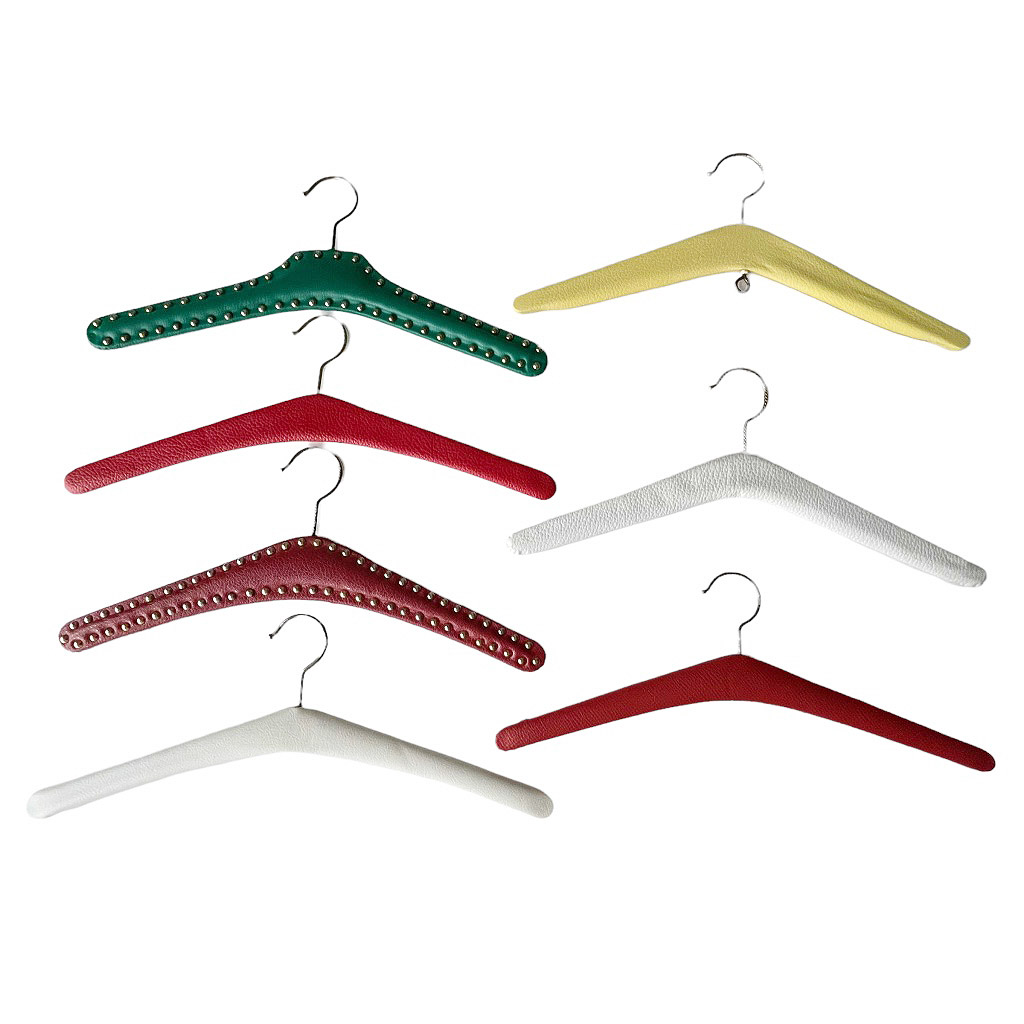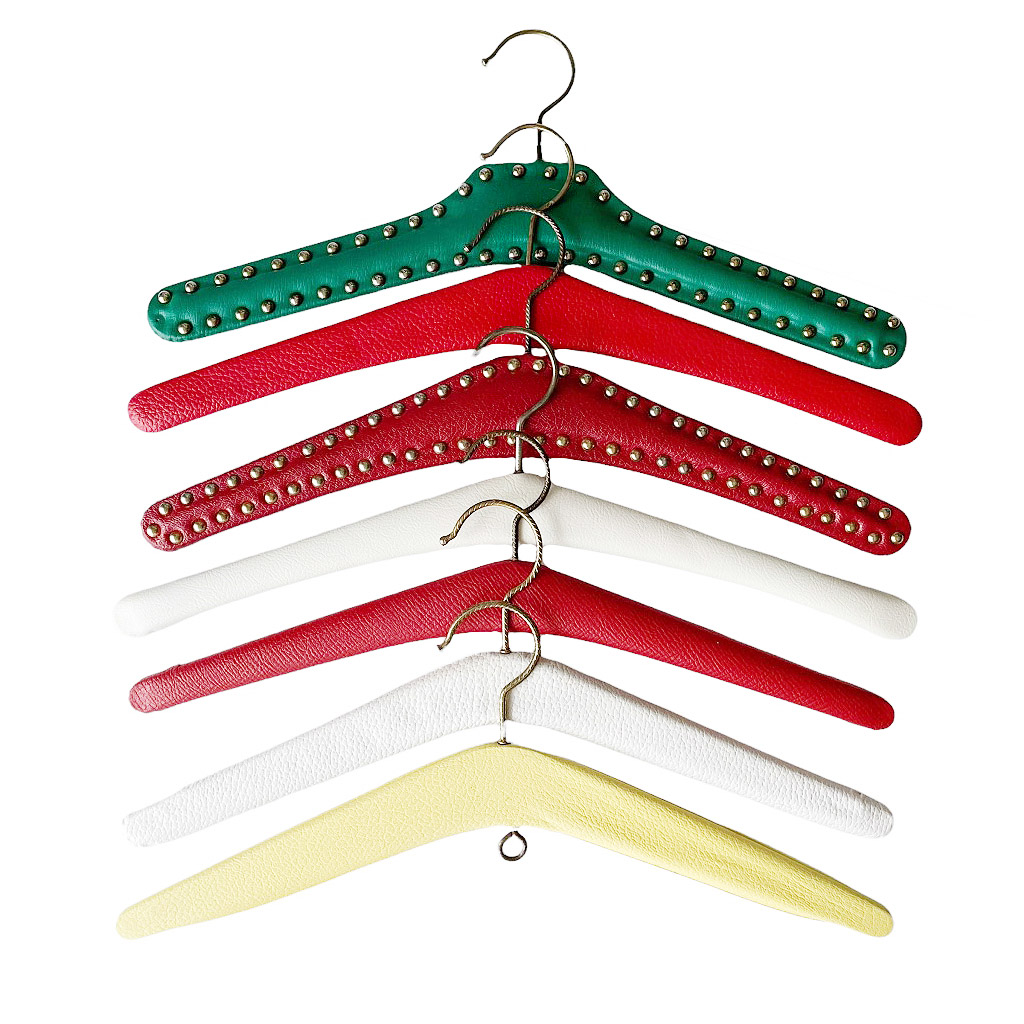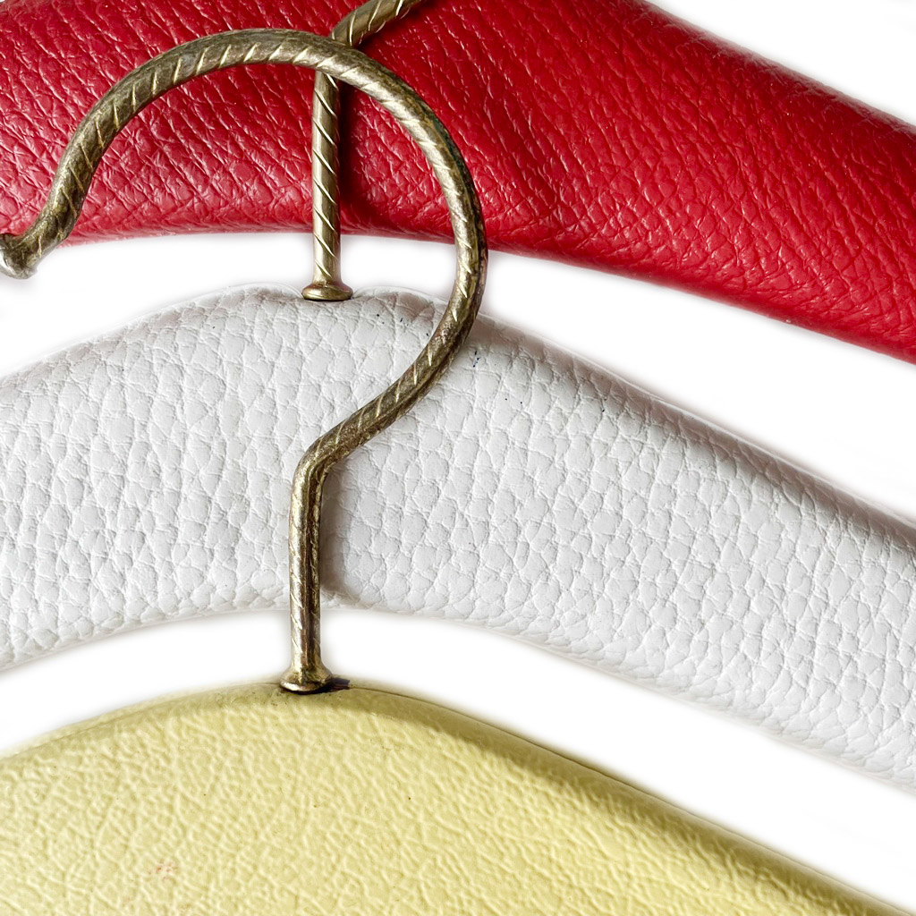 Cintres 50s en vinyl Cintres vintages des années 1 9 5 0, bois habillé de vinyl, cloutés pour certains en métal doré, Taille unique, très bon état général Accessoires très sympas pour harmoniser et rendre glamour l’habillage d’un dressing ou d’un vestiaire public ou privé