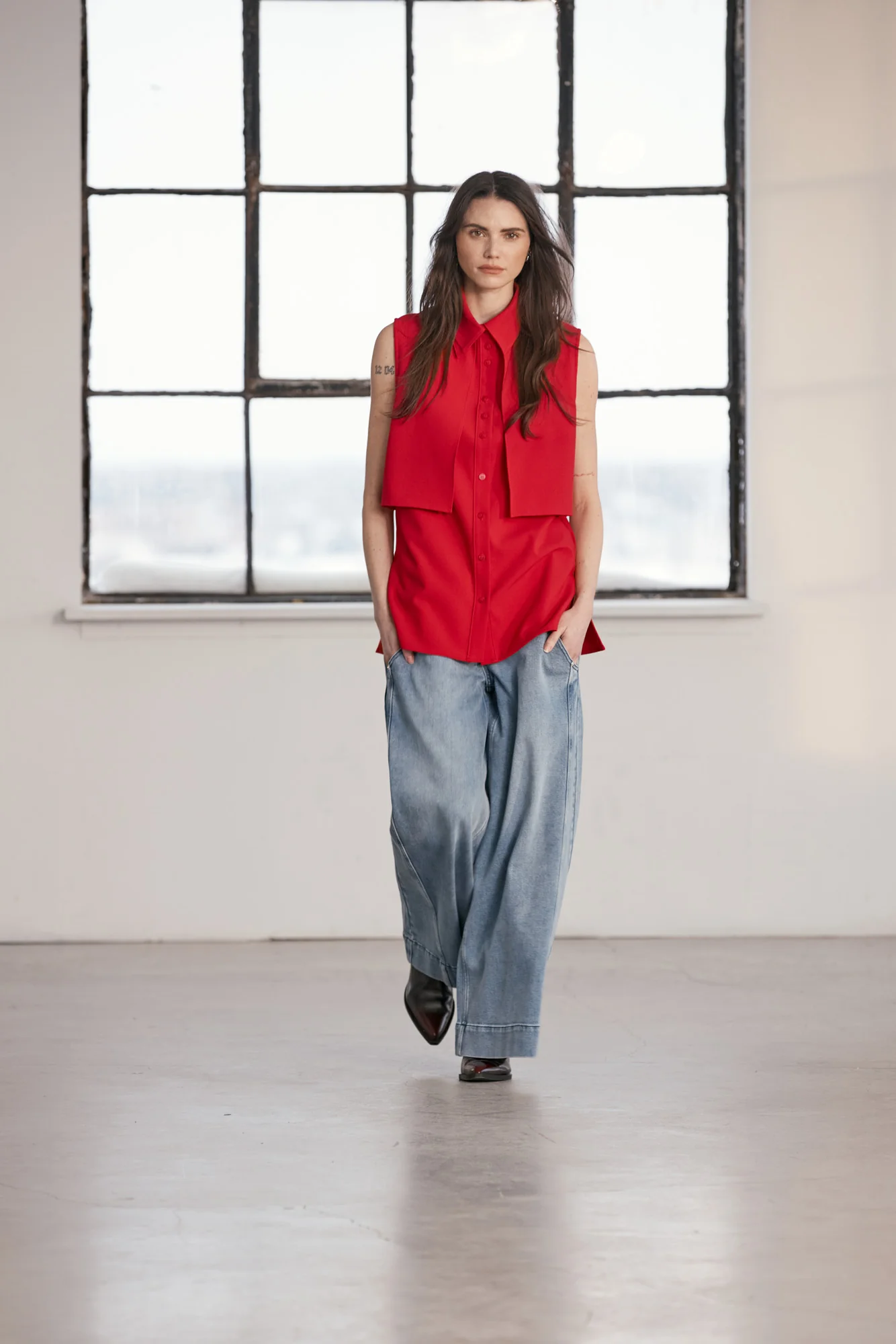 – Portez la chemise rouge sans manches boutonnée ou déboutonnée en veste sur une base essentielle.