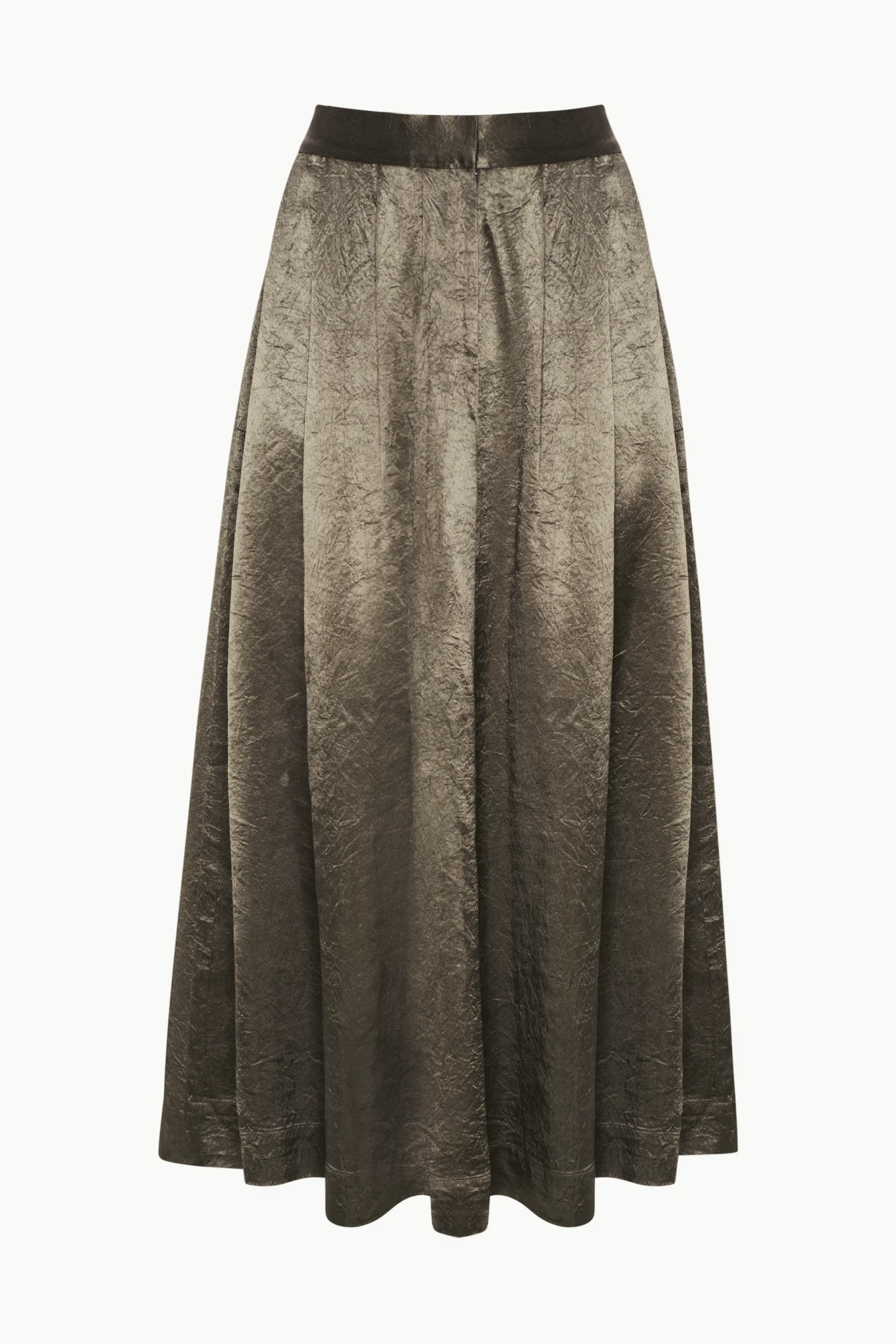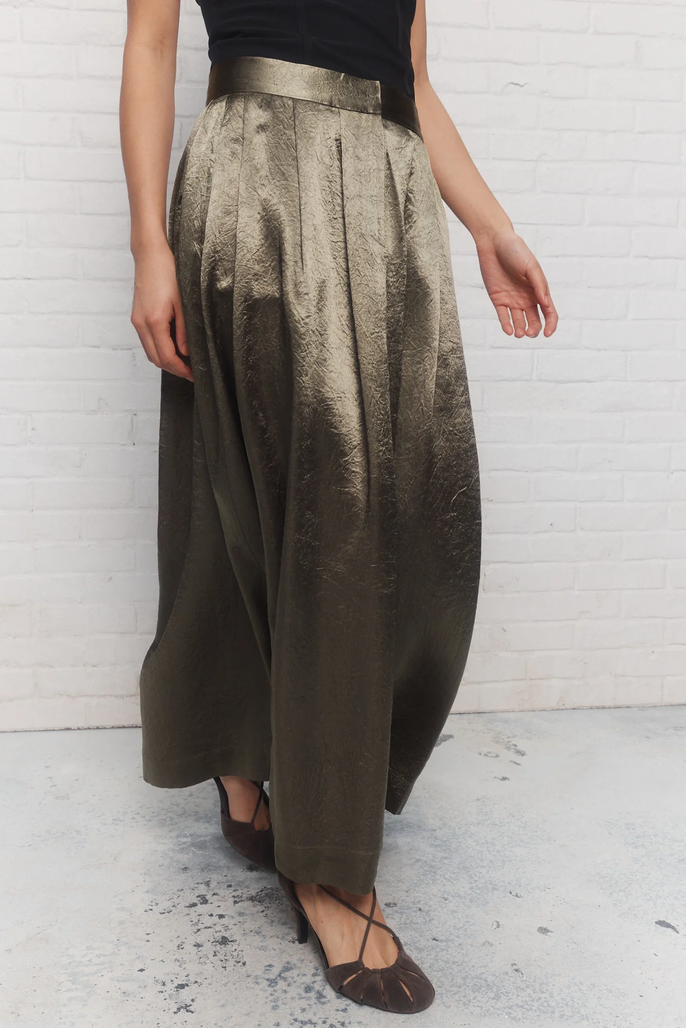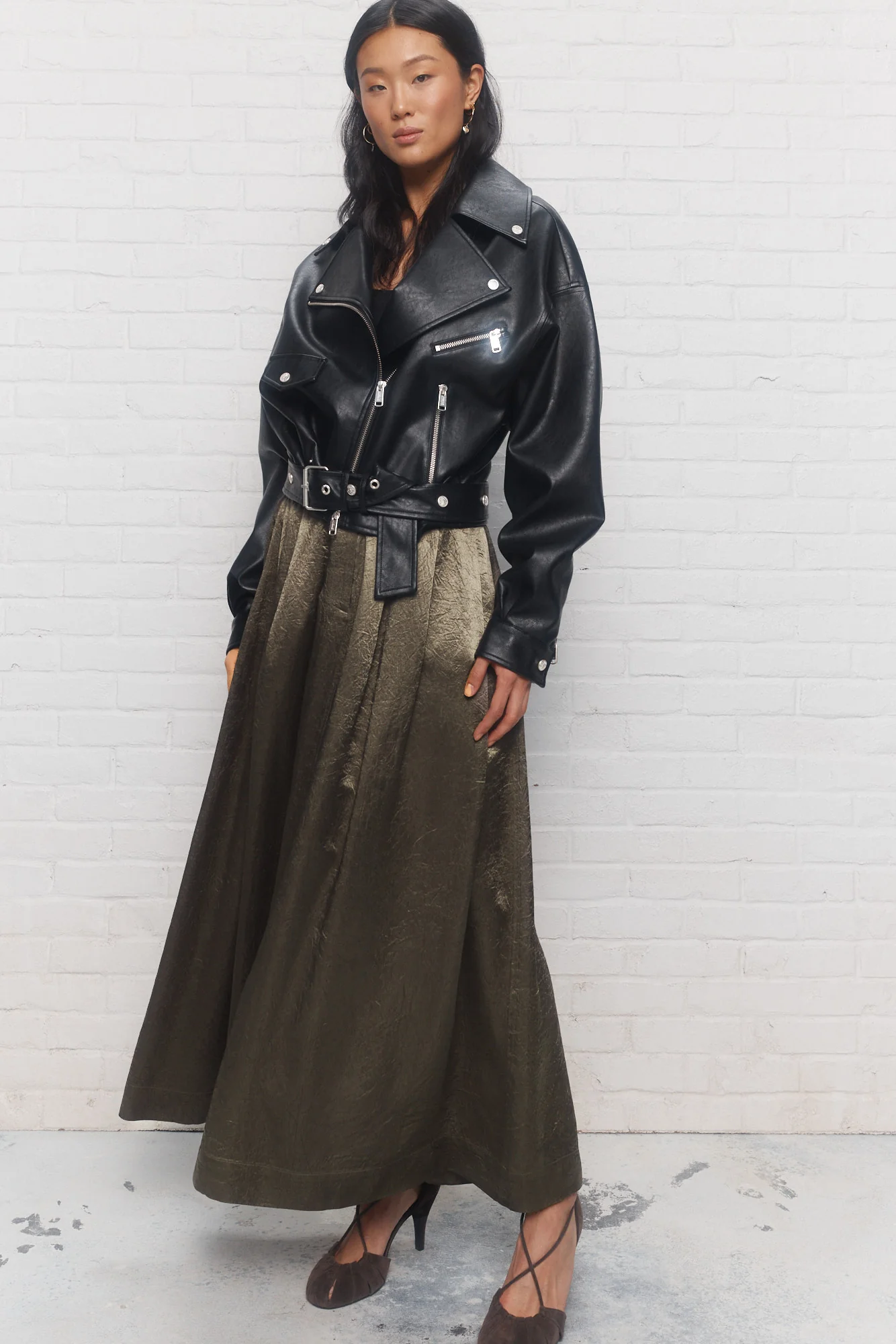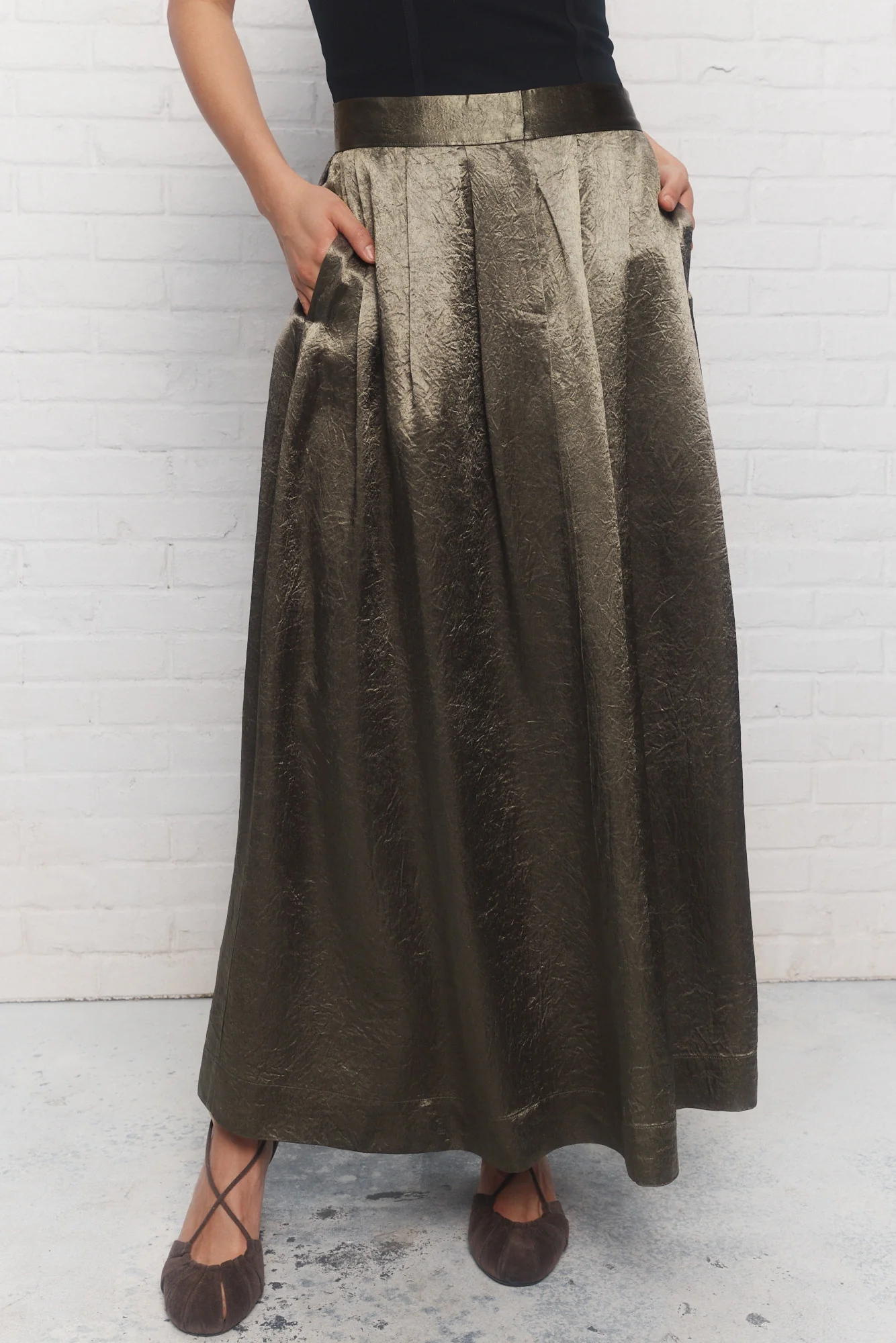 La jupe maxi verte Clarity présente une coupe ligne A créant une silhouette équilibrée et flatteuse. Les détails, du tissu satiné à la longueur cheville, de l’effet froissé aux plis plats, en font une véritable pièce design.