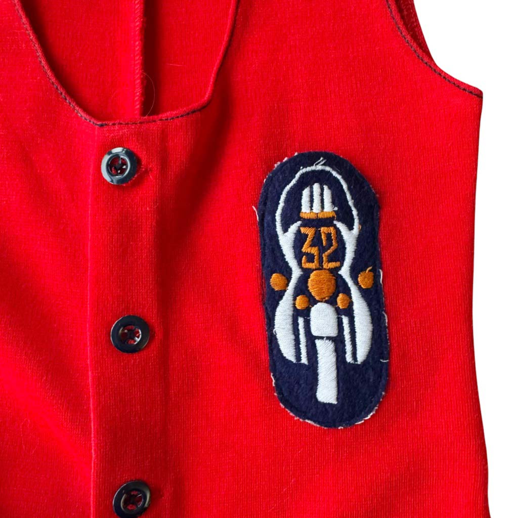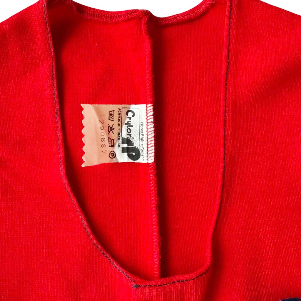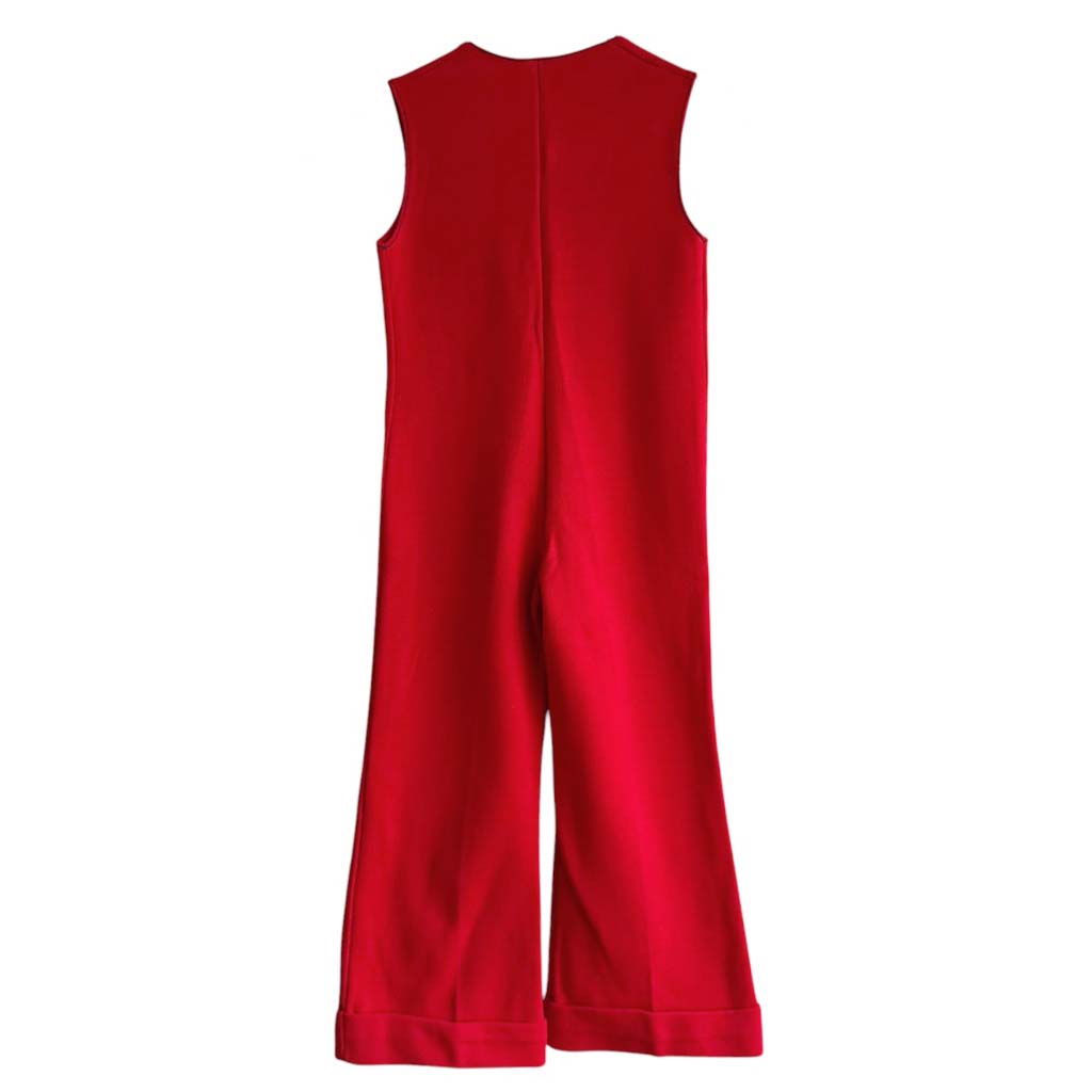 Combinaison pantalon rouge enfant 70s Elephant Paris Vintage Jersey synthétique acrylique doux et extensible, longueur avec bretelle 80 cm, longueur fourche 37cm, épaules 23 cm, poitrine 27 cm / 35 cm, taille 28 cm / 34 cm Crylor Rhône Poulenc, fabriqué en France