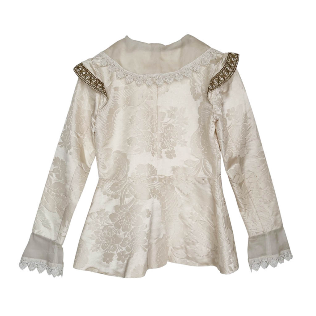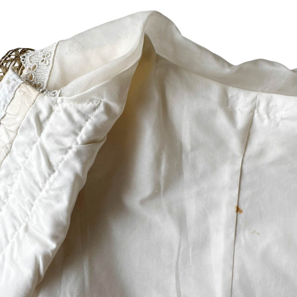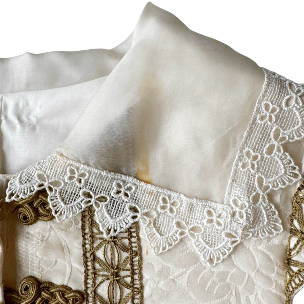 Costume théätre enfant Elephant Paris Vintage des années 50, satin orné de passementerie au fil d’or et col en organza et dentelle, quelques tâches, voir photos Mesures prise à plat, la veste : Epaules 36cm, Poitrine 39cm, Taille 35cm, Longueur dos 57cm, Pantalon : Taille haute 27cm, Longueur entrejambe depuis la taille 26cm, Longueur depuis la taille avec la ceinture 61cm, Longueur jambe depuis la fourche 35cm, Taille S 36 /38